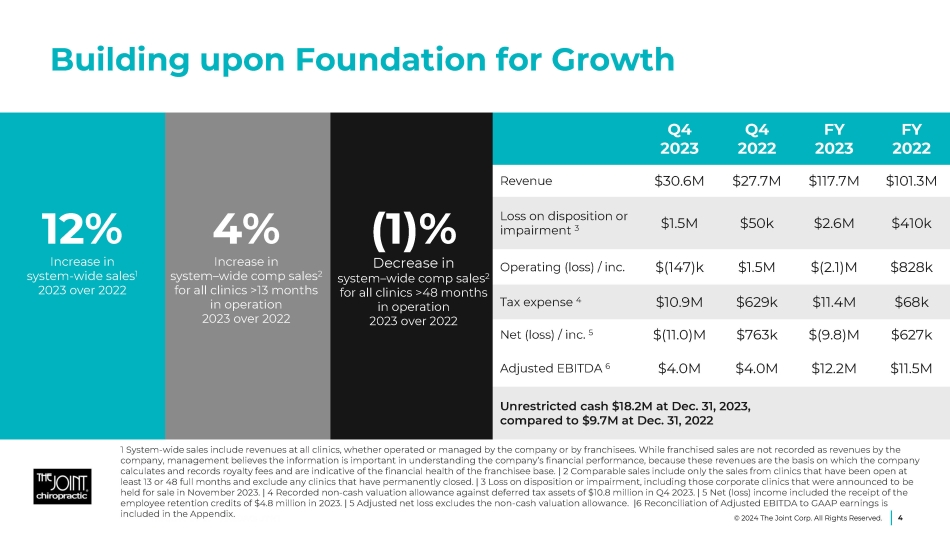 Strong Operational KPIs 1 New patient survey completed early 2024. 1.7M unique patients treated in 2023 932K new patients in 2023 13.6M adjustments in 2023 36% of new patients were new to chiropractic in 2023 1 85% system - wide gross sales from monthly memberships in 2023 Up from 1.6M in 2022 ~336K patients in 2023 had never been to a chiropractor before Compared to 845K in 2022 Up from 12.2M in 2022 Compared to 84% in 2022 3 © 2024 The Joint Corp. All Rights Reserved.