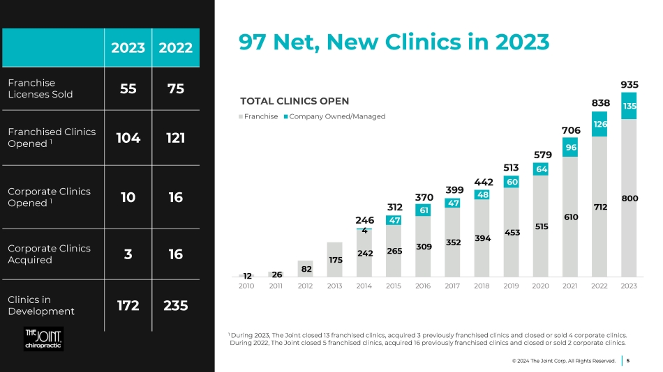 Building upon Foundation for Growth 1 System - wide sales include revenues at all clinics, whether operated or managed by the company or by franchisees. While franchised sales are not recorded as revenues by the company, management believes the information is important in understanding the company’s financial performance, because these revenues are the basis on which the company calculates and records royalty fees and are indicative of the financial health of the franchisee base. | 2 Comparable sales include only the sales from clinics that have been open at least 13 or 48 full months and exclude any clinics that have permanently closed. | 3 Loss on disposition or impairment, including those corporate clinics that were announced to be held for sale in November 2023. | 4 Recorded non - cash valuation allowance against deferred tax assets of $10.8 million in Q4 2023. | 5 Net (loss) income included the receipt of the employee retention credits of $4.8 million in 2023. | 5 Adjusted net loss excludes the non - cash valuation allowance. |6 Reconciliation of Adjusted EBITDA to GAAP earnings is included in the Appendix. 12% Increase in system - wide sales 1 2023 over 2022 4% Increase in system – wide comp sales 2 for all clinics >13 months in operation 2023 over 2022 FY 2022 FY 2023 Q4 2022 Q4 2023 $101.3M $117.7M $27.7M $30.6M Revenue $410k $2.6M $50k $1.5M (1)% Loss on disposition or impairment 3 $828k $(2.1)M $1.5M $(147)k Decrease in Operating (loss) / inc. system – wide comp sales 2 $68k $11.4M $629k $10.9M for all clinics >48 months in operation Tax expense 4 $627k $(9.8)M $763k $(11.0)M 2023 over 2022 Net (loss) / inc. 5 $11.5M $12.2M $4.0M $4.0M Adjusted EBITDA 6 Unrestricted cash $18.2M at Dec. 31, 2023, compared to $9.7M at Dec. 31, 2022 © 2024 The Joint Corp. All Rights Reserved. 4