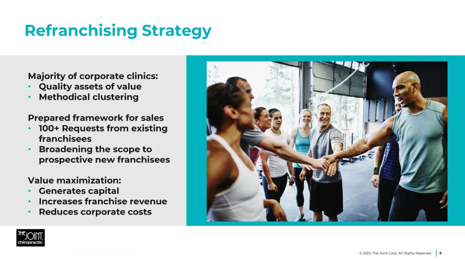 97 Net, New Clinics in 2023 2022 2023 75 55 Franchise Licenses Sold 121 104 Franchised Clinics Opened 1 16 10 Corporate Clinics Opened 1 16 3 Corporate Clinics Acquired 235 172 Clinics in Development 12 26 82 175 242 265 309 352 394 453 515 610 712 800 4 47 61 47 48 60 64 96 126 135 2010 2011 2012 2013 2014 2015 2016 2017 2018 2019 2020 2021 2022 2023 TOTAL CLINICS OPEN Franchise Company Owned/Managed 370 399 442 513 312 246 579 706 838 935 1 During 2023, The Joint closed 13 franchised clinics, acquired 3 previously franchised clinics and closed or sold 4 corporate clinics. During 2022, The Joint closed 5 franchised clinics, acquired 16 previously franchised clinics and closed or sold 2 corporate clinics. 5 © 2024 The Joint Corp. All Rights Reserved.