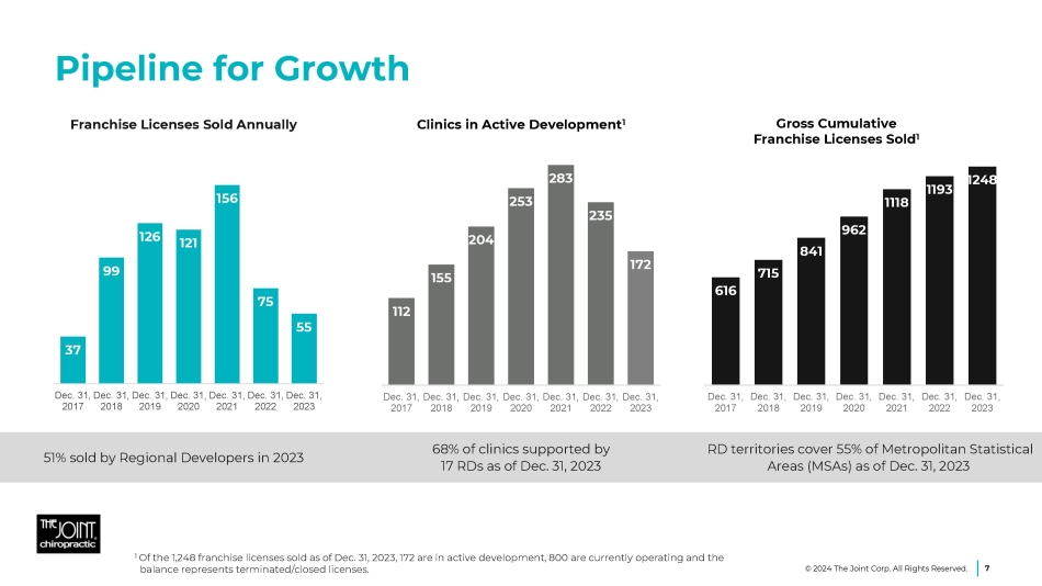 Refranchising Strategy Majority of corporate clinics: • Quality assets of value • Methodical clustering Prepared framework for sales • 100+ Requests from existing franchisees • Broadening the scope to prospective new franchisees Value maximization: • Generates capital • Increases franchise revenue • Reduces corporate costs 6 © 2024 The Joint Corp. All Rights Reserved.