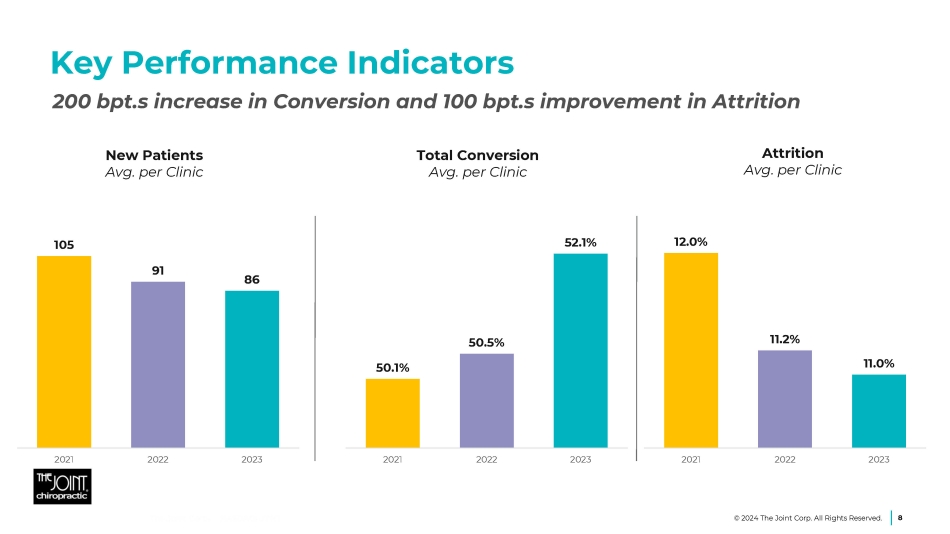 RD territories cover 55% of Metropolitan Statistical Areas (MSAs) as of Dec. 31, 2023 68% of clinics supported by 17 RDs as of Dec. 31, 2023 51% sold by Regional Developers in 2023 37 99 126 121 156 75 55 Dec. 31, Dec. 31, Dec. 31, Dec. 31, Dec. 31, Dec. 31, Dec. 31, 2017 2018 2019 2020 2021 2022 2023 616 715 841 962 1118 1193 1248 Dec. 31, Dec. 31, Dec. 31, Dec. 31, Dec. 31, Dec. 31, Dec. 31, 2017 2018 2019 2020 2021 2022 2023 112 155 204 253 283 235 172 Dec. 31, Dec. 31, Dec. 31, Dec. 31, Dec. 31, Dec. 31, Dec. 31, 2017 2018 2019 2020 2021 2022 2023 Pipeline for Growth 1 Of the 1,248 franchise licenses sold as of Dec. 31, 2023, 172 are in active development, 800 are currently operating and the balance represents terminated/closed licenses. Gross Cumulative Franchise Licenses Sold 1 Franchise Licenses Sold Annually Clinics in Active Development 1 7 © 2024 The Joint Corp. All Rights Reserved.