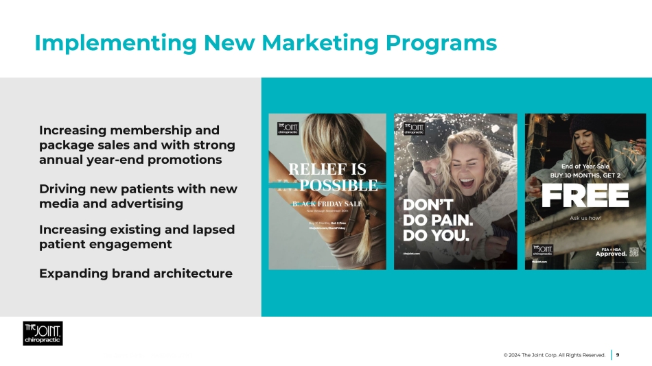 Key Performance Indicators 12.0% 11.2% 11.0% 2021 2022 2023 Attrition Avg. per Clinic 8 © 2024 The Joint Corp. All Rights Reserved. Total Conversion Avg. per Clinic 50.1% 50.5% 52.1% 2021 2022 2023 New Patients Avg. per Clinic 105 91 86 2021 2022 2023 200 bpt.s increase in Conversion and 100 bpt.s improvement in Attrition
