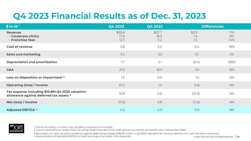 Implementing New Marketing Programs Increasing membership and package sales and with strong annual year - end promotions Driving new patients with new media and advertising Increasing existing and lapsed patient engagement Expanding brand architecture 9 © 2024 The Joint Corp. All Rights Reserved.