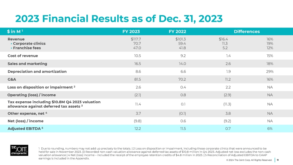 Q4 2023 Financial Results as of Dec. 31, 2023 Differences Q4 2022 Q4 2023 $ in M 1 11% 9% 14% $2.9 1.4 1.5 $27.7 16.5 11.2 $30.6 17.9 12.7 Revenue • Corporate clinics • Franchise fees 16% 0.4 2.5 2.9 Cost of revenue 2% 0.1 3.3 3.4 Sales and marketing (18)% (0.4) 2.1 1.7 Depreciation and amortization 16% 3.0 18.3 21.3 G&A NA 1.5 0.0 1.5 Loss on disposition or impairment 2 NA (1.6) 1.5 (0.1) Operating (loss) / income NA (10.3) 0.6 10.9 Tax expense including $10.8M Q4 2023 valuation allowance against deferred tax assets 3 NA (11.8) 0.8 (11.0) Net (loss) / income NA 0.0 4.0 4.0 Adjusted EBITDA 4 1 Due to rounding, numbers may not add up precisely to the totals. 2 Loss on disposition or impairment, including those corporate clinics that were announced to be held for sale in November 2023. 3 Recorded non - cash valuation allowance against deferred tax assets of $10.8 million in Q4 2023. Adjusted net loss excludes the non - cash valuation allowance. 4 Reconciliation of Adjusted EBITDA to GAAP earnings is included in the Appendix. 10 © 2024 The Joint Corp. All Rights Reserved.