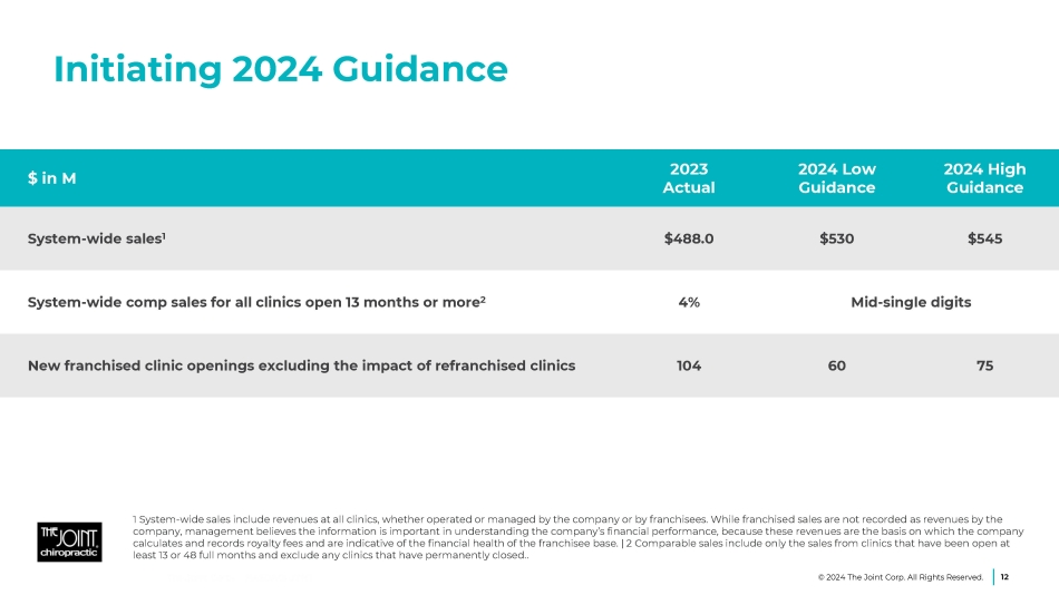 2023 Financial Results as of Dec. 31, 2023 Differences FY 2022 FY 2023 $ in M 1 16% 19% 12% $16.4 11.3 5.2 $101.3 59.4 41.8 $117.7 70.7 47.0 Revenue • Corporate clinics • Franchise fees 15% 1.4 9.2 10.5 Cost of revenue 18% 2.6 14.0 16.5 Sales and marketing 29% 1.9 6.6 8.6 Depreciation and amortization 16% 11.2 70.2 81.5 G&A NA 2.2 0.4 2.6 Loss on disposition or impairment 2 NA (2.9) 0.8 (2.1) Operating (loss) / income NA (11.3) 0.1 11.4 Tax expense including $10.8M Q4 2023 valuation allowance against deferred tax assets 3 NA 3.8 (0.1) 3.7 Other expense, net 4 NA (9.2) 0.6 (9.8) Net (loss) / income 6% 0.7 11.5 12.2 Adjusted EBITDA 5 1 Due to rounding, numbers may not add up precisely to the totals. | 2 Loss on disposition or impairment, including those corporate clinics that were announced to be held for sale in November 2023. |3 Recorded non - cash valuation allowance against deferred tax assets of $10.8 million in Q4 2023. Adjusted net loss excludes the non - cash valuation allowance | 4 Net (loss) income – included the receipt of the employee retention credits of $4.8 million in 2023. | 5 Reconciliation of Adjusted EBITDA to GAAP earnings is included in the Appendix. 11 © 2024 The Joint Corp. All Rights Reserved.