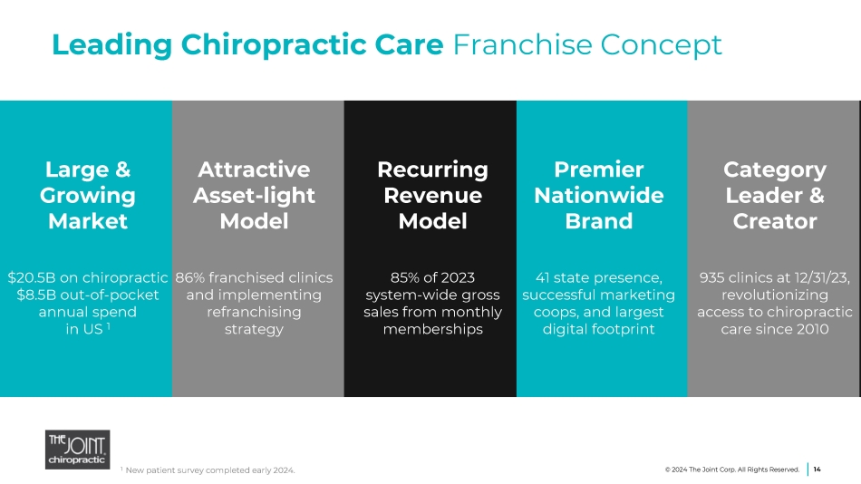 $8.1 $22.3 $70.1 $46.2 $126.9 $98.6 $165.1 $220.3 $260.0 $361.1 $435.3 $488.0 2012 2013 2014 2015 2016 2017 2018 2019 2020 2021 2022 2023 Leading Market Growth The Joint Corp. 13 - yr. CAGR 58% 1 vs. Industry 5 - yr. CAGR 5.1% 2 People will continue to seek more noninvasive, holistic ways to manage their pain. We’ll be there to treat them. 1 For the period ended Dec. 31, 2023 2 March 2023 Kentley Insights Chiropractic Care Market Research Report 13 © 2024 The Joint Corp. All Rights Reserved. System - wide Sales ($ in M) 58% CAGR 1 (2010 - 2023)