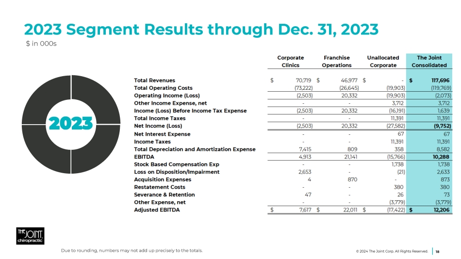 Q4 2023 Segment Results as of Dec. 31, 2023 $ in 000s 17 Q4 2023 © 2024 The Joint Corp. All Rights Reserved. Due to rounding, numbers may not add up precisely to the totals.