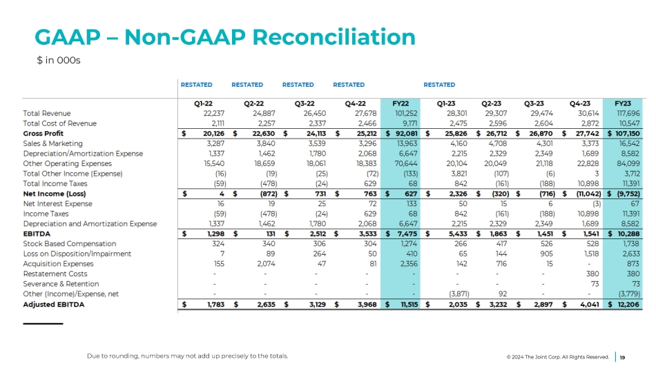 GAAP – Non - GAAP Reconciliation $ in 000s 19 © 2024 The Joint Corp. All Rights Reserved. Due to rounding, numbers may not add up precisely to the totals.