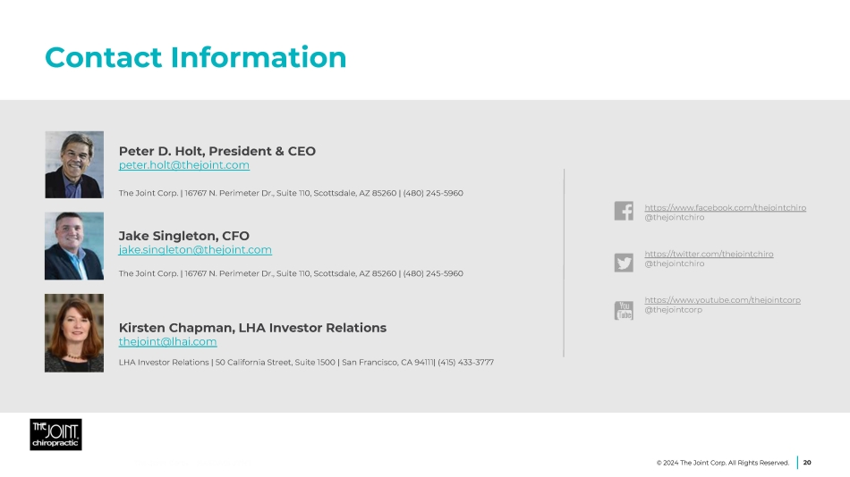 Jake Singleton, CFO jake.singleton@thejoint.com The Joint Corp. | 16767 N. Perimeter Dr., Suite 110, Scottsdale, AZ 85260 | (480) 245 - 5960 https://www.facebook.com/thejointchiro @thejointchiro https://twitter.com/thejointchiro @thejointchiro https://www.youtube.com/thejointcorp @thejointcorp Peter D. Holt, President & CEO peter.holt@thejoint.com The Joint Corp. | 16767 N. Perimeter Dr., Suite 110, Scottsdale, AZ 85260 | (480) 245 - 5960 Kirsten Chapman, LHA Investor Relations thejoint@lhai.com LHA Investor Relations | 50 California Street, Suite 1500 | San Francisco, CA 94111| (415) 433 - 3777 Contact Information 20 © 2024 The Joint Corp. All Rights Reserved.