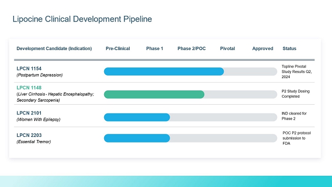 Our pipeline of clinical development candidates includes LPCN 1154 for postpartum depression (“PPD”), LPCN 2101 for epilepsy, LPCN 1148, an androgen therapy for the management of cirrhosis and LPCN 2203 for essential tremor. We will continue to explore other product development candidates targeting CNS indications with a significant unmet need. We will also continue efforts to enter into partnership arrangements for the continued development and/or marketing of LPCN 1144, LPCN 1148, and LPCN 1107 and for TRT assets (TLANDO and LPCN 1111) outside of the United States and Canada.
