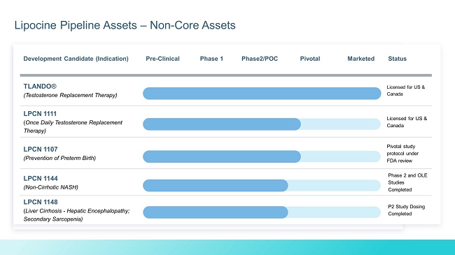 Additional clinical development pipeline candidates include: LPCN 1154 for postpartum depression (“PPD”); LPCN 2101 for epilepsy; LPCN 2203 for essential tremor; and LPCN 1148 comprising a novel prodrug of testosterone, testosterone laurate (“TL”), for the management of decompensated cirrhosis. In addition to our CNS product candidates, we have non-core assets for which we expect to seek partnerships to enable further development for which we do not plan to devote significant resources to developing in the future. These non-core assets include TLANDO for territories outside of North America, LPCN 1148 which we intend to explore partnering upon completion of the Phase 2 study, LPCN 1144, an oral prodrug of androgen receptor modulator for the treatment of non-cirrhotic non-alcoholic steatohepatitis (“NASH”) which has completed Phase 2 testing; and LPCN 1107, potentially the first oral hydroxy progesterone caproate (“HPC”) product indicated for the prevention of recurrent preterm birth (“PTB”), which has completed a dose finding clinical study in pregnant women and has been granted orphan drug designation by the FDA.