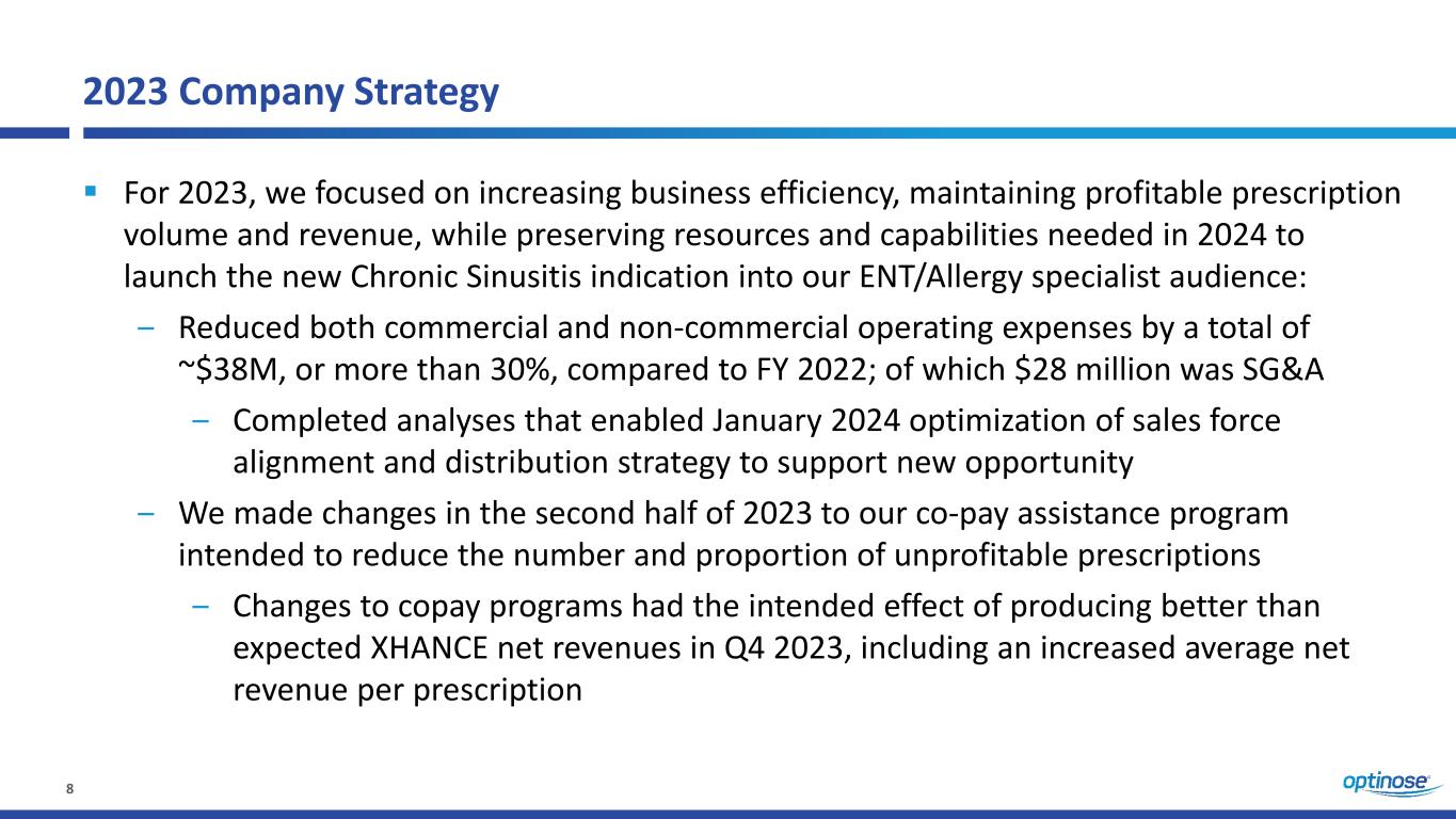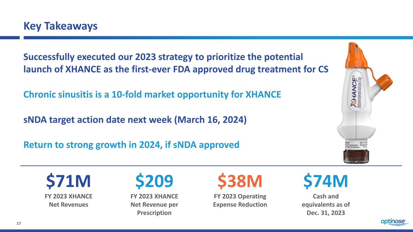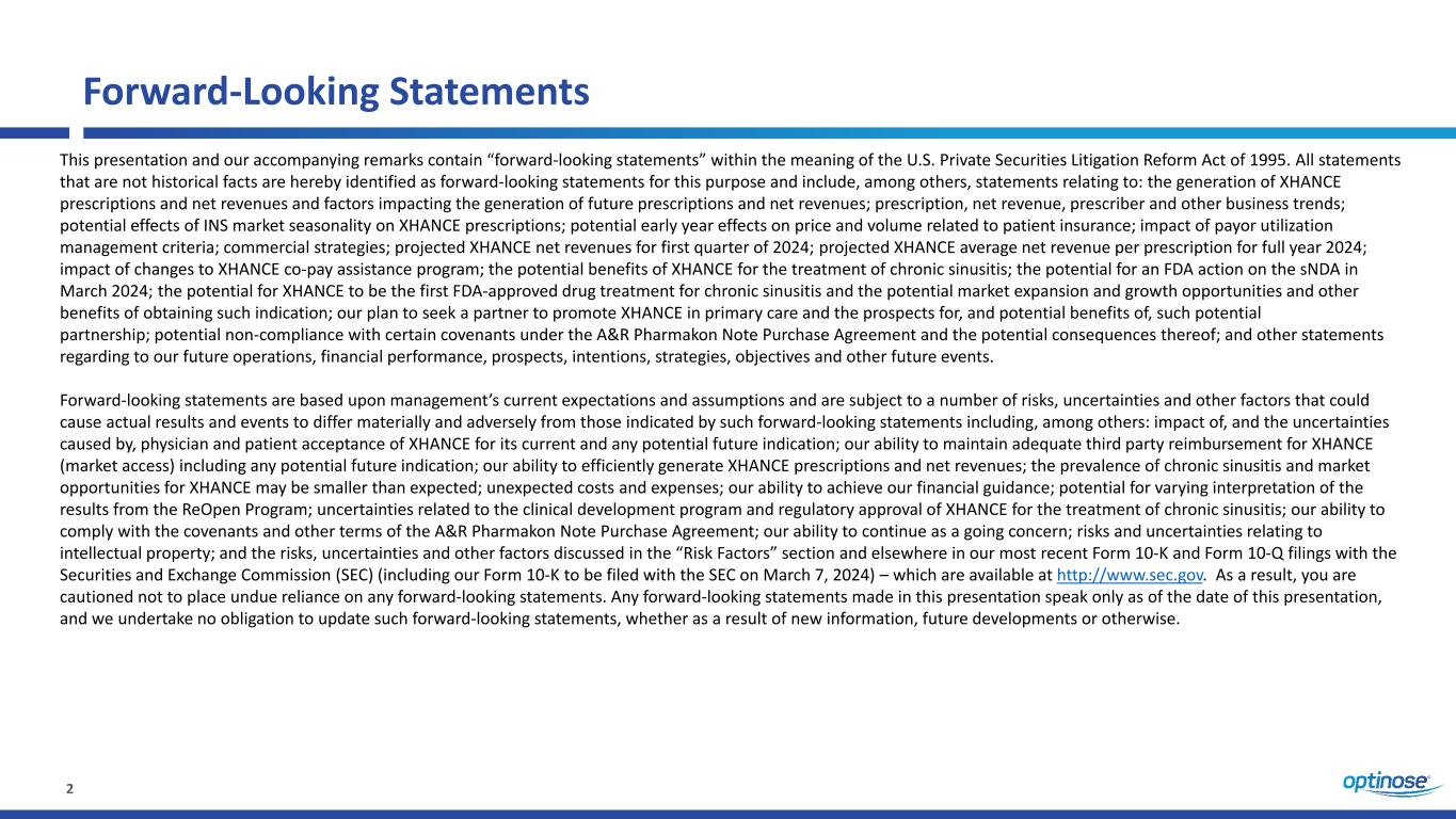 2 Forward-Looking Statements This presentation and our accompanying remarks contain “forward-looking statements” within the meaning of the U.S. Private Securities Litigation Reform Act of 1995. All statements that are not historical facts are hereby identified as forward-looking statements for this purpose and include, among others, statements relating to: the generation of XHANCE prescriptions and net revenues and factors impacting the generation of future prescriptions and net revenues; prescription, net revenue, prescriber and other business trends; potential effects of INS market seasonality on XHANCE prescriptions; potential early year effects on price and volume related to patient insurance; impact of payor utilization management criteria; commercial strategies; projected XHANCE net revenues for first quarter of 2024; projected XHANCE average net revenue per prescription for full year 2024; impact of changes to XHANCE co-pay assistance program; the potential benefits of XHANCE for the treatment of chronic sinusitis; the potential for an FDA action on the sNDA in March 2024; the potential for XHANCE to be the first FDA-approved drug treatment for chronic sinusitis and the potential market expansion and growth opportunities and other benefits of obtaining such indication; our plan to seek a partner to promote XHANCE in primary care and the prospects for, and potential benefits of, such potential partnership; potential non-compliance with certain covenants under the A&R Pharmakon Note Purchase Agreement and the potential consequences thereof; and other statements regarding to our future operations, financial performance, prospects, intentions, strategies, objectives and other future events. Forward-looking statements are based upon management’s current expectations and assumptions and are subject to a number of risks, uncertainties and other factors that could cause actual results and events to differ materially and adversely from those indicated by such forward-looking statements including, among others: impact of, and the uncertainties caused by, physician and patient acceptance of XHANCE for its current and any potential future indication; our ability to maintain adequate third party reimbursement for XHANCE (market access) including any potential future indication; our ability to efficiently generate XHANCE prescriptions and net revenues; the prevalence of chronic sinusitis and market opportunities for XHANCE may be smaller than expected; unexpected costs and expenses; our ability to achieve our financial guidance; potential for varying interpretation of the results from the ReOpen Program; uncertainties related to the clinical development program and regulatory approval of XHANCE for the treatment of chronic sinusitis; our ability to comply with the covenants and other terms of the A&R Pharmakon Note Purchase Agreement; our ability to continue as a going concern; risks and uncertainties relating to intellectual property; and the risks, uncertainties and other factors discussed in the “Risk Factors” section and elsewhere in our most recent Form 10-K and Form 10-Q filings with the Securities and Exchange Commission (SEC) (including our Form 10-K to be filed with the SEC on March 7, 2024) – which are available at http://www.sec.gov. As a result, you are cautioned not to place undue reliance on any forward-looking statements. Any forward-looking statements made in this presentation speak only as of the date of this presentation, and we undertake no obligation to update such forward-looking statements, whether as a result of new information, future developments or otherwise.