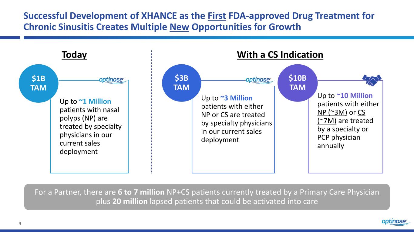 3 Key Takeaways Chronic sinusitis is a 10-fold market opportunity for XHANCE Successfully executed our 2023 strategy to prioritize the potential launch of XHANCE as the first-ever FDA approved drug treatment for CS sNDA target action date next week (March 16, 2024) Return to strong growth in 2024, if sNDA approved $74M Cash and equivalents as of Dec. 31, 2023 $71M FY 2023 XHANCE Net Revenues $38M FY 2023 Operating Expense Reduction $209 FY 2023 XHANCE Net Revenue per Prescription
