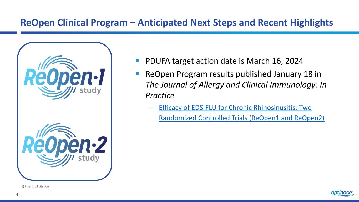 6 ReOpen Clinical Program – Anticipated Next Steps and Recent Highlights PDUFA target action date is March 16, 2024 ReOpen Program results published January 18 in The Journal of Allergy and Clinical Immunology: In Practice – Efficacy of EDS-FLU for Chronic Rhinosinusitis: Two Randomized Controlled Trials (ReOpen1 and ReOpen2) (1) Insert full citation