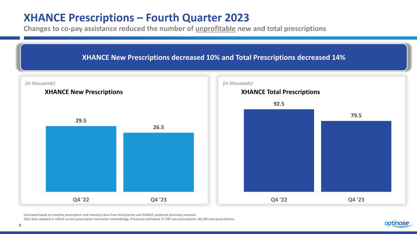 8 2023 Company Strategy For 2023, we focused on increasing business efficiency, maintaining profitable prescription volume and revenue, while preserving resources and capabilities needed in 2024 to launch the new Chronic Sinusitis indication into our ENT/Allergy specialist audience: ‒ Reduced both commercial and non-commercial operating expenses by a total of ~$38M, or more than 30%, compared to FY 2022; of which $28 million was SG&A ‒ Completed analyses that enabled January 2024 optimization of sales force alignment and distribution strategy to support new opportunity ‒ We made changes in the second half of 2023 to our co-pay assistance program intended to reduce the number and proportion of unprofitable prescriptions ‒ Changes to copay programs had the intended effect of producing better than expected XHANCE net revenues in Q4 2023, including an increased average net revenue per prescription