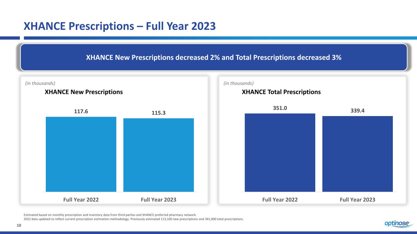 9 XHANCE Prescriptions – Fourth Quarter 2023 Changes to co-pay assistance reduced the number of unprofitable new and total prescriptions XHANCE New Prescriptions decreased 10% and Total Prescriptions decreased 14% 29.5 26.5 Q4 '22 Q4 '23 (in thousands) XHANCE New Prescriptions 92.5 79.5 Q4 '22 Q4 '23 XHANCE Total Prescriptions (in thousands) Estimated based on monthly prescription and inventory data from third parties and XHANCE preferred pharmacy network. 2022 data updated to reflect current prescription estimation methodology. Previously estimated 27,700 new prescriptions, 86,200 total prescriptions.