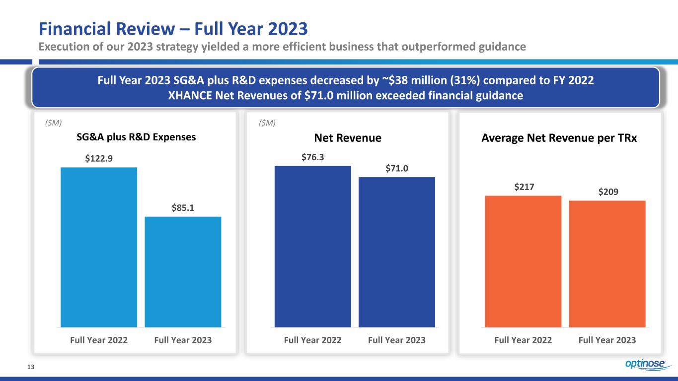12 Financial Review – Fourth Quarter 2023 Changes to co-pay assistance drove an 11% increase in revenue per prescription SG&A plus R&D expenses decreased by ~$6 million from Q4 2022 to Q4 2023 and Q4 2023 XHANCE Net Revenues of $19.9 million exceed financial guidance $26.2 $20.2 Q4 '22 Q4 '23 ($M) SG&A plus R&D Expenses $20.9 $19.9 Q4 '22 Q4 '23 ($M) Net Revenue Average Net Revenue per TRx $226 $250 Q4 '22 Q4 '23