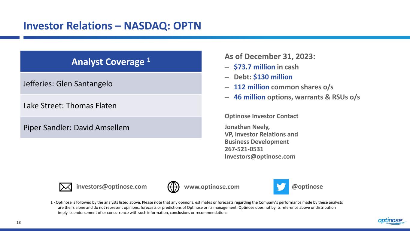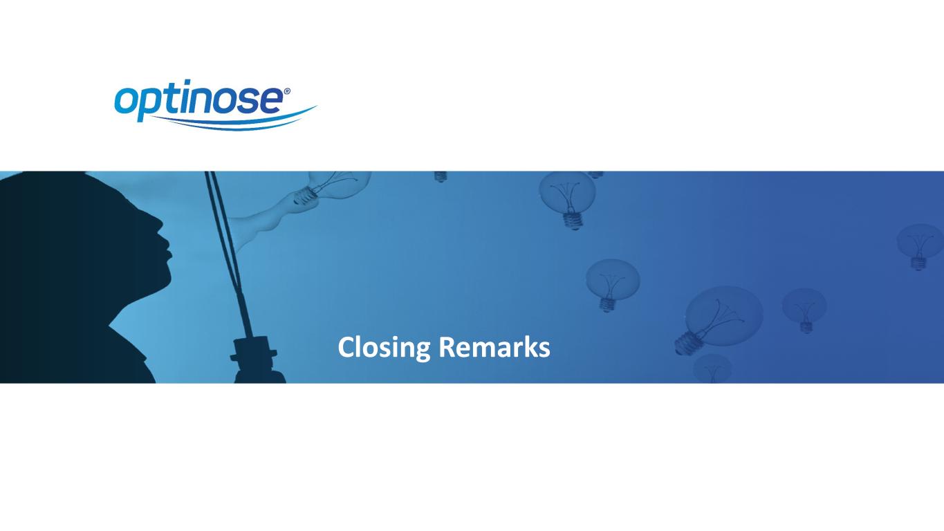 18 Investor Relations – NASDAQ: OPTN Optinose Investor Contact Jonathan Neely, VP, Investor Relations and Business Development 267-521-0531 Investors@optinose.com As of December 31, 2023: – $73.7 million in cash – Debt: $130 million – 112 million common shares o/s – 46 million options, warrants & RSUs o/s 1 - Optinose is followed by the analysts listed above. Please note that any opinions, estimates or forecasts regarding the Company’s performance made by these analysts are theirs alone and do not represent opinions, forecasts or predictions of Optinose or its management. Optinose does not by its reference above or distribution imply its endorsement of or concurrence with such information, conclusions or recommendations. investors@optinose.com www.optinose.com @optinose Analyst Coverage 1 Jefferies: Glen Santangelo Lake Street: Thomas Flaten Piper Sandler: David Amsellem