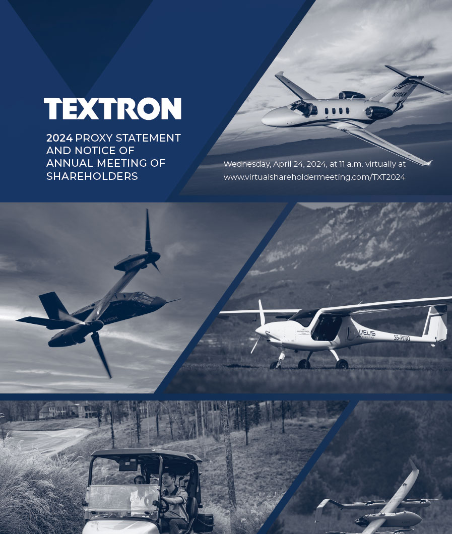 This proxy statement, which is first being made available to shareholders on or about March 7, 2024, is furnished in connection with the solicitation by the Board of Directors of Textron Inc. of proxies to be voted at the annual meeting of shareholders to be held on April 24, 2024, at 11:00 a.m. Eastern Time virtually via a live audio webcast and at any adjournments or postponements thereof. Shareholders will be able to attend the Annual Meeting, vote their shares and submit questions during the meeting at www.virtualshareholdermeeting.com/TXT2024.