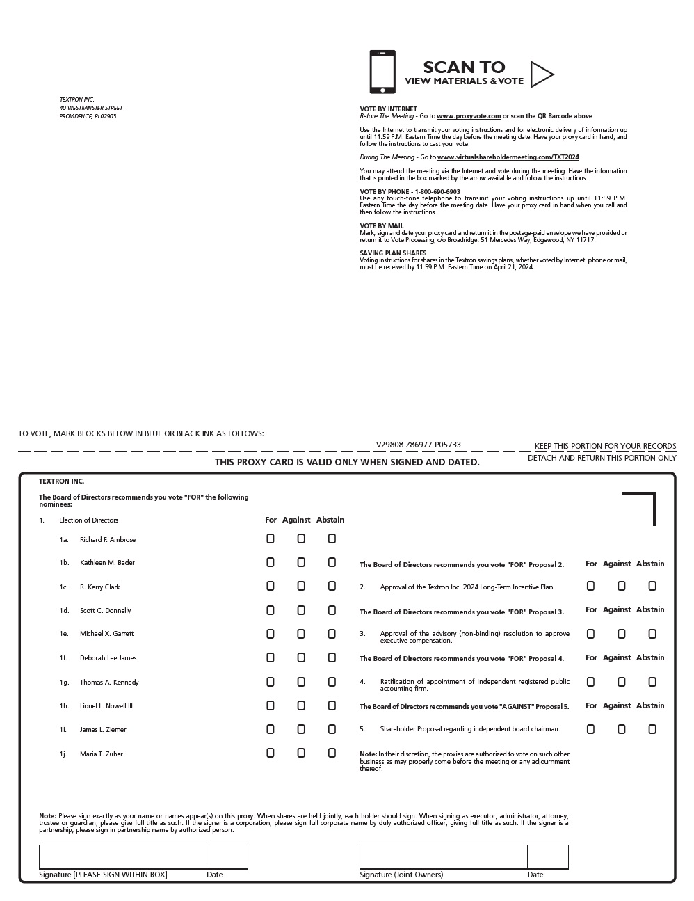 Signature [PLEASE SIGN WITHIN BOX] Date Signature (Joint Owners) Date TO VOTE, MARK BLOCKS BELOW IN BLUE OR BLACK INK AS FOLLOWS: KEEP THIS PORTION FOR YOUR RECORDS THIS PROXY CARD IS VALID ONLY WHEN SIGNED AND DATED. DETACH AND RETURN THIS PORTION ONLY TEXTRON INC. V29808-Z86977-P05733 For Against Abstain For Against Abstain For Against Abstain For Against Abstain For Against Abstain TEXTRON INC. 40 WESTMINSTER STREET PROVIDENCE, RI 02903 1d. Scott C. Donnelly 1e. Michael X. Garrett 1b. Kathleen M. Bader 1a. Richard F. Ambrose 1c. R. Kerry Clark 1i. James L. Ziemer 1f. Deborah Lee James 1g. Thomas A. Kennedy 1j. Maria T. Zuber 1h. Lionel L. Nowell III 1. Election of Directors The Board of Directors recommends you vote "FOR" the following nominees: Note: In their discretion, the proxies are authorized to vote on such other business as may properly come before the meeting or any adjournment thereof. Note: Please sign exactly as your name or names appear(s) on this proxy. When shares are held jointly, each holder should sign. When signing as executor, administrator, attorney, trustee or guardian, please give full title as such. If the signer is a corporation, please sign full corporate name by duly authorized officer, giving full title as such. If the signer is a partnership, please sign in partnership name by authorized person. The Board of Directors recommends you vote "FOR" Proposal 2. The Board of Directors recommends you vote "FOR" Proposal 4. The Board of Directors recommends you vote "FOR" Proposal 3. The Board of Directors recommends you vote "AGAINST" Proposal 5. 2. Approval of the Textron Inc. 2024 Long-Term Incentive Plan. 3. Approval of the advisory (non-binding) resolution to approve executive compensation. 4. Ratification of appointment of independent registered public accounting firm. 5. Shareholder Proposal regarding independent board chairman. VOTE BY INTERNET Before The Meeting - Go to www.proxyvote.com or scan the QR Barcode above Use the Internet to transmit your voting instructions and for electronic delivery of information up until 11:59 P.M. Eastern Time the day before the meeting date. Have your proxy card in hand, and follow the instructions to cast your vote. During The Meeting - Go to www.virtualshareholdermeeting.com/TXT2024 You may attend the meeting via the Internet and vote during the meeting. Have the information that is printed in the box marked by the arrow available and follow the instructions. VOTE BY PHONE - 1-800-690-6903 Use any touch-tone telephone to transmit your voting instructions up until 11:59 P.M. Eastern Time the day before the meeting date. Have your proxy card in hand when you call and then follow the instructions. VOTE BY MAIL Mark, sign and date your proxy card and return it in the postage-paid envelope we have provided or return it to Vote Processing, c/o Broadridge, 51 Mercedes Way, Edgewood, NY 11717. SAVING PLAN SHARES Voting instructions for shares in the Textron savings plans, whether voted by Internet, phone or mail, must be received by 11:59 P.M. Eastern Time on April 21, 2024. SCAN TO VIEW MATERIALS & VOTE w