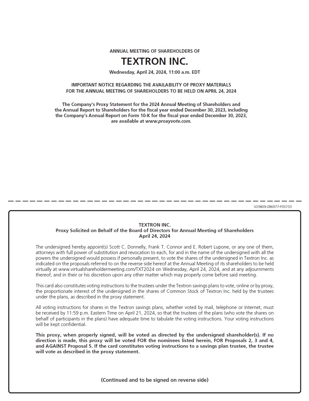 V29809-Z86977-P05733 IMPORTANT NOTICE REGARDING THE AVAILABILITY OF PROXY MATERIALS FOR THE ANNUAL MEETING OF SHAREHOLDERS TO BE HELD ON APRIL 24, 2024 The Company's Proxy Statement for the 2024 Annual Meeting of Shareholders and the Annual Report to Shareholders for the fiscal year ended December 30, 2023, including the Company's Annual Report on Form 10-K for the fiscal year ended December 30, 2023, are available at www.proxyvote.com. ANNUAL MEETING OF SHAREHOLDERS OF TEXTRON INC. Wednesday, April 24, 2024, 11:00 a.m. EDT TEXTRON INC. Proxy Solicited on Behalf of the Board of Directors for Annual Meeting of Shareholders April 24, 2024 The undersigned hereby appoint(s) Scott C. Donnelly, Frank T. Connor and E. Robert Lupone, or any one of them, attorneys with full power of substitution and revocation to each, for and in the name of the undersigned with all the powers the undersigned would possess if personally present, to vote the shares of the undersigned in Textron Inc. as indicated on the proposals referred to on the reverse side hereof at the Annual Meeting of its shareholders to be held virtually at www.virtualshareholdermeeting.com/TXT2024 on Wednesday, April 24, 2024, and at any adjournments thereof, and in their or his discretion upon any other matter which may properly come before said meeting. This card also constitutes voting instructions to the trustees under the Textron savings plans to vote, online or by proxy, the proportionate interest of the undersigned in the shares of Common Stock of Textron Inc. held by the trustees under the plans, as described in the proxy statement. All voting instructions for shares in the Textron savings plans, whether voted by mail, telephone or Internet, must be received by 11:59 p.m. Eastern Time on April 21, 2024, so that the trustees of the plans (who vote the shares on behalf of participants in the plans) have adequate time to tabulate the voting instructions. Your voting instructions will be kept confidential. This proxy, when properly signed, will be voted as directed by the undersigned shareholder(s). If no direction is made, this proxy will be voted FOR the nominees listed herein, FOR Proposals 2, 3 and 4, and AGAINST Proposal 5. If the card constitutes voting instructions to a savings plan trustee, the trustee will vote as described in the proxy statement. (Continued and to be signed on reverse side)