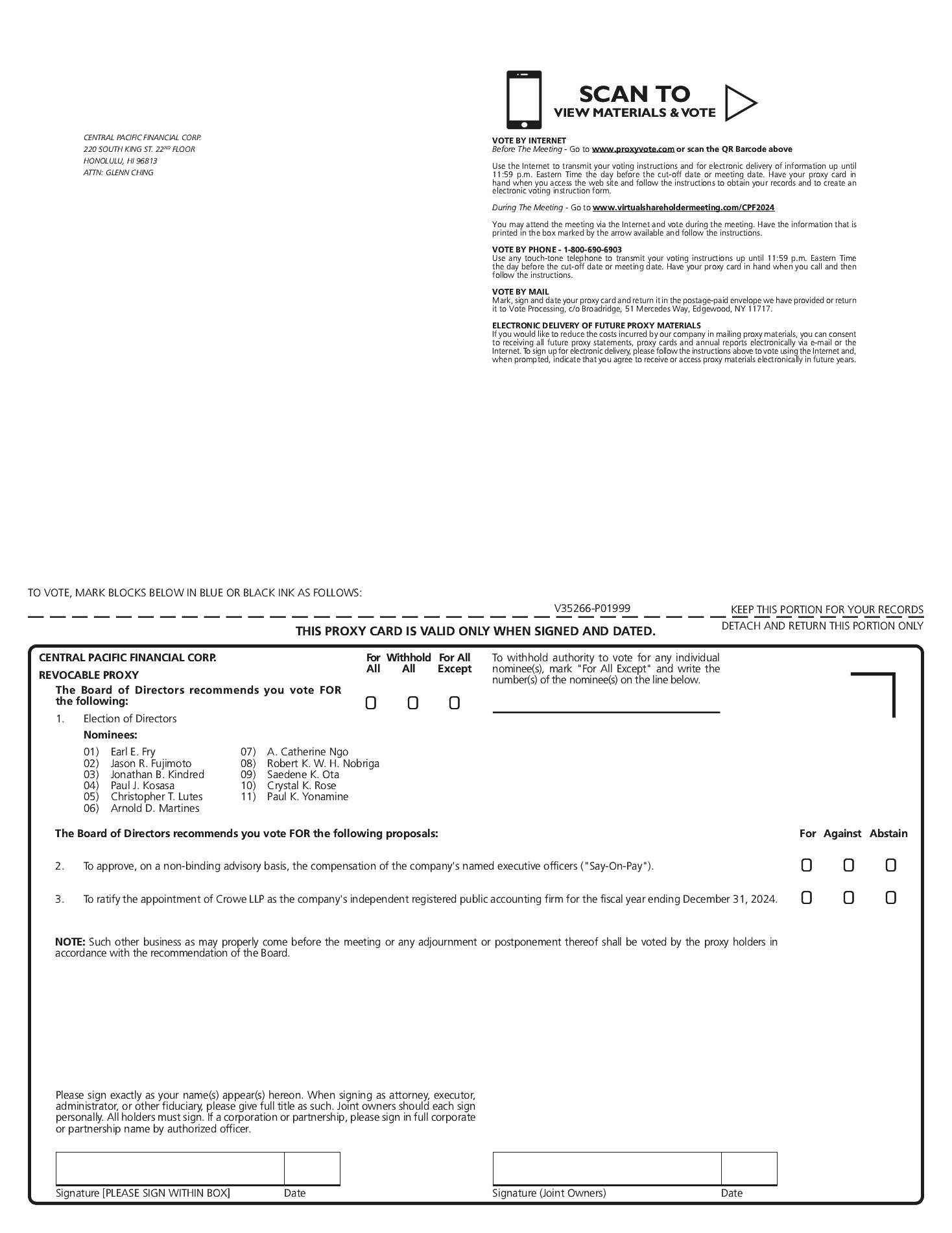 How to Participate in the Meeting | | | Visit www.virtualshareholdermeeting.com/CPF2024. Enter the 16-digit control number included on your Notice Regarding the Availability of Proxy Materials, proxy card, or voting instructions that accompanied your proxy materials. You may begin to log into the meeting platform beginning at 10:45 a.m. Hawaii time on April 25, 2024. The meeting will begin promptly at 11:00 a.m. Hawaii time. |