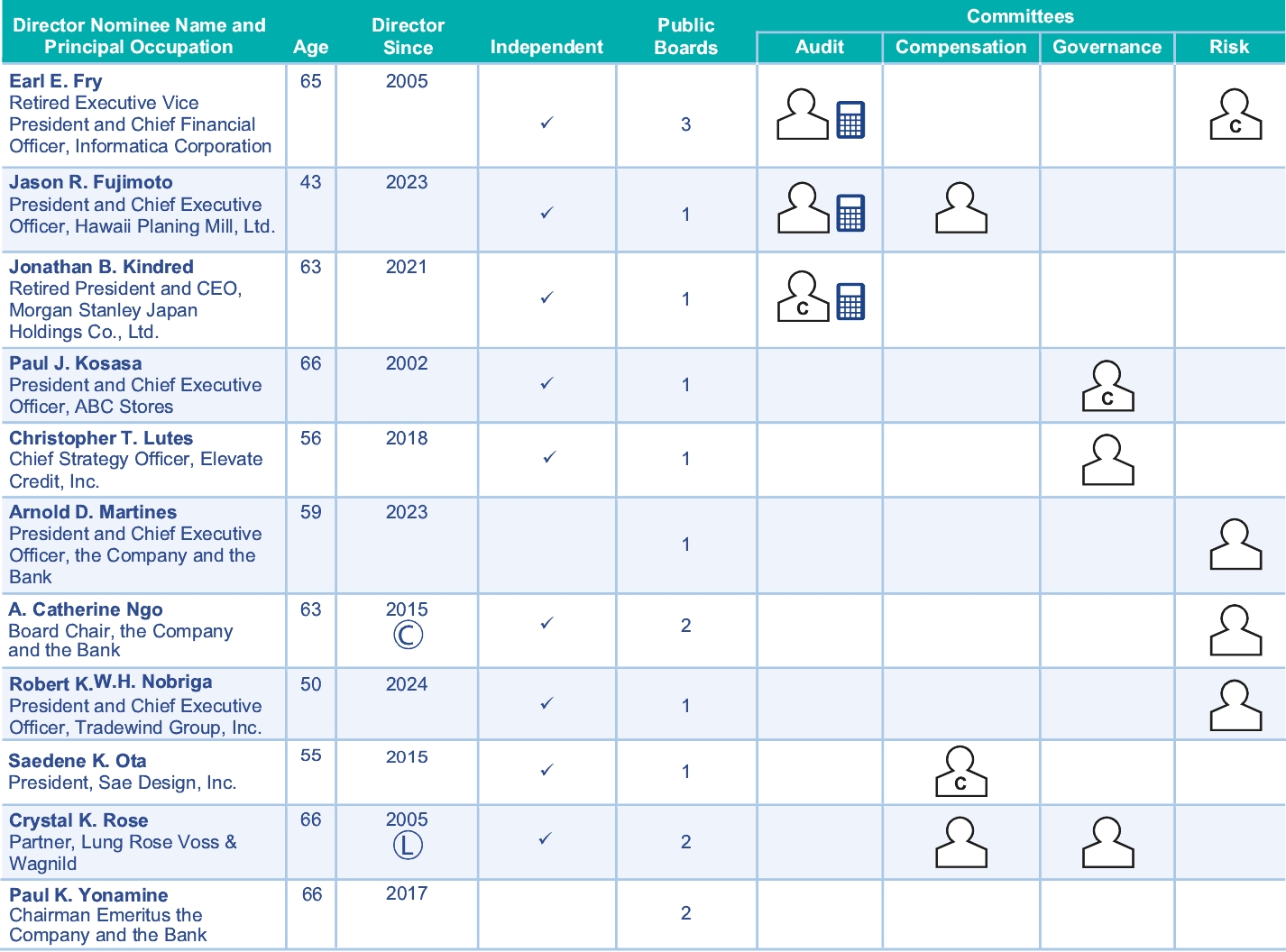 ![]() Lead Independent Director DIRECTOR SINCE: 2005 AGE: 66 COMMITTEE(S): • Compensation • Governance | | | Ms. Rose is a name partner in the law firm of Lung Rose Voss & Wagnild and has been actively practicing law for 42 years, specializing in the areas of real estate, trust and commercial litigation, commercial real estate transactions, trusts and estates, and construction law. Ms. Rose has been a director of Hawaiian Holdings, Inc. (a publicly traded company listed on NASDAQ, and the parent company of Hawaiian Airlines, Inc.) since June 2006, and serves as Chair of the Compensation Committee, and is a member of the Governance and Nominating Committee of its Board of Directors. Ms. Rose also brings a wealth of legal and real estate knowledge and experience to the Company’s Board and Bank’s Board, and her professional, leadership, and business skills and expertise are well-suited to her serving since June 1, 2014, as the Company’s and the Bank’s Lead Independent Director, and before that, from April 20, 2011 through May 31, 2014, serving as the Company’s and Bank’s Board Chair, and in providing guidance with respect to the Company’s and the Bank’s strategic issues, overall business plans and legal matters. BACKGROUND: • Partner, Lung Rose Voss & Wagnild (1989—present) (law) • Lead Independent Director, the Company and the Bank (6/2014—present) • Member, Rose Consulting LLC (2021—present) (consulting) OTHER PUBLIC COMPANY BOARD SERVICE: • Director, Compensation Committee Chair, Governance and Nominating Committee member, Hawaiian Holdings, Inc. (6/2006—present) (NASDAQ: HA) OTHER DIRECTORSHIPS AND POSITIONS: • Kamehameha Schools Board of Trustees, Trustee (Kamehameha Schools has an estimated endowment of $14.6 billion in financial assets and real estate as of 6/2023) • Bishop Holdings Corporation, Director • Catholic Charities Hawaii, Board of Advisors • Charles Reed Bishop Trust, Trustee • The Nature Conservancy (Hawaii and Palmyra), Ihupani Advisory Council • Gentry Homes, Ltd, Director EDUCATION: • Bachelor of Science, Psychology and Sociology, Willamette University • J.D., University of California, Hastings College of Law SKILLS AND EXPERIENCE: • Hawaii Business • Public Company • Real Estate • Regulatory/Legal |