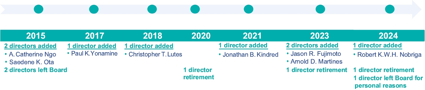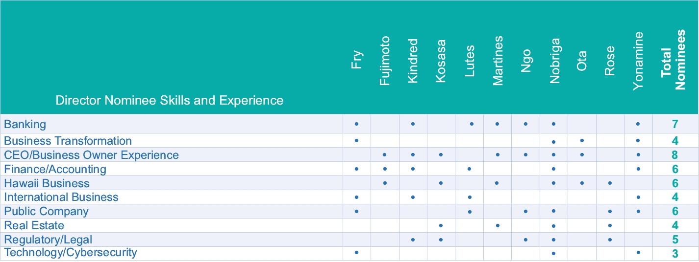 ![]() DIRECTOR SINCE: 2023 AGE: 43 COMMITTEE(S): • Audit • Compensation | | | Mr. Fujimoto is currently President and Chief Executive Officer of Hawaii Planing Mill, Ltd., doing business as HPM Building Supply (a building supply company headquartered on Hawaii Island with operations on all four major islands and in business for over 100 years), and has served in that capacity since January 2019. Mr. Fujimoto served as Chief Operating Officer of Hawaii Planing Mill, Ltd. from January 2013 to December 2018. Mr. Fujimoto served as Chief Financial Officer of Hawaii Planing Mill, Ltd. from January 2011 to December 2012. Mr. Fujimoto has served on the Board of Directors and Audit Committee of Hawaii Planing Mill, Ltd. since March 2009. Mr. Fujimoto resides on the Island of Hawaii and adds to the Company’s and Bank’s Boards of Directors audit and financial experience, as well as geographic diversity. BACKGROUND: • President and Chief Executive Officer, Hawaii Planing Mill, Ltd. (1/2019—present) (building supplies) • Chief Operating Officer, Hawaii Planing Mill, Ltd. (1/2013—12/2018) (building supplies) OTHER DIRECTORSHIPS AND POSITIONS: • Holomua Collective, Director • Kohala Institute dba ‘Iole Stewardship Center, former Chair • Hawaii Public Television Foundation dba PBS Hawaii, former Chair • Hawaii Executive Collaborative, Member • Hawaii Business Roundtable, Member • University of Hawaii at Hilo Chancellor’s Community Advisory Board, Member • U.S. Army Garrison Pohakuloa Training Area Commander’s Advisory Council, Member • Hardware Group Association, Member • DoItBest Eagles Conference, Member • BIG Group, Member EDUCATION: • Bachelor of Science, Economics, The Wharton School of the University of Pennsylvania, concentrating in Corporate Finance and Strategic Management and minor in Psychology from the University of Pennsylvania College of Arts and Sciences SKILLS AND EXPERIENCE: • CEO/Business Owner • Finance/Accounting • Hawaii Business |