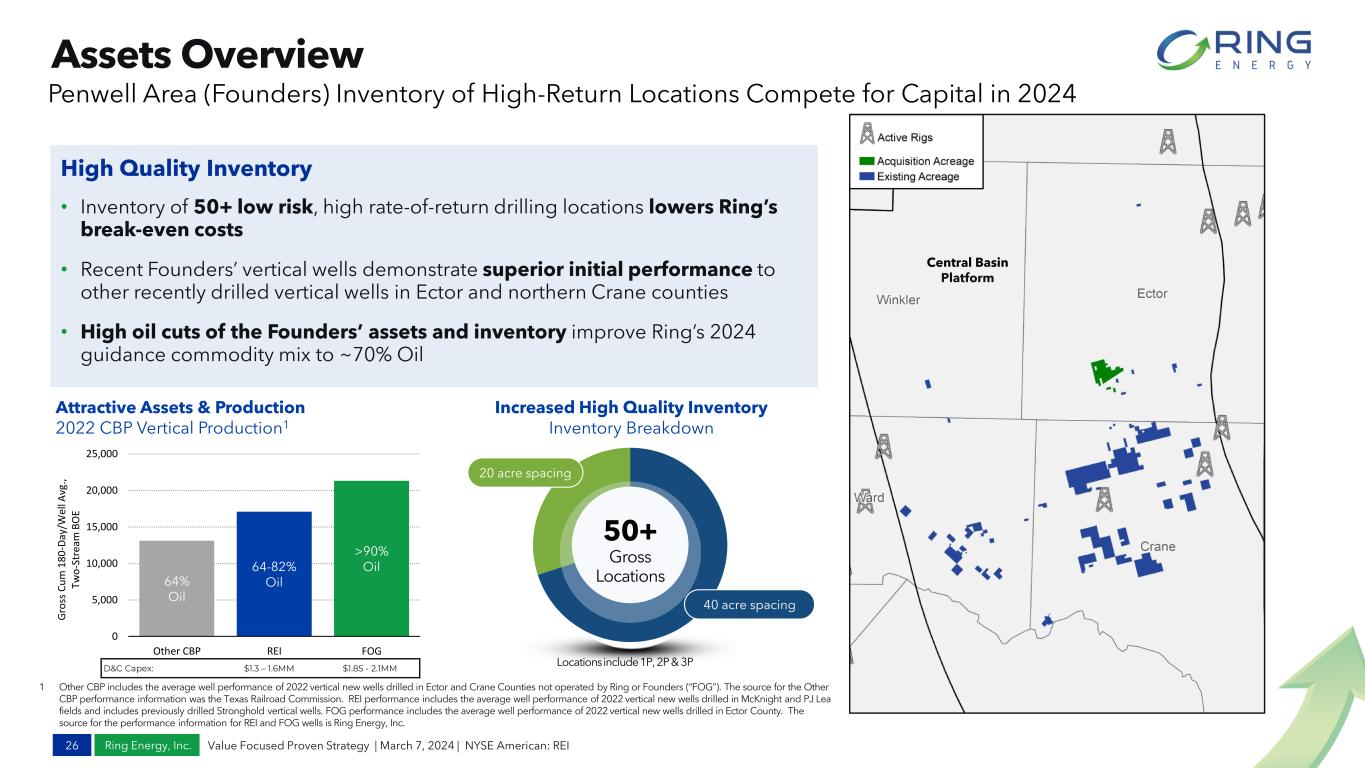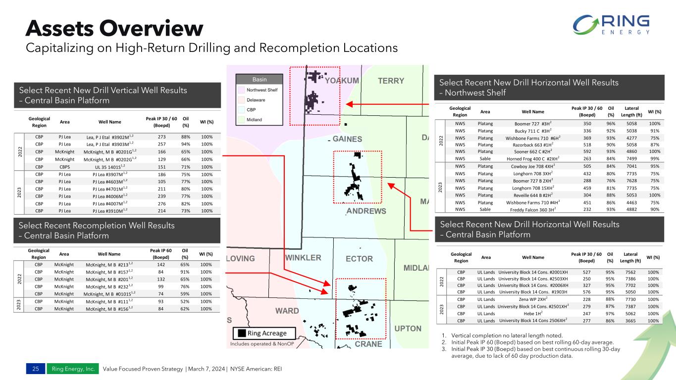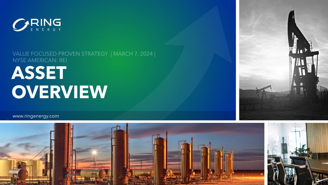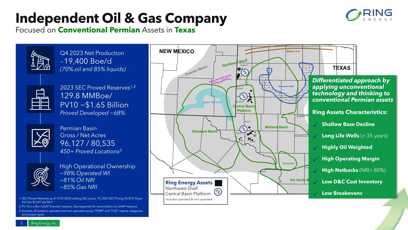 Ring Energy, Inc. Forward –Looking Statements This Presentation includes forward-looking statements within the meaning of Section 27A of the Securities Act of 1933, as amended, and Section 21E of the Securities Exchange Act of 1934, as amended. All statements, other than statements of historical fact included in this Presentation, regarding our strategy, future operations, financial position, estimated revenues and losses, projected costs, prospects, guidance, plans and objectives of management are forward-looking statements. When used in this Presentation, the words “could,” “may,” “will,” “believe,” “anticipate,” “intend,” “estimate,” “expect,” “guidance,” “project,” “goal,” “plan,” “potential,” “probably,” “target” and similar expressions are intended to identify forward-looking statements, although not all forward-looking statements contain such identifying words. These forward-looking statements are based on management’s current expectations and assumptions about future events and are based on currently available information as to the outcome and timing of future events. However, whether actual results and developments will conform to expectations is subject to a number of material risks and uncertainties, including but not limited to: declines in oil, natural gas liquids or natural gas prices; the level of success in exploration, development and production activities; adverse weather conditions that may negatively impact development or production activities; the timing of exploration and development expenditures; inaccuracies of reserve estimates or assumptions underlying them; revisions to reserve estimates as a result of changes in commodity prices; impacts to financial statements as a result of impairment write-downs; risks related to level of indebtedness and periodic redeterminations of the borrowing base and interest rates under the Company’s credit facility; Ring’s ability to generate sufficient cash flows from operations to meet the internally funded portion of its capital expenditures budget; the impacts of hedging on results of operations; and Ring’s ability to replace oil and natural gas reserves. Such statements are subject to certain risks and uncertainties which are disclosed in the Company’s reports filed with the Securities and Exchange Commission (“SEC”), including its Form 10-K for the fiscal year ended December 31, 2023, and its other filings with the SEC. All forward-looking statements in this Presentation are expressly qualified by the cautionary statements and by reference to the underlying assumptions that may prove to be incorrect. The Company undertakes no obligation to revise these forward-looking statements to reflect events or circumstances that arise after the date hereof, except as required by applicable law. The financial and operating estimates contained in this Presentation represent our reasonable estimates as of the date of this Presentation. Neither our independent auditors nor any other third party has examined, reviewed or compiled the estimates and, accordingly, none of the foregoing expresses an opinion or other form of assurance with respect thereto. The assumptions upon which the estimates are based are described in more detail herein. Some of these assumptions inevitably will not materialize, and unanticipated events may occur that could affect our results. Therefore, our actual results achieved during the periods covered by the estimates will vary from the estimated results. Investors are not to place undue reliance on the estimates included herein. Forward-Looking Statements and Supplemental Non-GAAP Financial Measures 2 Value Focused Proven Strategy | March 7, 2024 | NYSE American: REI Supplemental Non-GAAP Financial Measures This Presentation includes financial measures that are not in accordance with accounting principles generally accepted in the United States (“GAAP”), such as “Adjusted Net Income,” “Adjusted EBITDA,” “PV-10,” “Adjusted Free Cash Flow,” or “AFCF,” “Adjusted Cash Flow from Operations,” or “ACFFO,” “Cash Return on Capital Employed” or “CROCE,” “Liquidity,” “Leverage Ratio” and “All-in Cash Operating Costs.” While management believes that such measures are useful for investors, they should not be used as a replacement for financial measures that are in accordance with GAAP. For definitions of such non-GAAP financial measures and their reconciliations to GAAP measures, please see the Appendix.