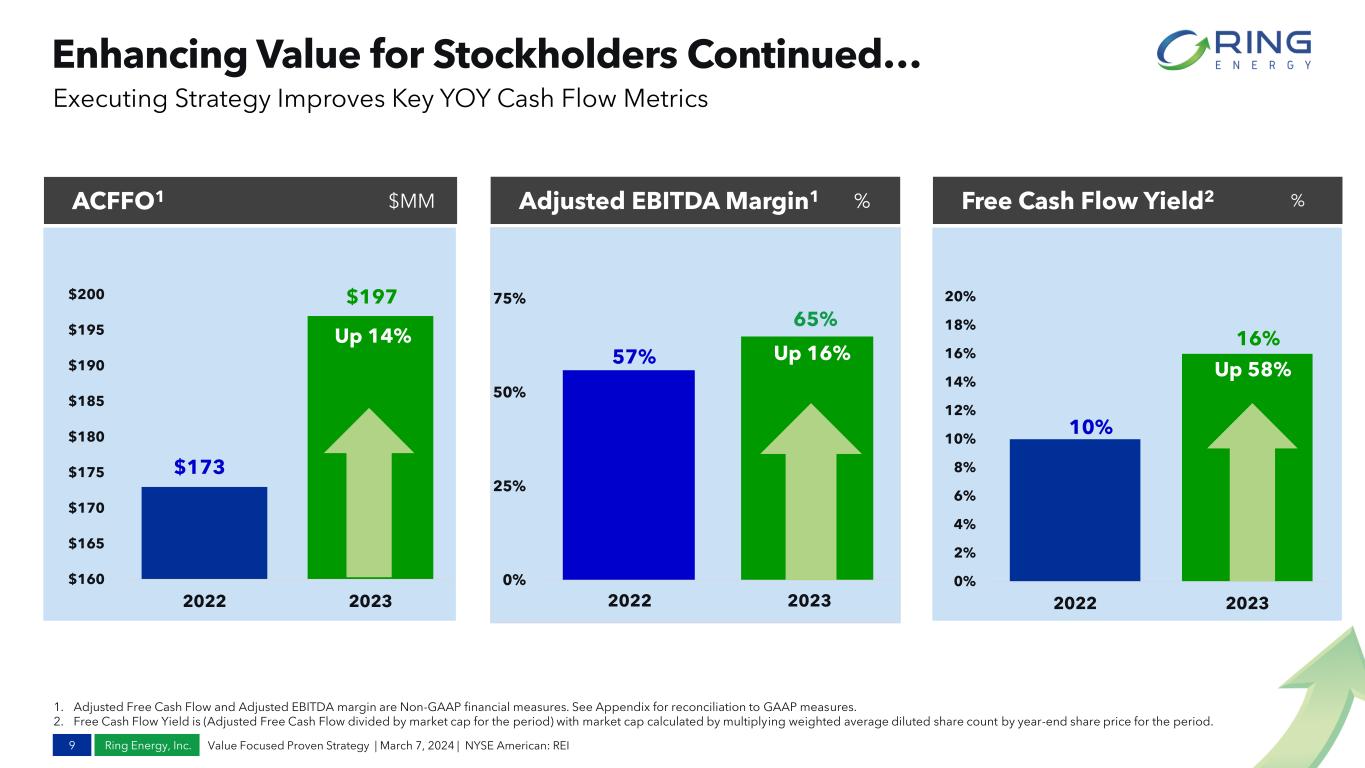 Ring Energy, Inc. 0.025 0.030 0.035 0.040 2022 2023 $20 $21 $22 $23 $24 $25 $26 $27 $28 $29 $30 2022 2023 Enhancing Value for Stockholders 8 Executing Strategy Improves YOY Production and Operating Cost per Boe Metrics Production/Share Boe/Share 0.034 0.032 Up 6% 1. All-in-Cash operating costs is defined as cash costs including LOE, cash G&A, interest expense, workovers and other operating expenses, production taxes and gathering/transportation costs. 2. Cash G&A excluding stock-based compensation on $ per Boe basis. Cash G&A Expense2 $/Boe $23.46 $24.84 $- $1 $2 $3 $4 $5 2022 2023 Down 30% All-in-Cash Operating Costs1 $/Boe $23.46 $24.84 Down 6% $4.42 $3.08 Value Focused Proven Strategy | March 7, 2024 | NYSE American: REI