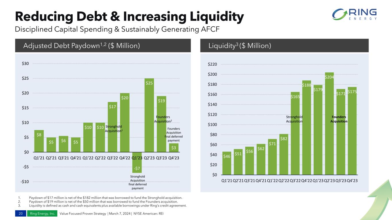 Ring Energy, Inc. Balance Sheet and Cash Flow Statement 31 Value Focused Proven Strategy | March 7, 2024 | NYSE American: REI Balance Sheet Cash Flow (Unaudited) (Unaudited) Three Months Ended Twelve Months Ended December 31, September 30, December 31, December 31, December 31, 2023 2023 2022 2023 2022 Cash Flows From Operating Activities Net income (loss) $ 50,896,479 $ (7,539,222) $ 14,492,669 $ 104,864,641 $ 138,635,025 Adjustments to reconcile net income (loss) to net cash provided by operating activities: Depreciation, depletion and amortization 24,556,654 21,989,034 20,885,774 88,610,291 55,740,767 Asset retirement obligation accretion 351,786 354,175 365,747 1,425,686 983,432 Amortization of deferred financing costs 1,221,479 1,258,466 1,222,400 4,920,714 2,706,021 Share-based compensation 2,458,682 2,170,735 2,198,043 8,833,425 7,162,231 Bad debt expense 92,142 19,656 242,247 134,007 242,247 Deferred income tax expense (benefit) 7,735,437 (3,585,002) 2,890,984 (425,275) 8,720,992 Excess tax expense (benefit) related to share-based compensation 319,541 7,886 (312,268) 478,304 (312,268) (Gain) loss on derivative contracts (29,250,352) 39,222,755 19,330,689 (2,767,162) 21,532,659 Cash received (paid) for derivative settlements, net (3,255,192) (5,350,798) (13,932,072) (9,084,920) (62,525,954) Changes in operating assets and liabilities: Accounts receivable 6,825,601 (14,419,854) 4,086,757 1,154,085 (17,214,150) Inventory (588,100) 1,778,460 (5,597,845) 3,113,782 (5,597,845) Prepaid expenses and other assets 158,163 1,028,203 1,145,031 226,688 (1,163,509) Accounts payable (4,952,335) 18,562,202 16,816,386 (1,451,422) 50,808,461 Settlement of asset retirement obligation (836,778) (105,721) (193,036) (1,862,385) (2,741,380) Net Cash Provided by Operating Activities 55,733,207 55,390,975 63,641,506 198,170,459 196,976,729 Cash Flows From Investing Activities Payments for the Stronghold Acquisition — — 5,535,839 (18,511,170) (177,823,787) Payments for the Founders Acquisition (12,324,388) (49,902,757) — (62,227,145) — Payments to purchase oil and natural gas properties (557,323) (726,519) (352,012) (2,162,585) (1,563,703) Payments to develop oil and natural gas properties (39,563,282) (40,444,810) (45,556,105) (152,559,314) (129,332,155) Payments to acquire or improve fixed assets subject to depreciation (282,519) (183,904) (161,347) (492,317) (319,945) Sale of fixed assets subject to depreciation (1) — — 332,229 134,600 Proceeds from divestiture of oil and natural gas properties 1,500,000 — (1,366) 1,554,558 23,700 Proceeds from sale of Delaware properties (7,993) (384,225) — 7,600,699 — Proceeds from sale of New Mexico properties (420,745) 4,312,502 — 3,891,757 — Net Cash Used in Investing Activities (51,656,251) (87,329,713) (40,534,991) (222,573,288) (308,881,290) Cash Flows From Financing Activities Proceeds from revolving line of credit 46,000,000 94,500,000 44,000,000 225,000,000 636,000,000 Payments on revolving line of credit (49,000,000) (63,500,000) (64,000,000) (215,000,000) (511,000,000) Proceeds from issuance of common stock from warrant exercises — — 640,000 12,301,596 8,203,126 Payments for taxes withheld on vested restricted shares, net (225,788) (18,302) (256,715) (520,153) (521,199) Proceeds from notes payable 72,442 — 78,051 1,637,513 1,323,354 Payments on notes payable (488,776) (462,606) (455,802) (1,603,659) (1,409,884) Payment of deferred financing costs (52,222) — (129,026) (52,222) (18,891,528) Reduction of financing lease liabilities (224,809) (191,748) (161,064) (776,388) (495,098) Net Cash Provided by (Used in) Financing Activities (3,919,153) 30,327,344 (20,284,556) 20,986,687 113,208,771 Net Increase (Decrease) in Cash 157,803 (1,611,394) 2,821,959 (3,416,142) 1,304,210 Cash at Beginning of Period 138,581 1,749,975 890,567 3,712,526 2,408,316 Cash at End of Period $ 296,384 $ 138,581 $ 3,712,526 $ 296,384 $ 3,712,526 As of December 31, 2023 2022 ASSETS Current Assets Cash and cash equivalents $ 296,384 $ 3,712,526 Accounts receivable 38,965,002 42,448,719 Joint interest billing receivables, net 2,422,274 983,802 Derivative assets 6,215,374 4,669,162 Inventory 6,136,935 9,250,717 Prepaid expenses and other assets 1,874,850 2,101,538 Total Current Assets 55,910,819 63,166,464 Properties and Equipment Oil and natural gas properties, full cost method 1,663,548,249 1,463,838,595 Financing lease asset subject to depreciation 3,896,316 3,019,476 Fixed assets subject to depreciation 3,228,793 3,147,125 Total Properties and Equipment 1,670,673,358 1,470,005,196 Accumulated depreciation, depletion and amortization (377,252,572) (289,935,259) Net Properties and Equipment 1,293,420,786 1,180,069,937 Operating lease asset 2,499,592 1,735,013 Derivative assets 11,634,714 6,129,410 Deferred financing costs 13,030,481 17,898,973 Total Assets $ 1,376,496,392 $ 1,268,999,797 LIABILITIES AND STOCKHOLDERS’ EQUITY Current Liabilities Accounts payable $ 104,064,124 $ 111,398,268 Financing lease liability 956,254 709,653 Operating lease liability 568,176 398,362 Derivative liabilities 7,520,336 13,345,619 Notes payable 533,734 499,880 Deferred cash payment — 14,807,276 Asset retirement obligations 165,642 635,843 Total Current Liabilities 113,808,266 141,794,901 Non-current Liabilities Deferred income taxes 8,552,045 8,499,016 Revolving line of credit 425,000,000 415,000,000 Financing lease liability, less current portion 906,330 1,052,479 Operating lease liability, less current portion 2,054,041 1,473,897 Derivative liabilities 11,510,368 10,485,650 Asset retirement obligations 28,082,442 29,590,463 Total Liabilities 589,913,492 607,896,406 Commitments and contingencies Stockholders' Equity Preferred stock - $0.001 par value; 50,000,000 shares authorized; no shares issued or outstanding — — Common stock - $0.001 par value; 450,000,000 shares authorized; 196,837,001 shares and 175,530,212 shares issued and outstanding, respectively 196,837 17