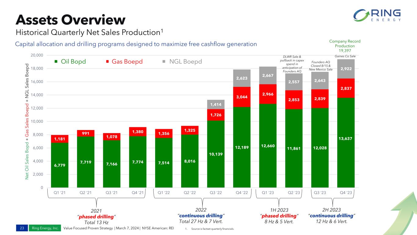 Ring Energy, Inc. Assets Overview 23 Value Focused Proven Strategy | March 7, 2024 | NYSE American: REI Historical Quarterly Net Sales Production1 1. Source is factset quarterly financials. Q3 Stronghold AQ – moved to 3 stream 6,779 7,719 7,166 7,774 7,514 8,016 10,139 12,189 12,660 11,861 12,028 1,181 991 1,078 1,380 1,356 1,325 1,726 3,044 2,966 2,853 2,839 1,414 2,623 2,667 2,557 2,643 0 2,000 4,000 6,000 8,000 10,000 12,000 14,000 16,000 18,000 20,000 Q1 '21 Q2 '21 Q3 '21 Q4 '21 Q1 '22 Q2 '22 Q3 '22 Q4 '22 Q1 '23 Q2 '23 Q3 '23 Q4 '23 N e t O il S a le s B o p d + G a s S a le s B o e p d + N G L S a le s B o e p d Company Oil Bopd Company Gas Boepd Company NGL Boepd 2021 “phased drilling” Total 13 Hz 2022 “continuous drilling” Total 27 Hz & 7 Vert. Company Record Production 19,397 DLWR Sale & pullback in capex spend in anticipation of Founders AQ Founders AQ Closed 8/15 & New Mexico Sale 1H 2023 “phased drilling” 8 Hz & 5 Vert. 2H 2023 “continuous drilling” 12 Hz & 6 Vert. 2,837 13,637 2,922 Capital allocation and drilling programs designed to maximize free cashflow generation Gaines Co Sale Oil Bopd Gas Boepd NGL Boepd