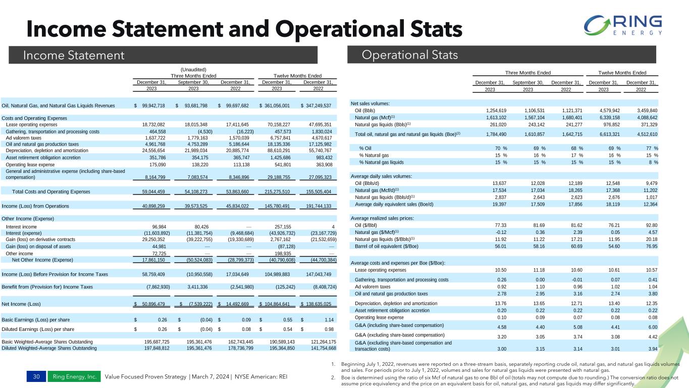 Ring Energy, Inc. Income Statement and Operational Stats 30 Value Focused Proven Strategy | March 7, 2024 | NYSE American: REI Income Statement Operational Stats 1. Beginning July 1, 2022, revenues were reported on a three-stream basis, separately reporting crude oil, natural gas, and natural gas liquids volumes and sales. For periods prior to July 1, 2022, volumes and sales for natural gas liquids were presented with natural gas. 2. Boe is determined using the ratio of six Mcf of natural gas to one Bbl of oil (totals may not compute due to rounding.) The conversion ratio does not assume price equivalency and the price on an equivalent basis for oil, natural gas, and natural gas liquids may differ significantly. (Unaudited) Three Months Ended Twelve Months Ended December 31, September 30, December 31, December 31, December 31, 2023 2023 2022 2023 2022 Oil, Natural Gas, and Natural Gas Liquids Revenues $ 99,942,718 $ 93,681,798 $ 99,697,682 $ 361,056,001 $ 347,249,537 Costs and Operating Expenses Lease operating expenses 18,732,082 18,015,348 17,411,645 70,158,227 47,695,351 Gathering, transportation and processing costs 464,558 (4,530) (16,223) 457,573 1,830,024 Ad valorem taxes 1,637,722 1,779,163 1,570,039 6,757,841 4,670,617 Oil and natural gas production taxes 4,961,768 4,753,289 5,186,644 18,135,336 17,125,982 Depreciation, depletion and amortization 24,556,654 21,989,034 20,885,774 88,610,291 55,740,767 Asset retirement obligation accretion 351,786 354,175 365,747 1,425,686 983,432 Operating lease expense 175,090 138,220 113,138 541,801 363,908 General and administrative expense (including share-based compensation) 8,164,799 7,083,574 8,346,896 29,188,755 27,095,323 Total Costs and Operating Expenses 59,044,459 54,108,273 53,863,660 215,275,510 155,505,404 Income (Loss) from Operations 40,898,259 39,573,525 45,834,022 145,780,491 191,744,133 Other Income (Expense) Interest income 96,984 80,426 — 257,155 4 Interest (expense) (11,603,892) (11,381,754) (9,468,684) (43,926,732) (23,167,729) Gain (loss) on derivative contracts 29,250,352 (39,222,755) (19,330,689) 2,767,162 (21,532,659) Gain (loss) on disposal of assets 44,981 — — (87,128) — Other income 72,725 — — 198,935 — Net Other Income (Expense) 17,861,150 (50,524,083) (28,799,373) (40,790,608) (44,700,384) Income (Loss) Before Provision for Income Taxes 58,759,409 (10,950,558) 17,034,649 104,989,883 147,043,749 Benefit from (Provision for) Income Taxes (7,862,930) 3,411,336 (2,541,980) (125,242) (8,408,724) Net Income (Loss) $ 50,896,479 $ (7,539,222) $ 14,492,669 $ 104,864,641 $ 138,635,025 Basic Earnings (Loss) per share $ 0.26 $ (0.04) $ 0.09 $ 0.55 $ 1.14 Diluted Earnings (Loss) per share $ 0.26 $ (0.04) $ 0.08 $ 0.54 $ 0.98 Basic Weighted-Average Shares Outstanding 195,687,725 195,361,476 162,743,445 190,589,143 121,264,175 Diluted Weighted-Average Shares Outstanding 197,848,812 195,361,476 178,736,799 195,364,850 141,754,668 Three Months Ended Twelve Months Ended December 31, September 30, December 31, December 31, December 31, 2023 2023 2022 2023 2022 Net sales volumes: Oil (Bbls) 1,254,619 1,106,531 1,121,371 4,579,942 3,459,840 Natural gas (Mcf)(1) 1,613,102 1,567,104 1,680,401 6,339,158 4,088,642 Natural gas liquids (Bbls)(1) 261,020 243,142 241,277 976,852 371,329 Total oil, natural gas and natural gas liquids (Boe)(2) 1,784,490 1,610,857 1,642,715 6,613,321 4,512,610 % Oil 70 % 69 % 68 % 69 % 77 % % Natural gas 15 % 16 % 17 % 16 % 15 % % Natural gas liquids 15 % 15 % 15 % 15 % 8 % Average daily sales volumes: Oil (Bbls/d) 13,637 12,028 12,189 12,548 9,479 Natural gas (Mcf/d)(1) 17,534 17,034 18,265 17,368 11,202 Natural gas liquids (Bbls/d)(1) 2,837 2,643 2,623 2,676 1,017 Average daily equivalent sales (Boe/d) 19,397 17,509 17,856 18,119 12,364 Average realized sales prices: Oil ($/Bbl) 77.33 81.69 81.62 76.21 92.80 Natural gas ($/Mcf)(1) -0.12 0.36 2.39 0.05 4.57 Natural gas liquids ($/Bbls)(1) 11.92 11.22 17.21 11.95 20.18 Barrel of oil equivalent ($/Boe) 56.01 58.16 60.69 54.60 76.95 Average costs and expenses per Boe ($/Boe): Lease operating expenses 10.50 11.18 10.60 10.61 10.57 Gathering, transportation and processing costs 0.26 0.00 -0.01 0.07 0.41 Ad valorem taxes 0.92 1.10 0.96 1.02 1.04 Oil and natural gas production taxes 2.78 2.95 3.16 2.74 3.80 Depreciation, depletion and amortization 13.76 13.65 12.71 13.40 12.35 Asset retirement obligation accretion 0.20 0.22 0.22 0.22 0.22 Operating lease expense 0.10 0.09 0.07 0.08 0.08 G&A (including share-based compensation) 4.58 4.40 5.08 4.41 6.00 G&A (excluding share-based compensation) 3.20 3.05 3.74 3.08 4.42 G&A (excluding share-based compensation and transaction costs) 3.00 3.15 3.14 3.01 3.94