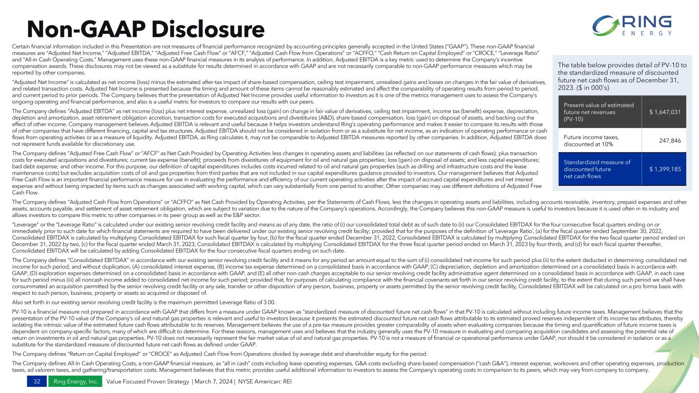 Ring Energy, Inc. The Company defines “Adjusted Cash Flow from Operations” or “ACFFO” as Net Cash Provided by Operating Activities, per the Statements of Cash Flows, less the changes in operating assets and liabilities, including accounts receivable, inventory, prepaid expenses and other assets, accounts payable, and settlement of asset retirement obligation, which are subject to variation due to the nature of the Company’s operations. Accordingly, the Company believes this non-GAAP measure is useful to investors because it is used often in its industry and allows investors to compare this metric to other companies in its peer group as well as the E&P sector. “Leverage” or the “Leverage Ratio” is calculated under our existing senior revolving credit facility and means as of any date, the ratio of (i) our consolidated total debt as of such date to (ii) our Consolidated EBITDAX for the four consecutive fiscal quarters ending on or immediately prior to such date for which financial statements are required to have been delivered under our existing senior revolving credit facility; provided that for the purposes of the definition of ‘Leverage Ratio’, (a) for the fiscal quarter ended September 30, 2022, Consolidated EBITDAX is calculated by multiplying Consolidated EBITDAX for such fiscal quarter by four, (b) for the fiscal quarter ended December 31, 2022, Consolidated EBITDAX is calculated by multiplying Consolidated EBITDAX for the two fiscal quarter period ended on December 31, 2022 by two, (c) for the fiscal quarter ended March 31, 2023, Consolidated EBITDAX is calculated by multiplying Consolidated EBITDAX for the three fiscal quarter period ended on March 31, 2023 by four-thirds, and (d) for each fiscal quarter thereafter, Consolidated EBITDAX will be calculated by adding Consolidated EBITDAX for the four consecutive fiscal quarters ending on such date. The Company defines “Consolidated EBITDAX” in accordance with our existing senior revolving credit facility and it means for any period an amount equal to the sum of (i) consolidated net income for such period plus (ii) to the extent deducted in determining consolidated net income for such period, and without duplication, (A) consolidated interest expense, (B) income tax expense determined on a consolidated basis in accordance with GAAP, (C) depreciation, depletion and amortization determined on a consolidated basis in accordance with GAAP, (D) exploration expenses determined on a consolidated basis in accordance with GAAP, and (E) all other non-cash charges acceptable to our senior revolving credit facility administrative agent determined on a consolidated basis in accordance with GAAP, in each case for such period minus (iii) all noncash income added to consolidated net income for such period; provided that, for purposes of calculating compliance with the financial covenants set forth in our senior revolving credit facility, to the extent that during such period we shall have consummated an acquisition permitted by the senior revolving credit facility or any sale, transfer or other disposition of any person, business, property or assets permitted by the senior revolving credit facility, Consolidated EBITDAX will be calculated on a pro forma basis with respect to such person, business, property or assets so acquired or disposed of. Also set forth in our existing senior revolving credit facility is the maximum permitted Leverage Ratio of 3.00. PV-10 is a financial measure not prepared in accordance with GAAP that differs from a measure under GAAP known as “standardized measure of discounted future net cash flows” in that PV-10 is calculated without including future income taxes. Management believes that the presentation of the PV-10 value of the Company’s oil and natural gas properties is relevant and useful to investors because it presents the estimated discounted future net cash flows attributable to its estimated proved reserves independent of its income tax attributes, thereby isolating the intrinsic value of the estimated future cash flows attributable to its reserves. Management believes the use of a pre-tax measure provides greater comparability of assets when evaluating companies because the timing and quantification of future income taxes is dependent on company-specific factors, many of which are difficult to determine. For these reasons, management uses and believes that the industry generally uses the PV-10 measure in evaluating and comparing acquisition candidates and assessing the potential rate of return on investments in oil and natural gas properties. PV-10 does not necessarily represent the fair market value of oil and natural gas properties. PV-10 is not a measure of financial or operational performance under GAAP, nor should it be considered in isolation or as a substitute for the standardized measure of discounted future net cash flows as defined under GAAP. The Company defines “Return on Capital Employed” or “CROCE” as Adjusted Cash Flow from Operations divided by average debt and shareholder equity for the period. The Company defines All-In Cash Operating Costs, a non-GAAP financial measure, as “all in cash” costs including lease operating expenses, G&A costs excluding share-based compensation (“cash G&A”), interest expense, workovers and other operating expenses, production taxes, ad valorem taxes, and gathering/transportation costs. Management believes that this metric provides useful additional information to investors to assess the Company’s operating costs in comparison to its peers, which may vary from company to company. Non-GAAP Disclosure 32 Value Focused Proven Strategy | March 7, 2024 | NYSE American: REI Certain financial information included in this Presentation are not measures of financial performance recognized by accounting principles generally accepted in the United States (“GAAP”). These non-GAAP financial measures are “Adjusted Net Income,