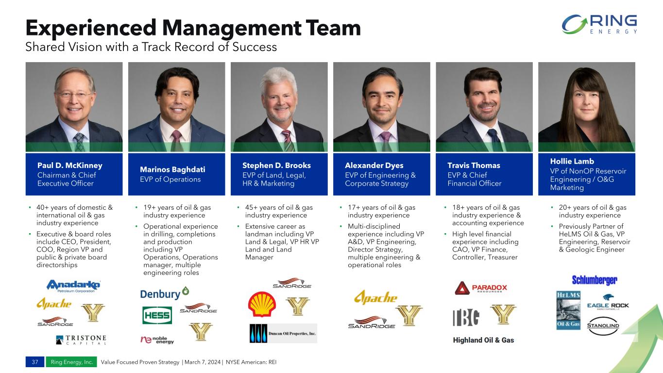 Ring Energy, Inc. Non-GAAP Reconciliations (cont.) 36 Value Focused Proven Strategy | March 7, 2024 | NYSE American: REI All-In Cash Operating Costs . (Unaudited for All Periods) Three Months Ended Twelve Months Ended December 31, September 30, December 31, December 31, December 31, 2023 2023 2022 2023 2022 Lease operating expenses (including workovers) 18,732,082 18,015,348 17,411,645 70,158,227 47,695,351 G&A excluding share-based compensation 5,706,117 4,912,839 6,148,853 20,355,330 19,933,092 Net interest expense (excluding amortization of deferred financing costs) 10,285,429 10,042,862 8,246,284 38,748,863 20,461,704 Operating lease expense 175,090 138,220 113,138 541,801 363,908 Oil and natural gas production taxes 4,961,768 4,753,289 5,186,644 18,135,336 17,125,982 Ad valorem taxes 1,637,722 1,779,163 1,570,039 6,757,841 4,670,617 Gathering, transportation and processing costs 464,558 (4,530) (16,223) 457,573 1,830,024 All-in cash operating costs 41,962,766 39,637,191 38,660,380 155,154,971 112,080,678 Boe 1,784,490 1,610,857 1,642,715 6,613,321 4,512,610 All-in cash operating costs per Boe $ 23.52 $ 24.61 $ 23.53 $ 23.46 $ 24.84