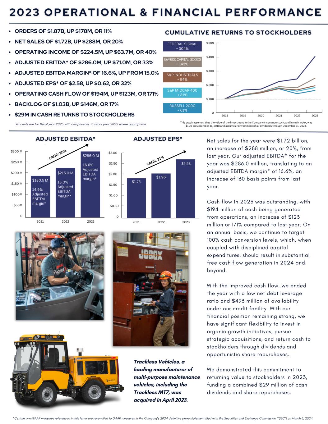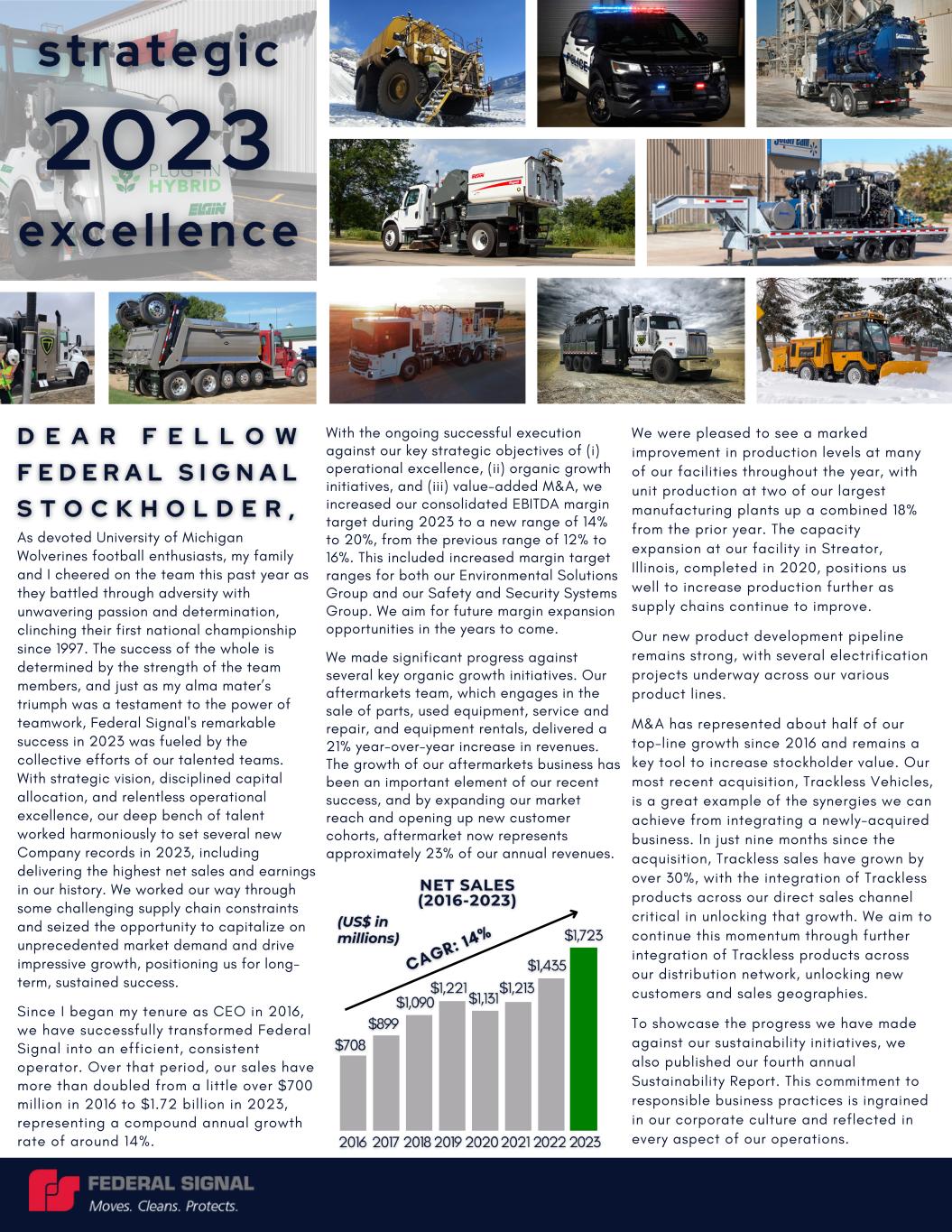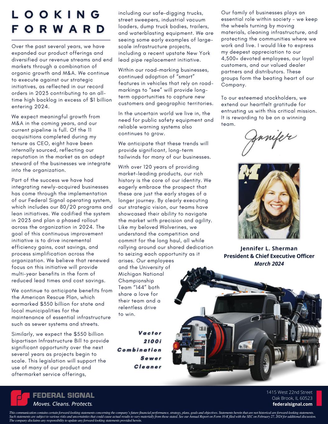 | On or around March 8, 2024, Federal Signal Corporation will send an outreach letter (the "Letter") to its stockholders and other interested parties. The Letter may constitute additional proxy solicitation materials by the Company, and is attached as Exhibit 99.1 to this filing and incorporated by reference herein. |