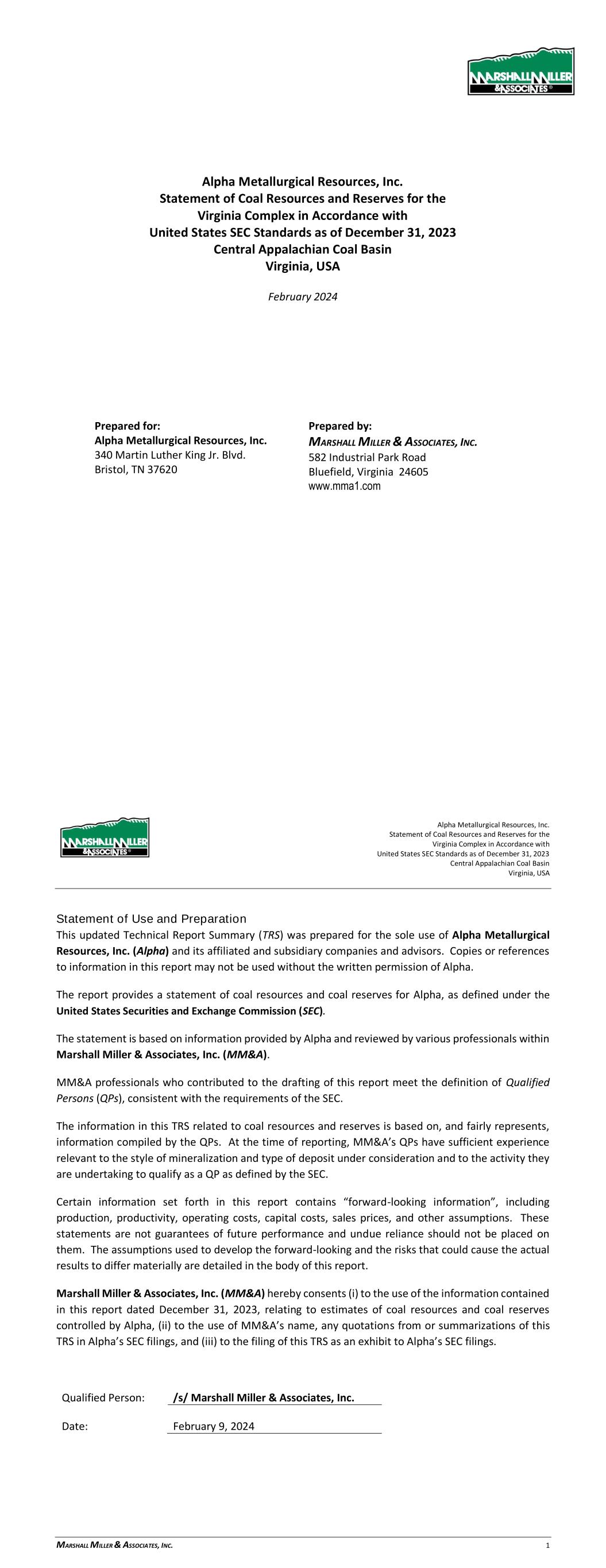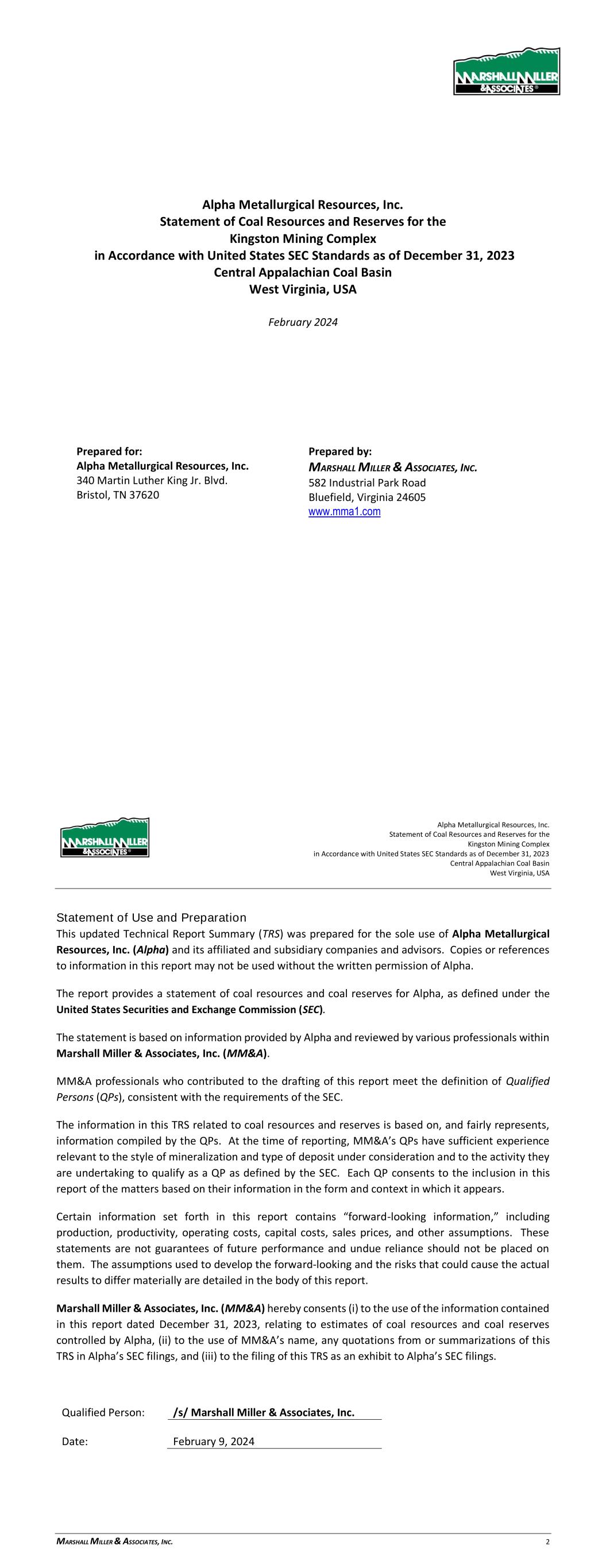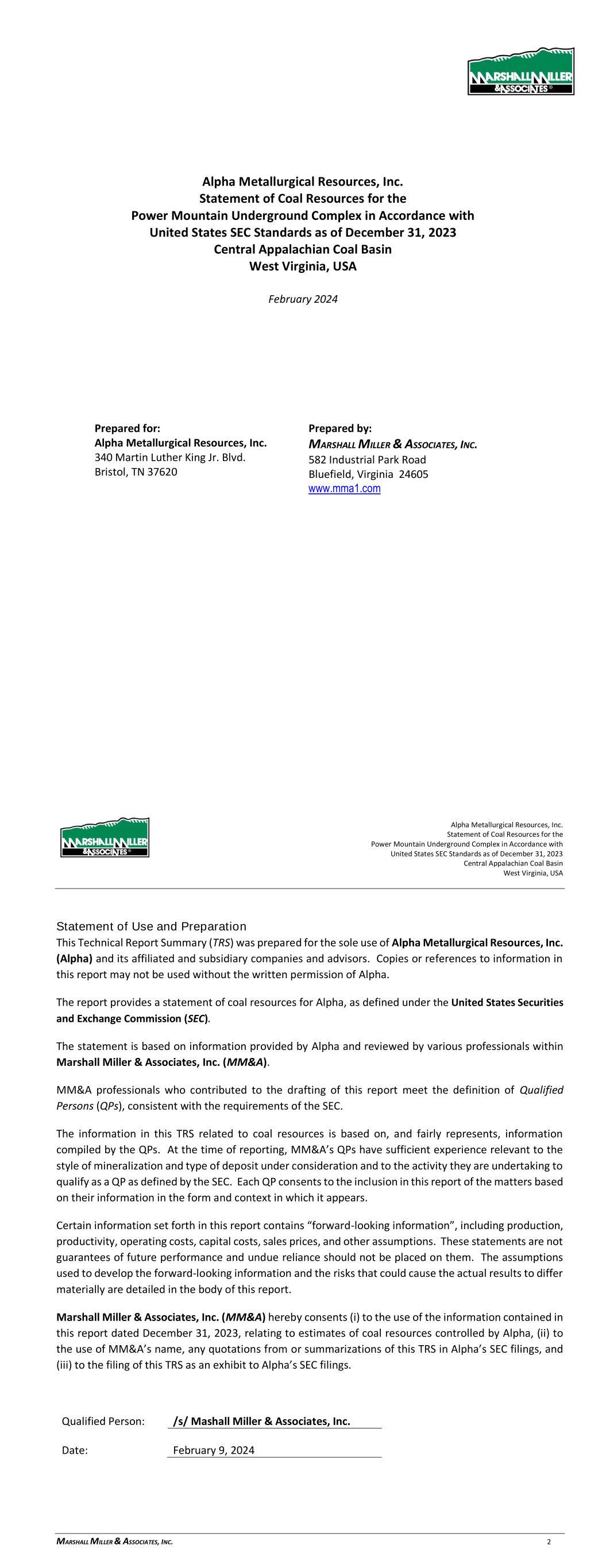 Alpha Metallurgical Resources, Inc. Statement of Coal Resources for the Power Mountain Underground Complex in Accordance with United States SEC Standards as of December 31, 2023 Central Appalachian Coal Basin West Virginia, USA February 2024 Prepared for: Alpha Metallurgical Resources, Inc. 340 Martin Luther King Jr. Blvd. Bristol, TN 37620 Prepared by: MARSHALL MILLER & ASSOCIATES, INC. 582 Industrial Park Road Bluefield, Virginia 24605 www.mma1.com Alpha Metallurgical Resources, Inc. Statement of Coal Resources for the Power Mountain Underground Complex in Accordance with United States SEC Standards as of December 31, 2023 Central Appalachian Coal Basin West Virginia, USA MARSHALL MILLER & ASSOCIATES, INC. 2 Statement of Use and Preparation This Technical Report Summary (TRS) was prepared for the sole use of Alpha Metallurgical Resources, Inc. (Alpha) and its affiliated and subsidiary companies and advisors. Copies or references to information in this report may not be used without the written permission of Alpha. The report provides a statement of coal resources for Alpha, as defined under the United States Securities and Exchange Commission (SEC). The statement is based on information provided by Alpha and reviewed by various professionals within Marshall Miller & Associates, Inc. (MM&A). MM&A professionals who contributed to the drafting of this report meet the definition of Qualified Persons (QPs), consistent with the requirements of the SEC. The information in this TRS related to coal resources is based on, and fairly represents, information compiled by the QPs. At the time of reporting, MM&A’s QPs have sufficient experience relevant to the style of mineralization and type of deposit under consideration and to the activity they are undertaking to qualify as a QP as defined by the SEC. Each QP consents to the inclusion in this report of the matters based on their information in the form and context in which it appears. Certain information set forth in this report contains “forward-looking information”, including production, productivity, operating costs, capital costs, sales prices, and other assumptions. These statements are not guarantees of future performance and undue reliance should not be placed on them. The assumptions used to develop the forward-looking information and the risks that could cause the actual results to differ materially are detailed in the body of this report. Marshall Miller & Associates, Inc. (MM&A) hereby consents (i) to the use of the information contained in this report dated December 31, 2023, relating to estimates of coal resources controlled by Alpha, (ii) to the use of MM&A’s name, any quotations from or summarizations of this TRS in Alpha’s SEC filings, and (iii) to the filing of this TRS as an exhibit to Alpha’s SEC filings. Qualified Person: /s/ Mashall Miller & Associates, Inc. Date: February 9, 2024