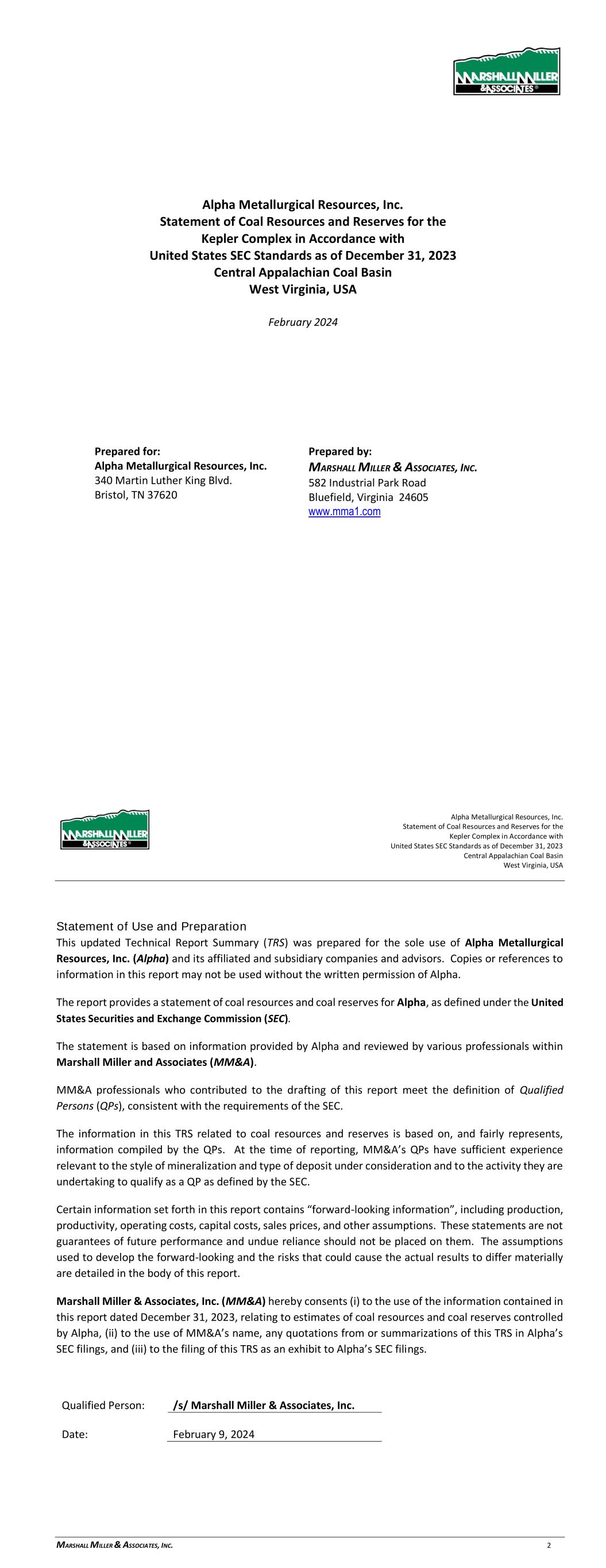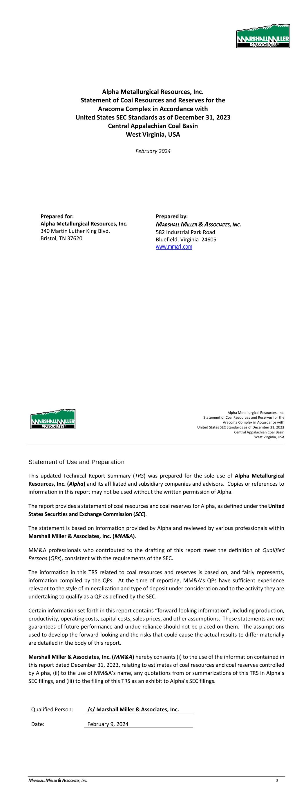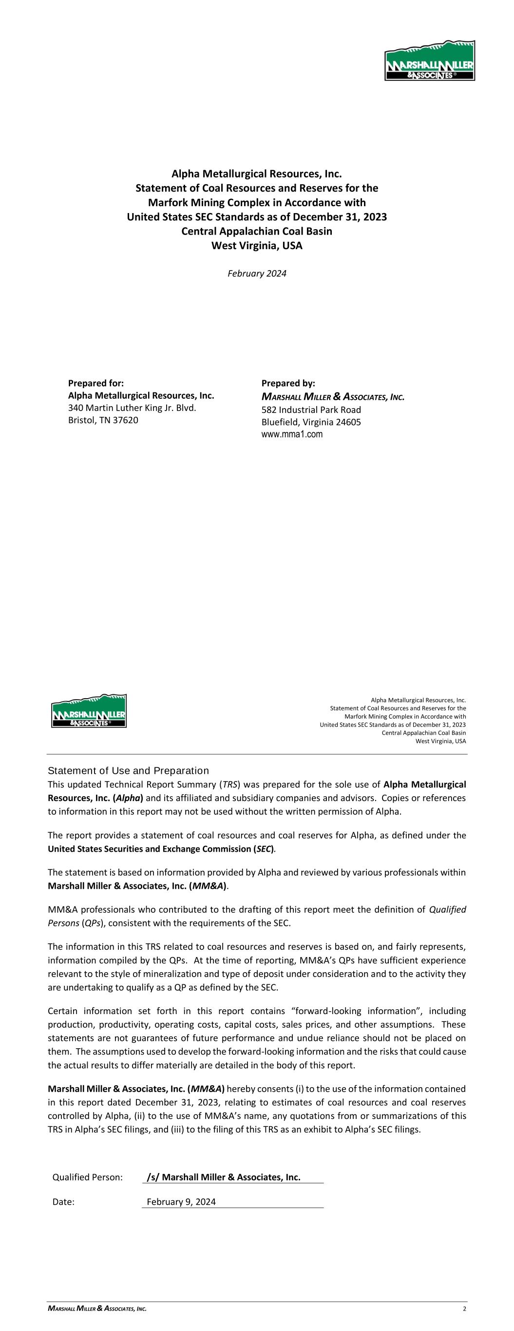 Alpha Metallurgical Resources, Inc. Statement of Coal Resources for the Power Mountain Underground Complex in Accordance with United States SEC Standards as of December 31, 2023 Central Appalachian Coal Basin West Virginia, USA February 2024 Prepared for: Alpha Metallurgical Resources, Inc. 340 Martin Luther King Jr. Blvd. Bristol, TN 37620 Prepared by: MARSHALL MILLER & ASSOCIATES, INC. 582 Industrial Park Road Bluefield, Virginia 24605 www.mma1.com Alpha Metallurgical Resources, Inc. Statement of Coal Resources for the Power Mountain Underground Complex in Accordance with United States SEC Standards as of December 31, 2023 Central Appalachian Coal Basin West Virginia, USA MARSHALL MILLER & ASSOCIATES, INC. 2 Statement of Use and Preparation This Technical Report Summary (TRS) was prepared for the sole use of Alpha Metallurgical Resources, Inc. (Alpha) and its affiliated and subsidiary companies and advisors. Copies or references to information in this report may not be used without the written permission of Alpha. The report provides a statement of coal resources for Alpha, as defined under the United States Securities and Exchange Commission (SEC). The statement is based on information provided by Alpha and reviewed by various professionals within Marshall Miller & Associates, Inc. (MM&A). MM&A professionals who contributed to the drafting of this report meet the definition of Qualified Persons (QPs), consistent with the requirements of the SEC. The information in this TRS related to coal resources is based on, and fairly represents, information compiled by the QPs. At the time of reporting, MM&A’s QPs have sufficient experience relevant to the style of mineralization and type of deposit under consideration and to the activity they are undertaking to qualify as a QP as defined by the SEC. Each QP consents to the inclusion in this report of the matters based on their information in the form and context in which it appears. Certain information set forth in this report contains “forward-looking information”, including production, productivity, operating costs, capital costs, sales prices, and other assumptions. These statements are not guarantees of future performance and undue reliance should not be placed on them. The assumptions used to develop the forward-looking information and the risks that could cause the actual results to differ materially are detailed in the body of this report. Marshall Miller & Associates, Inc. (MM&A) hereby consents (i) to the use of the information contained in this report dated December 31, 2023, relating to estimates of coal resources controlled by Alpha, (ii) to the use of MM&A’s name, any quotations from or summarizations of this TRS in Alpha’s SEC filings, and (iii) to the filing of this TRS as an exhibit to Alpha’s SEC filings. Qualified Person: /s/ Mashall Miller & Associates, Inc. Date: February 9, 2024