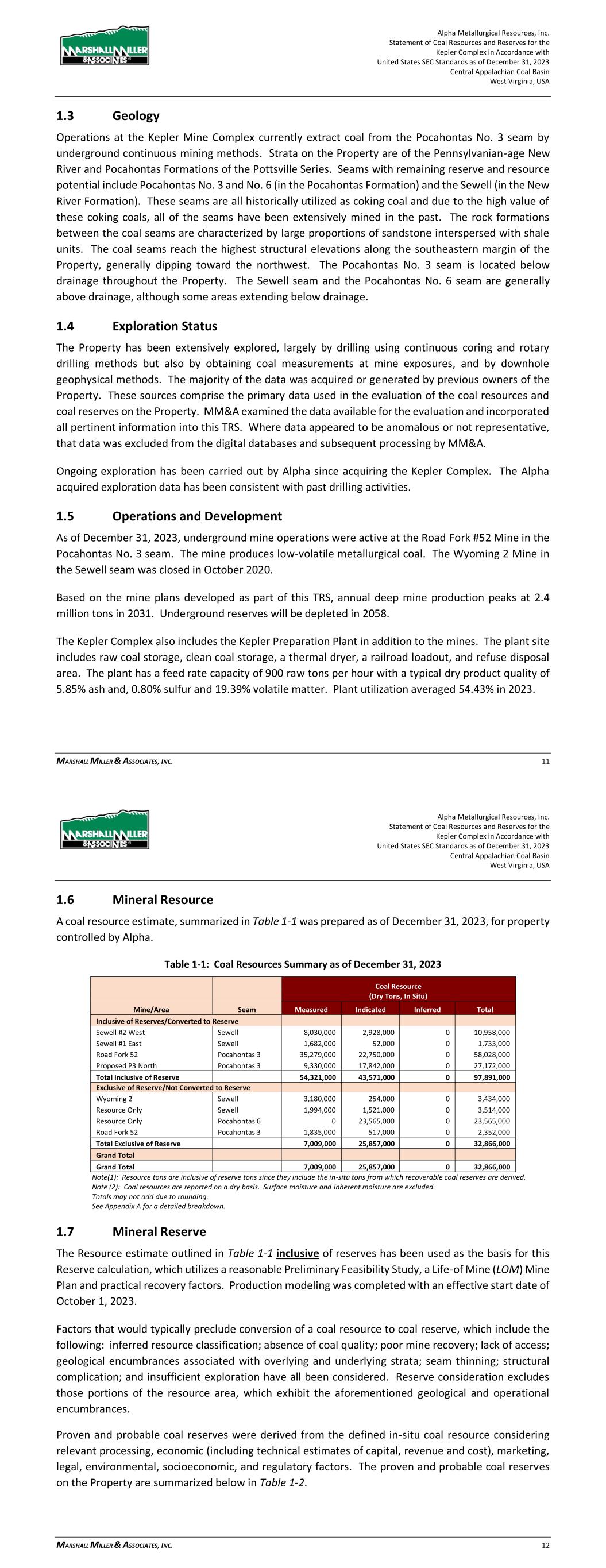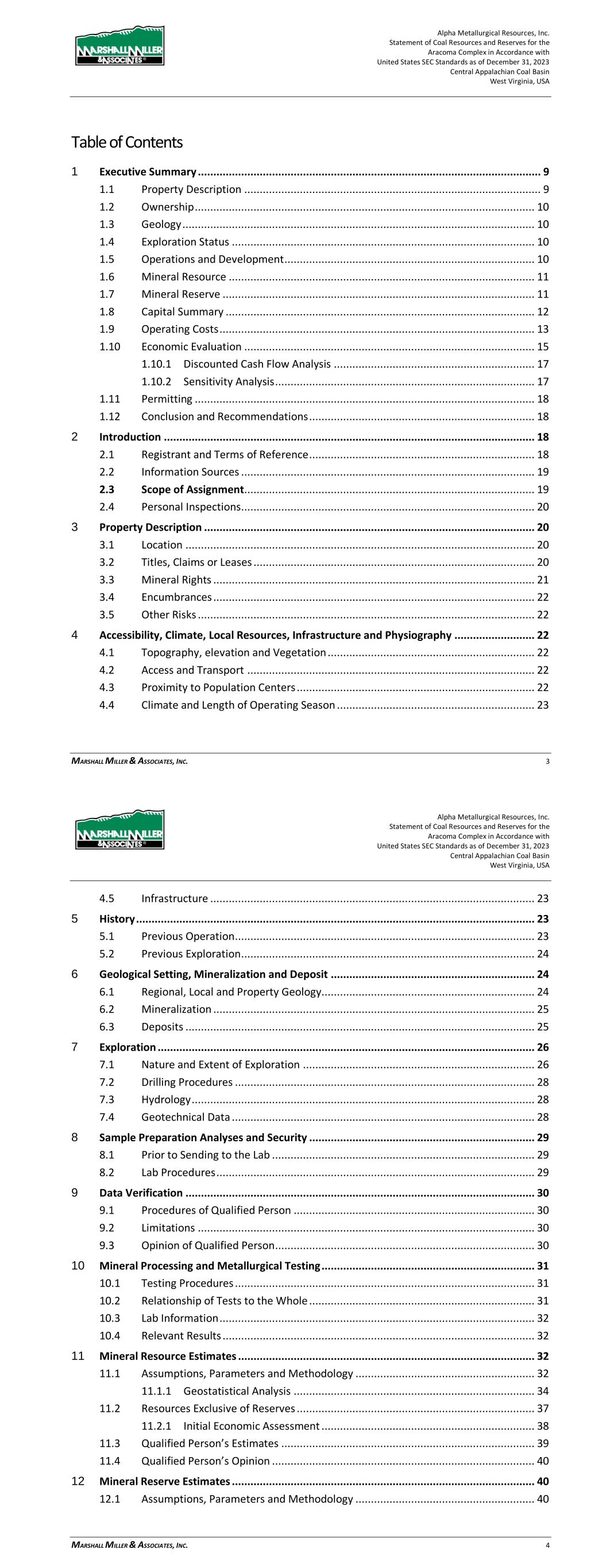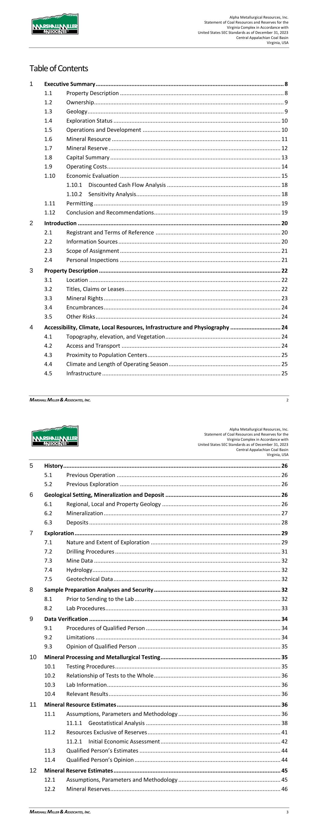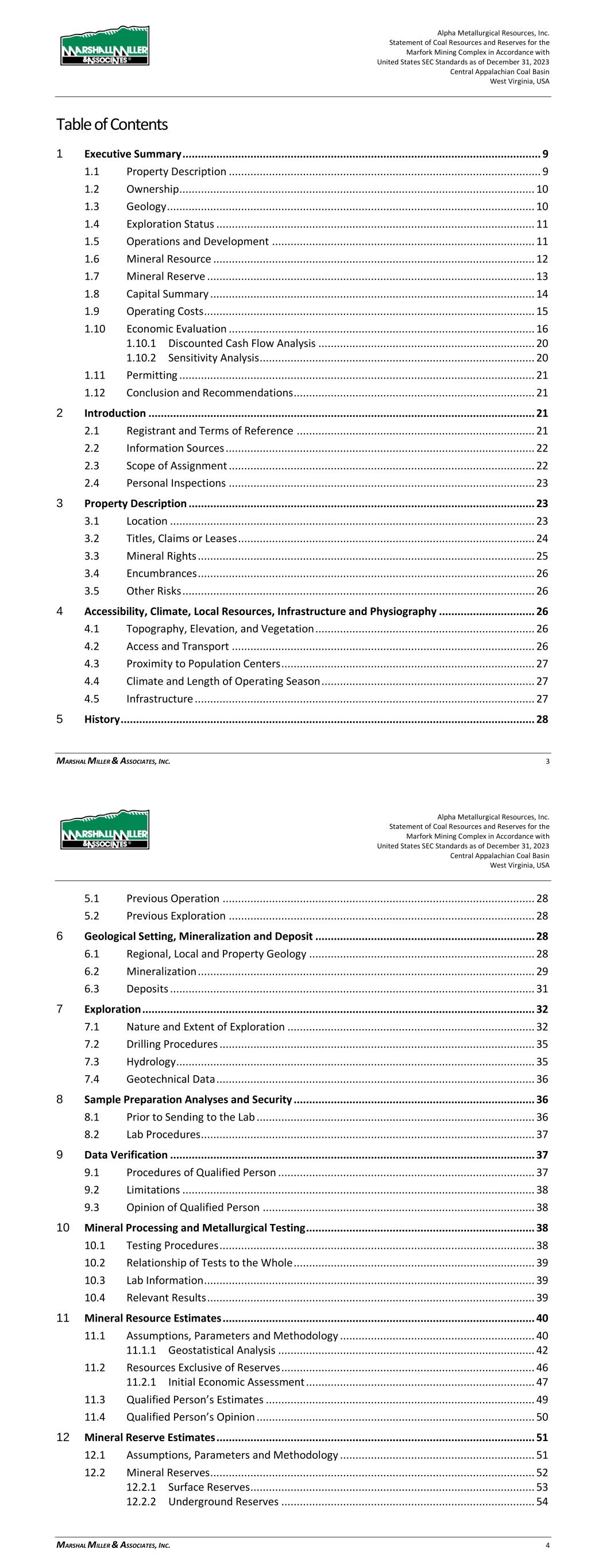 Alpha Metallurgical Resources, Inc. Statement of Coal Resources for the Power Mountain Underground Complex in Accordance with United States SEC Standards as of December 31, 2023 Central Appalachian Coal Basin West Virginia, USA MARSHALL MILLER & ASSOCIATES, INC. 3 Table of Contents 1 Executive Summary ............................................................................................................... 7 1.1 Property Description ................................................................................................ 7 1.2 Ownership ................................................................................................................ 8 1.3 Geology .................................................................................................................... 8 1.4 Exploration ............................................................................................................... 8 1.5 Operations and Development ................................................................................... 8 1.6 Mineral Resource ..................................................................................................... 8 1.7 Permitting ................................................................................................................ 9 1.8 Conclusion and Recommendations ........................................................................... 9 2 Introduction ........................................................................................................................ 10 2.1 Registrant and Terms of Reference ......................................................................... 10 2.2 Information Sources ............................................................................................... 10 2.3 Scope of Assignment .............................................................................................. 10 2.4 Personal Inspections ............................................................................................... 11 2.5 Updates to Previous TRS ......................................................................................... 11 3 Property Description ........................................................................................................... 11 3.1 Location ................................................................................................................. 11 3.2 Titles, Claims or Leases ........................................................................................... 12 3.3 Mineral Rights ........................................................................................................ 13 3.4 Encumbrances ........................................................................................................ 13 3.5 Other Risks ............................................................................................................. 14 4 Accessibility, Climate, Local Resources, Infrastructure and Physiography .......................... 14 4.1 Topography, Elevation, and Vegetation .................................................................. 14 4.2 Access and Transport ............................................................................................. 14 4.3 Proximity to Population Centers ............................................................................. 14 4.4 Climate and Length of Operating Season ................................................................ 15 4.5 Infrastructure ......................................................................................................... 15 5 History ................................................................................................................................. 15 5.1 Previous Operation ................................................................................................. 15 5.2 Previous Exploration ............................................................................................... 16 6 Geology ............................................................................................................................... 16 6.1 Regional, Local and Property Geology..................................................................... 16 6.2 Mineralization ........................................................................................................ 17 Alpha Metallurgical Resources, Inc. Statement of Coal Resources for the Power Mountain Underground Complex in Accordance with United States SEC Standards as of December 31, 2023 Central Appalachian Coal Basin West Virginia, USA MARSHALL MILLER & ASSOCIATES, INC. 4 6.3 Deposits ................................................................................................................. 18 6.3.1 Seam Description ...................................................................................... 18 7 Exploration .......................................................................................................................... 19 7.1 Nature and Extent of Exploration ........................................................................... 19 7.2 Drilling Procedures ................................................................................................. 21 7.3 Hydrology ............................................................................................................... 21 7.4 Geotechnical Data .................................................................................................. 21 8 Sample Preparation Analyses and Security ......................................................................... 22 8.1 Prior to Sending to the Lab ..................................................................................... 22 8.2 Lab Procedures ....................................................................................................... 22 9 Data Verification ...........................................................................