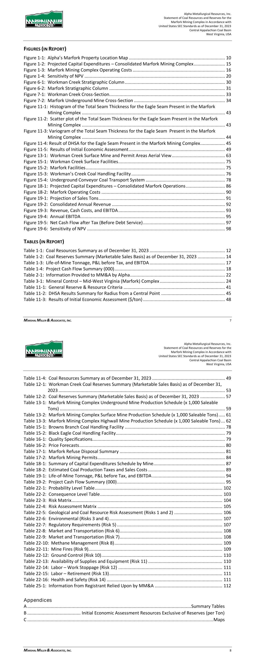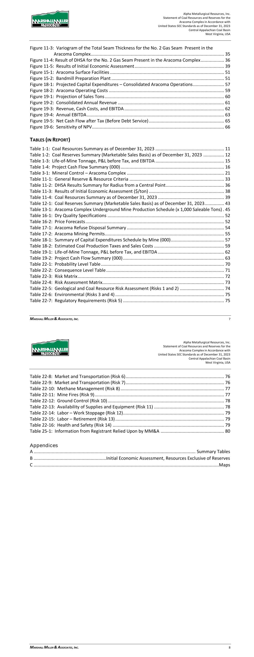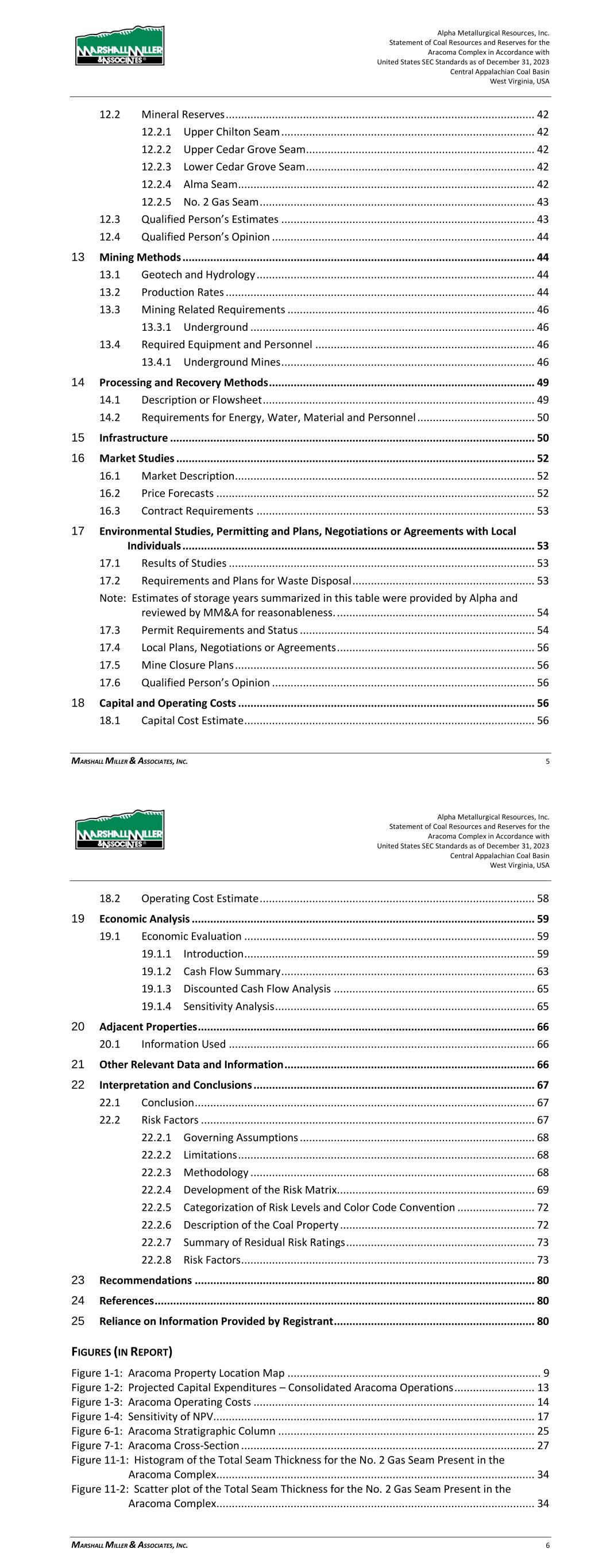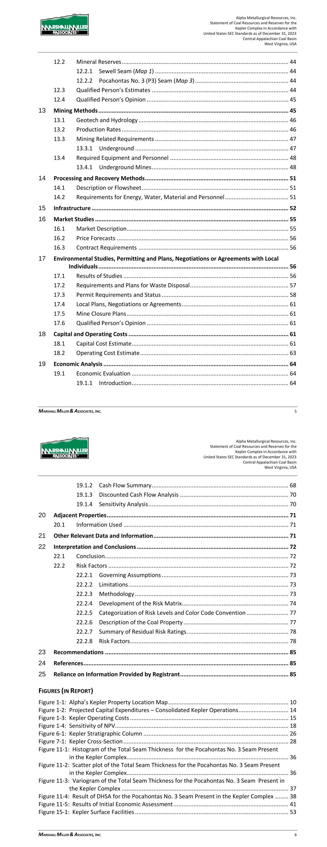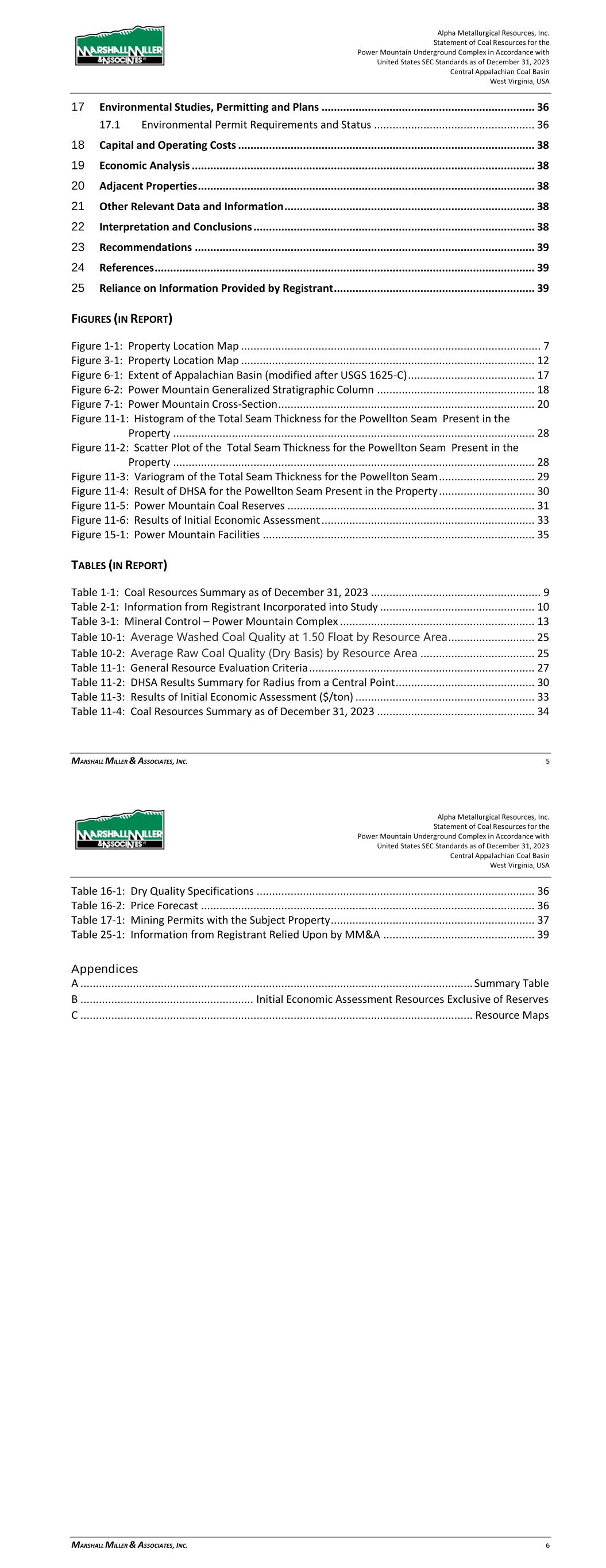 Alpha Metallurgical Resources, Inc. Statement of Coal Resources for the Power Mountain Underground Complex in Accordance with United States SEC Standards as of December 31, 2023 Central Appalachian Coal Basin West Virginia, USA MARSHALL MILLER & ASSOCIATES, INC. 5 17 Environmental Studies, Permitting and Plans ..................................................................... 36 17.1 Environmental Permit Requirements and Status .................................................... 36 18 Capital and Operating Costs ................................................................................................ 38 19 Economic Analysis ............................................................................................................... 38 20 Adjacent Properties ............................................................................................................. 38 21 Other Relevant Data and Information ................................................................................. 38 22 Interpretation and Conclusions ........................................................................................... 38 23 Recommendations .............................................................................................................. 39 24 References ........................................................................................................................... 39 25 Reliance on Information Provided by Registrant ................................................................. 39 FIGURES (IN REPORT) Figure 1-1: Property Location Map ................................................................................................. 7 Figure 3-1: Property Location Map ............................................................................................... 12 Figure 6-1: Extent of Appalachian Basin (modified after USGS 1625-C) ......................................... 17 Figure 6-2: Power Mountain Generalized Stratigraphic Column ................................................... 18 Figure 7-1: Power Mountain Cross-Section ................................................................................... 20 Figure 11-1: Histogram of the Total Seam Thickness for the Powellton Seam Present in the Property ..................................................................................................................... 28 Figure 11-2: Scatter Plot of the Total Seam Thickness for the Powellton Seam Present in the Property ..................................................................................................................... 28 Figure 11-3: Variogram of the Total Seam Thickness for the Powellton Seam ............................... 29 Figure 11-4: Result of DHSA for the Powellton Seam Present in the Property ............................... 30 Figure 11-5: Power Mountain Coal Reserves ................................................................................ 31 Figure 11-6: Results of Initial Economic Assessment ..................................................................... 33 Figure 15-1: Power Mountain Facilities ........................................................................................ 35 TABLES (IN REPORT) Table 1-1: Coal Resources Summary as of December 31, 2023 ....................................................... 9 Table 2-1: Information from Registrant Incorporated into Study .................................................. 10 Table 3-1: Mineral Control – Power Mountain Complex ............................................................... 13 Table 10-1: Average Washed Coal Quality at 1.50 Float by Resource Area ............................ 25 Table 10-2: Average Raw Coal Quality (Dry Basis) by Resource Area ..................................... 25 Table 11-1: General Resource Evaluation Criteria ......................................................................... 27 Table 11-2: DHSA Results Summary for Radius from a Central Point ............................................. 30 Table 11-3: Results of Initial Economic Assessment ($/ton) .......................................................... 33 Table 11-4: Coal Resources Summary as of December 31, 2023 ................................................... 34 Alpha Metallurgical Resources, Inc. Statement of Coal Resources for the Power Mountain Underground Complex in Accordance with United States SEC Standards as of December 31, 2023 Central Appalachian Coal Basin West Virginia, USA MARSHALL MILLER & ASSOCIATES, INC. 6 Table 16-1: Dry Quality Specifications .......................................................................................... 36 Table 16-2: Price Forecast ............................................................................................................ 36 Table 17-1: Mining Permits with the Subject Property .................................................................. 37 Table 25-1: Information from Registrant Relied Upon by MM&A ................................................. 39 Appendices A ............................................................................................................................... Summary Table B ........................................................ Initial Economic Assessment Resources Exclusive of Reserves C ............................................................................................................................... Resource Maps