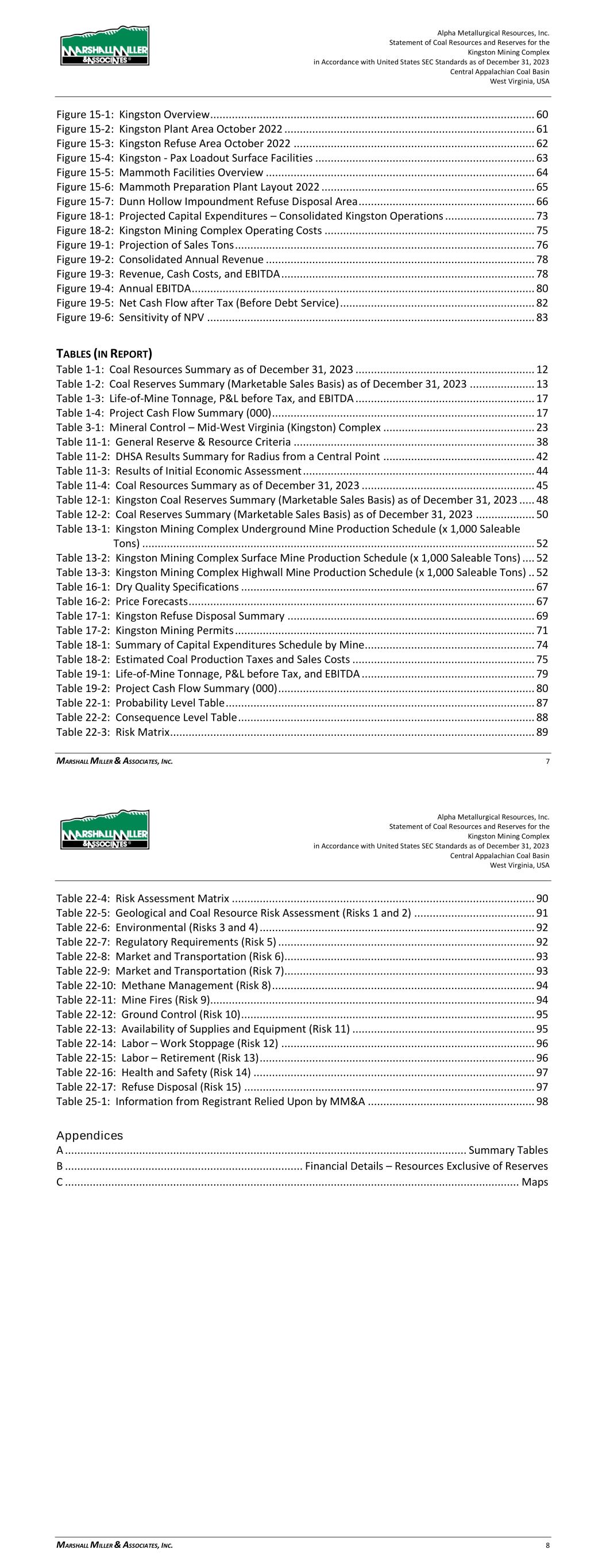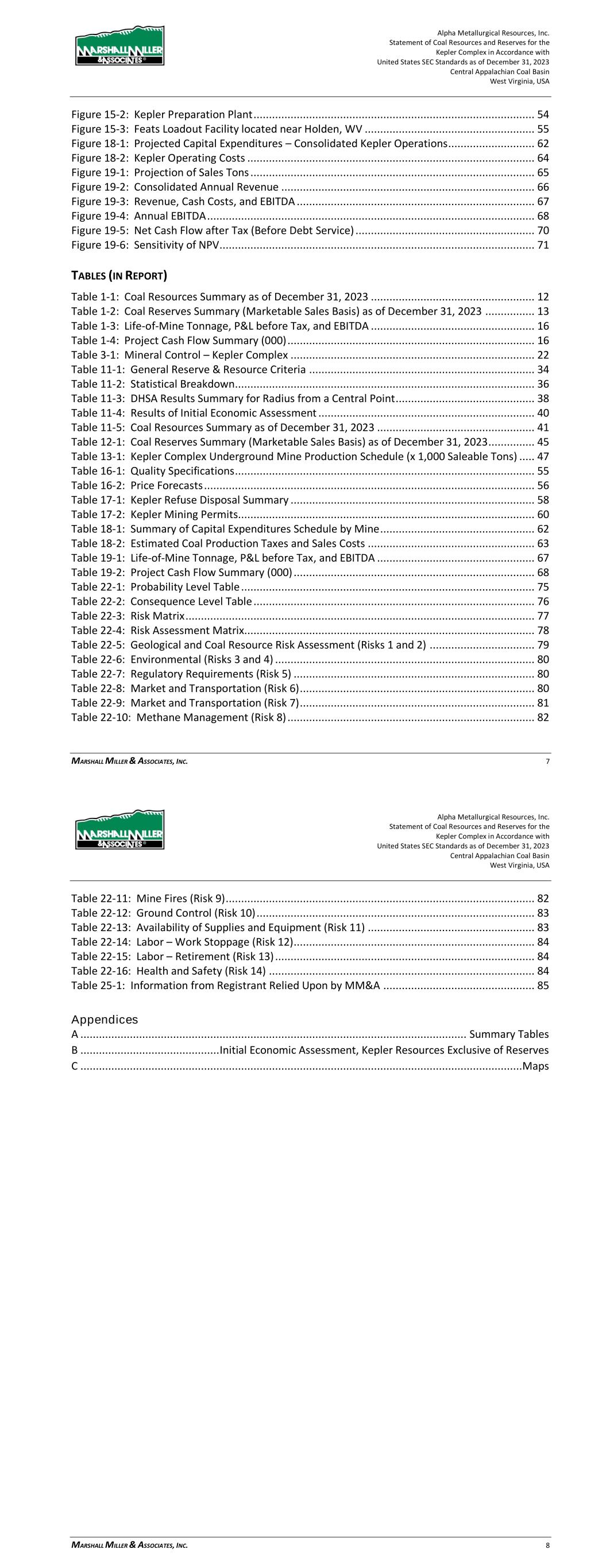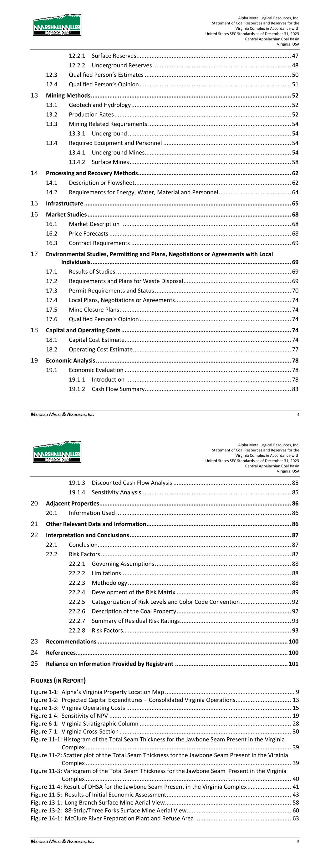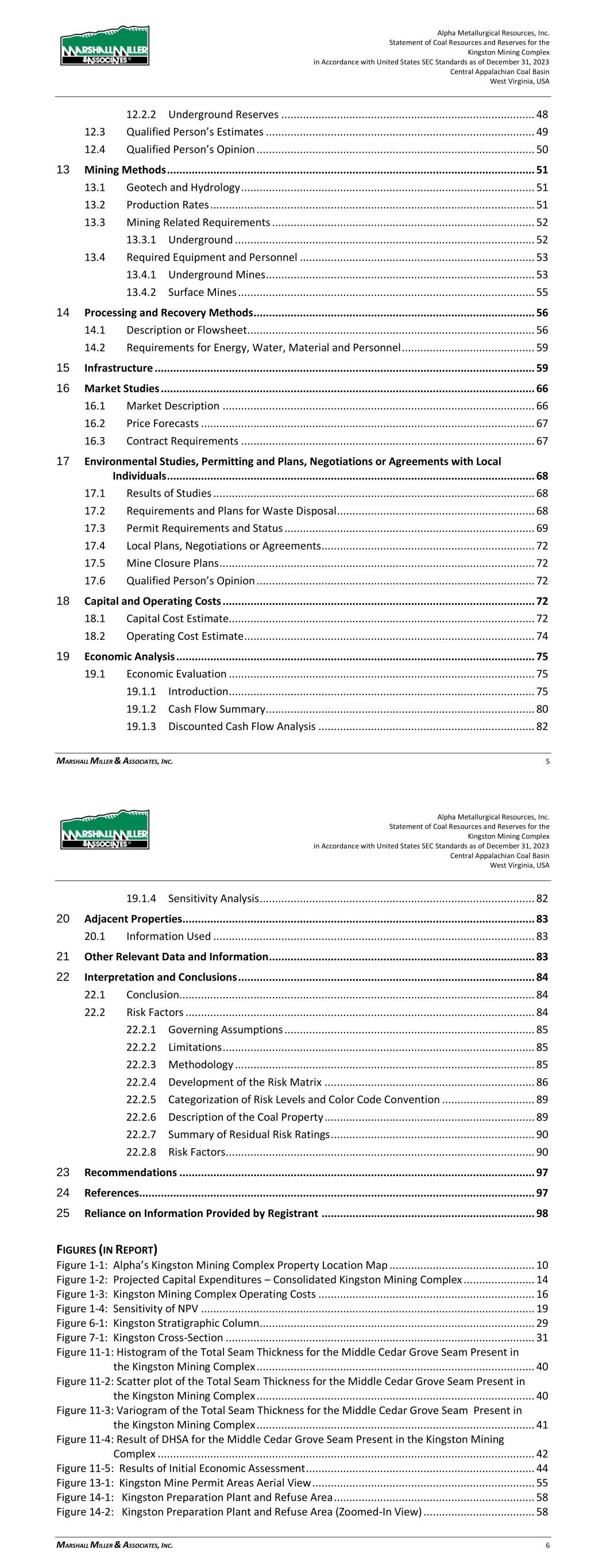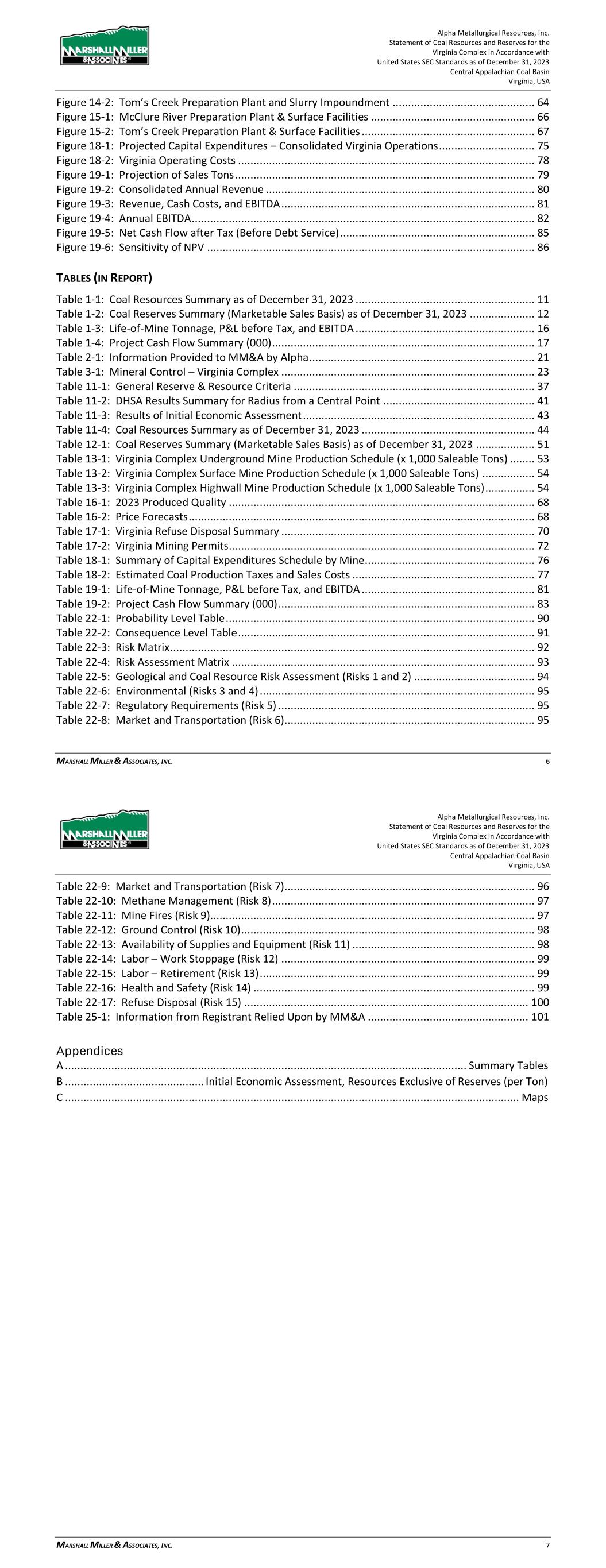 Alpha Metallurgical Resources, Inc. Statement of Coal Resources for the Power Mountain Underground Complex in Accordance with United States SEC Standards as of December 31, 2023 Central Appalachian Coal Basin West Virginia, USA MARSHALL MILLER & ASSOCIATES, INC. 5 17 Environmental Studies, Permitting and Plans ..................................................................... 36 17.1 Environmental Permit Requirements and Status .................................................... 36 18 Capital and Operating Costs ................................................................................................ 38 19 Economic Analysis ............................................................................................................... 38 20 Adjacent Properties ............................................................................................................. 38 21 Other Relevant Data and Information ................................................................................. 38 22 Interpretation and Conclusions ........................................................................................... 38 23 Recommendations .............................................................................................................. 39 24 References ........................................................................................................................... 39 25 Reliance on Information Provided by Registrant ................................................................. 39 FIGURES (IN REPORT) Figure 1-1: Property Location Map ................................................................................................. 7 Figure 3-1: Property Location Map ............................................................................................... 12 Figure 6-1: Extent of Appalachian Basin (modified after USGS 1625-C) ......................................... 17 Figure 6-2: Power Mountain Generalized Stratigraphic Column ................................................... 18 Figure 7-1: Power Mountain Cross-Section ................................................................................... 20 Figure 11-1: Histogram of the Total Seam Thickness for the Powellton Seam Present in the Property ..................................................................................................................... 28 Figure 11-2: Scatter Plot of the Total Seam Thickness for the Powellton Seam Present in the Property ..................................................................................................................... 28 Figure 11-3: Variogram of the Total Seam Thickness for the Powellton Seam ............................... 29 Figure 11-4: Result of DHSA for the Powellton Seam Present in the Property ............................... 30 Figure 11-5: Power Mountain Coal Reserves ................................................................................ 31 Figure 11-6: Results of Initial Economic Assessment ..................................................................... 33 Figure 15-1: Power Mountain Facilities ........................................................................................ 35 TABLES (IN REPORT) Table 1-1: Coal Resources Summary as of December 31, 2023 ....................................................... 9 Table 2-1: Information from Registrant Incorporated into Study .................................................. 10 Table 3-1: Mineral Control – Power Mountain Complex ............................................................... 13 Table 10-1: Average Washed Coal Quality at 1.50 Float by Resource Area ............................ 25 Table 10-2: Average Raw Coal Quality (Dry Basis) by Resource Area ..................................... 25 Table 11-1: General Resource Evaluation Criteria ......................................................................... 27 Table 11-2: DHSA Results Summary for Radius from a Central Point ............................................. 30 Table 11-3: Results of Initial Economic Assessment ($/ton) .......................................................... 33 Table 11-4: Coal Resources Summary as of December 31, 2023 ................................................... 34 Alpha Metallurgical Resources, Inc. Statement of Coal Resources for the Power Mountain Underground Complex in Accordance with United States SEC Standards as of December 31, 2023 Central Appalachian Coal Basin West Virginia, USA MARSHALL MILLER & ASSOCIATES, INC. 6 Table 16-1: Dry Quality Specifications .......................................................................................... 36 Table 16-2: Price Forecast ............................................................................................................ 36 Table 17-1: Mining Permits with the Subject Property .................................................................. 37 Table 25-1: Information from Registrant Relied Upon by MM&A ................................................. 39 Appendices A ............................................................................................................................... Summary Table B ........................................................ Initial Economic Assessment Resources Exclusive of Reserves C ............................................................................................................................... Resource Maps