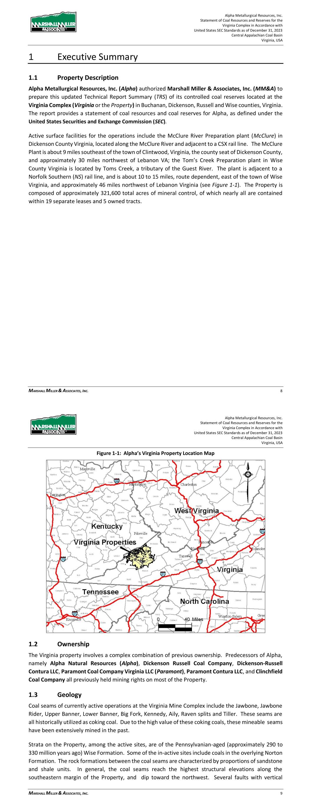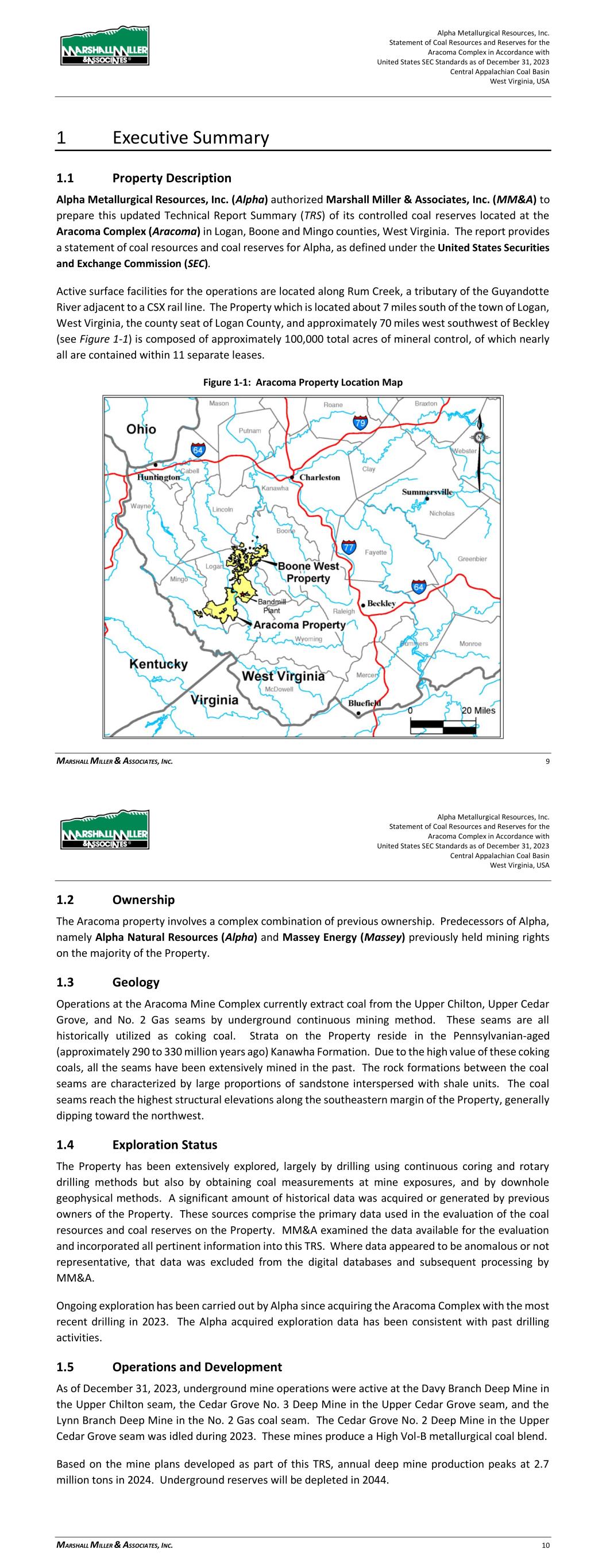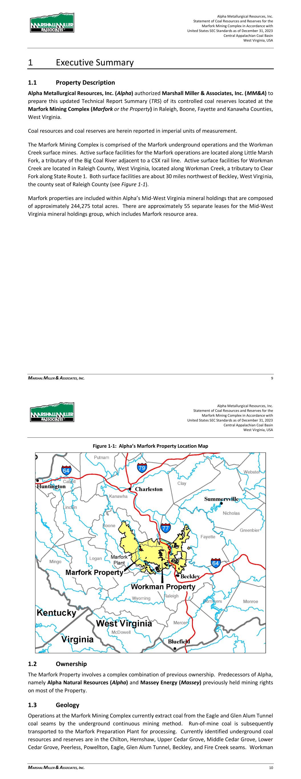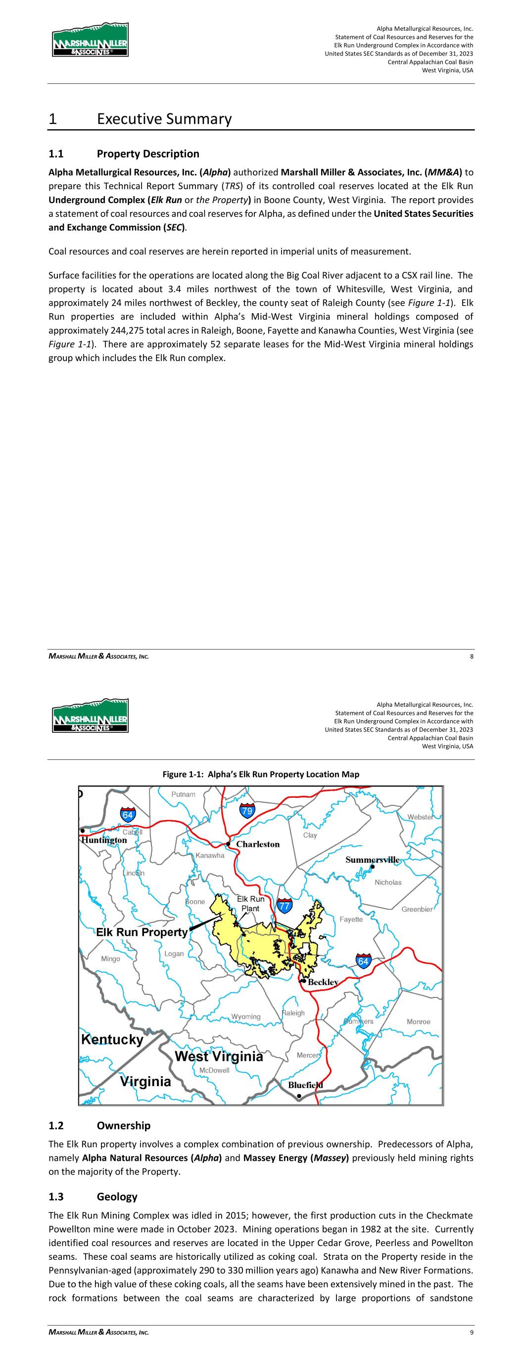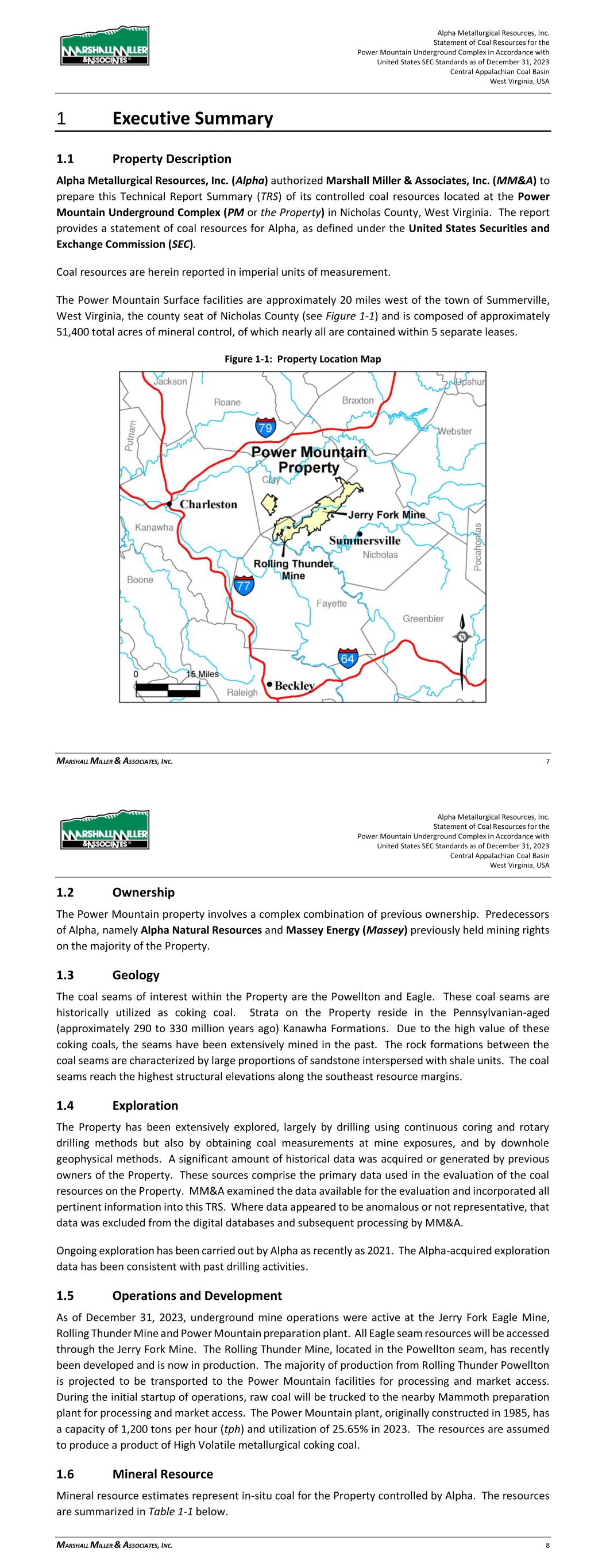 Alpha Metallurgical Resources, Inc. Statement of Coal Resources for the Power Mountain Underground Complex in Accordance with United States SEC Standards as of December 31, 2023 Central Appalachian Coal Basin West Virginia, USA MARSHALL MILLER & ASSOCIATES, INC. 7 1 Executive Summary 1.1 Property Description Alpha Metallurgical Resources, Inc. (Alpha) authorized Marshall Miller & Associates, Inc. (MM&A) to prepare this Technical Report Summary (TRS) of its controlled coal resources located at the Power Mountain Underground Complex (PM or the Property) in Nicholas County, West Virginia. The report provides a statement of coal resources for Alpha, as defined under the United States Securities and Exchange Commission (SEC). Coal resources are herein reported in imperial units of measurement. The Power Mountain Surface facilities are approximately 20 miles west of the town of Summerville, West Virginia, the county seat of Nicholas County (see Figure 1-1) and is composed of approximately 51,400 total acres of mineral control, of which nearly all are contained within 5 separate leases. Figure 1-1: Property Location Map Alpha Metallurgical Resources, Inc. Statement of Coal Resources for the Power Mountain Underground Complex in Accordance with United States SEC Standards as of December 31, 2023 Central Appalachian Coal Basin West Virginia, USA MARSHALL MILLER & ASSOCIATES, INC. 8 1.2 Ownership The Power Mountain property involves a complex combination of previous ownership. Predecessors of Alpha, namely Alpha Natural Resources and Massey Energy (Massey) previously held mining rights on the majority of the Property. 1.3 Geology The coal seams of interest within the Property are the Powellton and Eagle. These coal seams are historically utilized as coking coal. Strata on the Property reside in the Pennsylvanian-aged (approximately 290 to 330 million years ago) Kanawha Formations. Due to the high value of these coking coals, the seams have been extensively mined in the past. The rock formations between the coal seams are characterized by large proportions of sandstone interspersed with shale units. The coal seams reach the highest structural elevations along the southeast resource margins. 1.4 Exploration The Property has been extensively explored, largely by drilling using continuous coring and rotary drilling methods but also by obtaining coal measurements at mine exposures, and by downhole geophysical methods. A significant amount of historical data was acquired or generated by previous owners of the Property. These sources comprise the primary data used in the evaluation of the coal resources on the Property. MM&A examined the data available for the evaluation and incorporated all pertinent information into this TRS. Where data appeared to be anomalous or not representative, that data was excluded from the digital databases and subsequent processing by MM&A. Ongoing exploration has been carried out by Alpha as recently as 2021. The Alpha-acquired exploration data has been consistent with past drilling activities. 1.5 Operations and Development As of December 31, 2023, underground mine operations were active at the Jerry Fork Eagle Mine, Rolling Thunder Mine and Power Mountain preparation plant. All Eagle seam resources will be accessed through the Jerry Fork Mine. The Rolling Thunder Mine, located in the Powellton seam, has recently been developed and is now in production. The majority of production from Rolling Thunder Powellton is projected to be transported to the Power Mountain facilities for processing and market access. During the initial startup of operations, raw coal will be trucked to the nearby Mammoth preparation plant for processing and market access. The Power Mountain plant, originally constructed in 1985, has a capacity of 1,200 tons per hour (tph) and utilization of 25.65% in 2023. The resources are assumed to produce a product of High Volatile metallurgical coking coal. 1.6 Mineral Resource Mineral resource estimates represent in-situ coal for the Property controlled by Alpha. The resources are summarized in Table 1-1 below.
