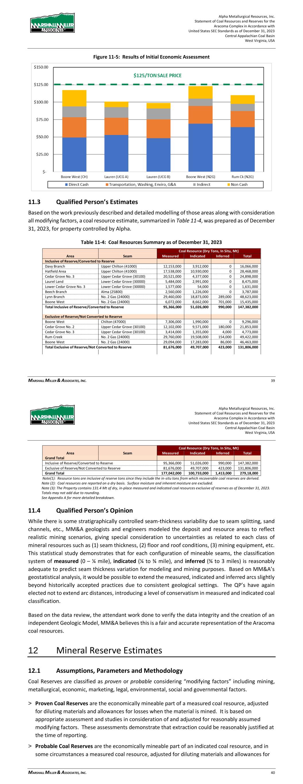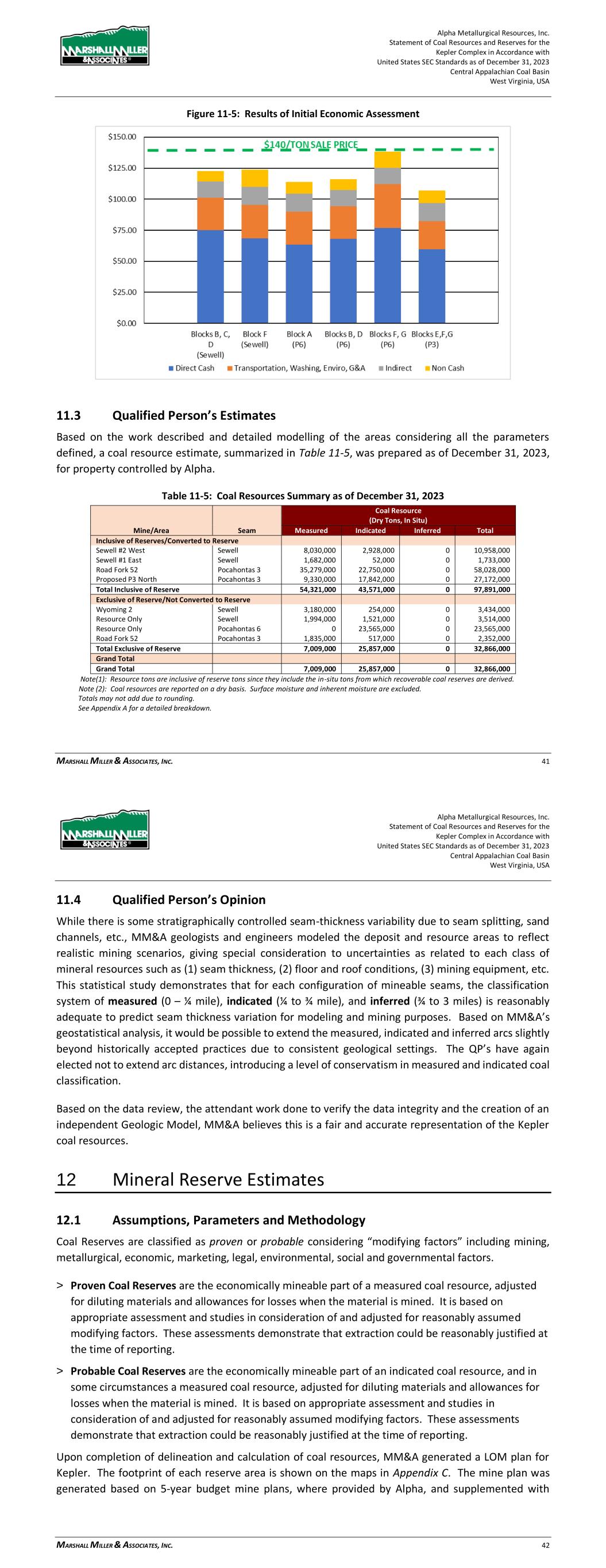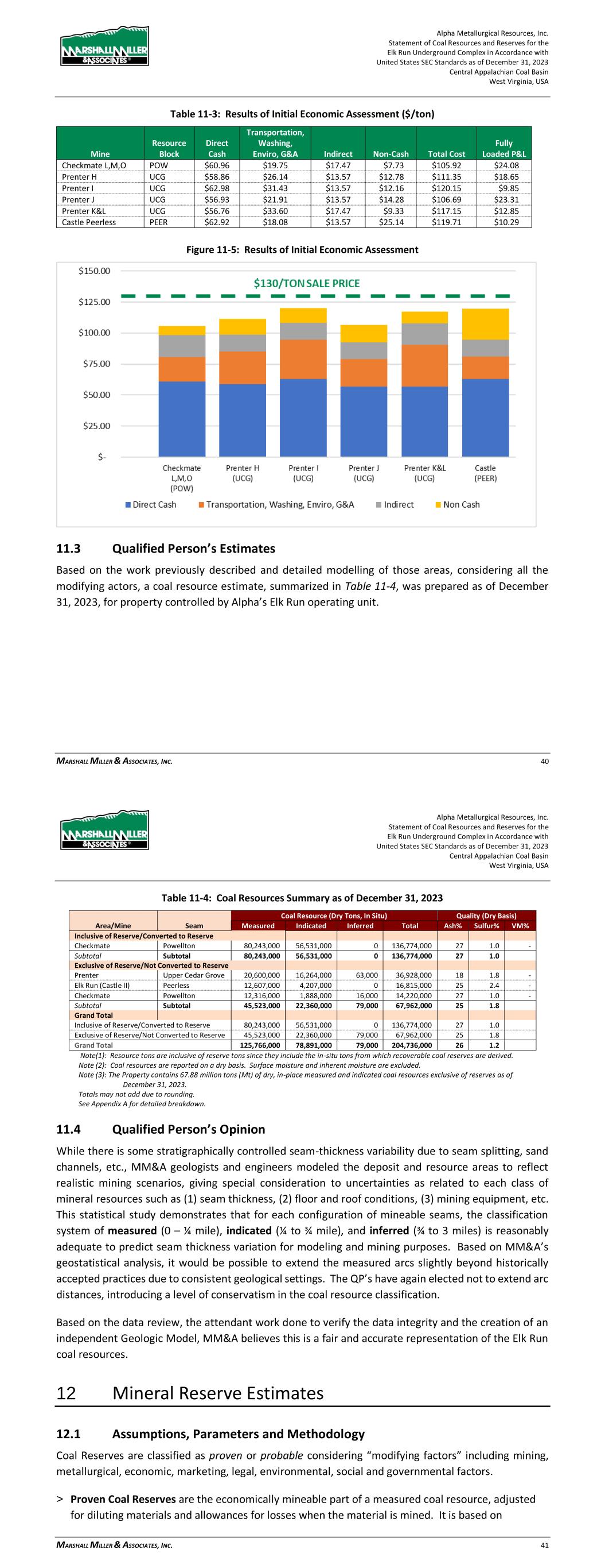 Alpha Metallurgical Resources, Inc. Statement of Coal Resources and Reserves for the Elk Run Underground Complex in Accordance with United States SEC Standards as of December 31, 2023 Central Appalachian Coal Basin West Virginia, USA MARSHALL MILLER & ASSOCIATES, INC. 40 Table 11-3: Results of Initial Economic Assessment ($/ton) Mine Resource Block Direct Cash Transportation, Washing, Enviro, G&A Indirect Non-Cash Total Cost Fully Loaded P&L Checkmate L,M,O POW $60.96 $19.75 $17.47 $7.73 $105.92 $24.08 Prenter H UCG $58.86 $26.14 $13.57 $12.78 $111.35 $18.65 Prenter I UCG $62.98 $31.43 $13.57 $12.16 $120.15 $9.85 Prenter J UCG $56.93 $21.91 $13.57 $14.28 $106.69 $23.31 Prenter K&L UCG $56.76 $33.60 $17.47 $9.33 $117.15 $12.85 Castle Peerless PEER $62.92 $18.08 $13.57 $25.14 $119.71 $10.29 Figure 11-5: Results of Initial Economic Assessment 11.3 Qualified Person’s Estimates Based on the work previously described and detailed modelling of those areas, considering all the modifying actors, a coal resource estimate, summarized in Table 11-4, was prepared as of December 31, 2023, for property controlled by Alpha’s Elk Run operating unit. Alpha Metallurgical Resources, Inc. Statement of Coal Resources and Reserves for the Elk Run Underground Complex in Accordance with United States SEC Standards as of December 31, 2023 Central Appalachian Coal Basin West Virginia, USA MARSHALL MILLER & ASSOCIATES, INC. 41 Table 11-4: Coal Resources Summary as of December 31, 2023 Coal Resource (Dry Tons, In Situ) Quality (Dry Basis) Area/Mine Seam Measured Indicated Inferred Total Ash% Sulfur% VM% Inclusive of Reserve/Converted to Reserve Checkmate Powellton 80,243,000 56,531,000 0 136,774,000 27 1.0 - Subtotal Subtotal 80,243,000 56,531,000 0 136,774,000 27 1.0 Exclusive of Reserve/Not Converted to Reserve Prenter Upper Cedar Grove 20,600,000 16,264,000 63,000 36,928,000 18 1.8 - Elk Run (Castle II) Peerless 12,607,000 4,207,000 0 16,815,000 25 2.4 - Checkmate Powellton 12,316,000 1,888,000 16,000 14,220,000 27 1.0 - Subtotal Subtotal 45,523,000 22,360,000 79,000 67,962,000 25 1.8 Grand Total Inclusive of Reserve/Converted to Reserve 80,243,000 56,531,000 0 136,774,000 27 1.0 Exclusive of Reserve/Not Converted to Reserve 45,523,000 22,360,000 79,000 67,962,000 25 1.8 Grand Total 125,766,000 78,891,000 79,000 204,736,000 26 1.2 Note(1): Resource tons are inclusive of reserve tons since they include the in-situ tons from which recoverable coal reserves are derived. Note (2): Coal resources are reported on a dry basis. Surface moisture and inherent moisture are excluded. Note (3): The Property contains 67.88 million tons (Mt) of dry, in-place measured and indicated coal resources exclusive of reserves as of December 31, 2023. Totals may not add due to rounding. See Appendix A for detailed breakdown. 11.4 Qualified Person’s Opinion While there is some stratigraphically controlled seam-thickness variability due to seam splitting, sand channels, etc., MM&A geologists and engineers modeled the deposit and resource areas to reflect realistic mining scenarios, giving special consideration to uncertainties as related to each class of mineral resources such as (1) seam thickness, (2) floor and roof conditions, (3) mining equipment, etc. This statistical study demonstrates that for each configuration of mineable seams, the classification system of measured (0 – ¼ mile), indicated (¼ to ¾ mile), and inferred (¾ to 3 miles) is reasonably adequate to predict seam thickness variation for modeling and mining purposes. Based on MM&A’s geostatistical analysis, it would be possible to extend the measured arcs slightly beyond historically accepted practices due to consistent geological settings. The QP’s have again elected not to extend arc distances, introducing a level of conservatism in the coal resource classification. Based on the data review, the attendant work done to verify the data integrity and the creation of an independent Geologic Model, MM&A believes this is a fair and accurate representation of the Elk Run coal resources. 12 Mineral Reserve Estimates 12.1 Assumptions, Parameters and Methodology Coal Reserves are classified as proven or probable considering “modifying factors” including mining, metallurgical, economic, marketing, legal, environmental, social and governmental factors. > Proven Coal Reserves are the economically mineable part of a measured coal resource, adjusted for diluting materials and allowances for losses when the material is mined. It is based on