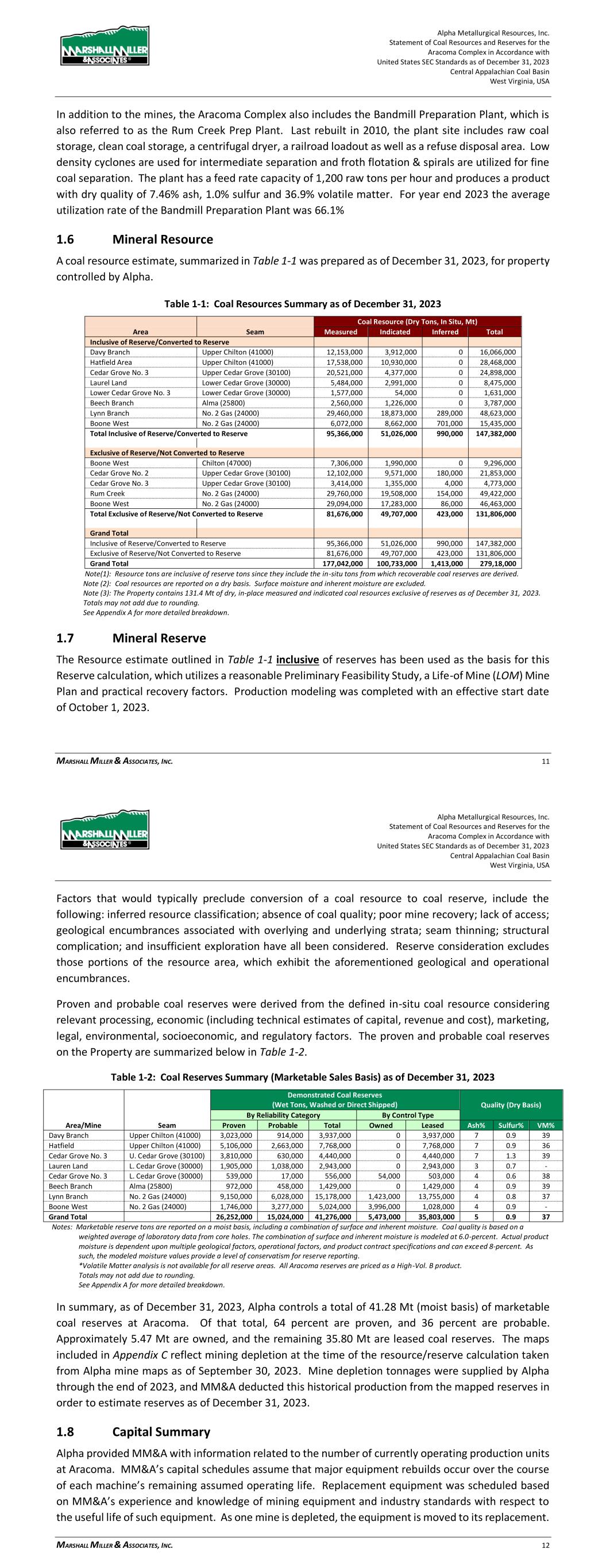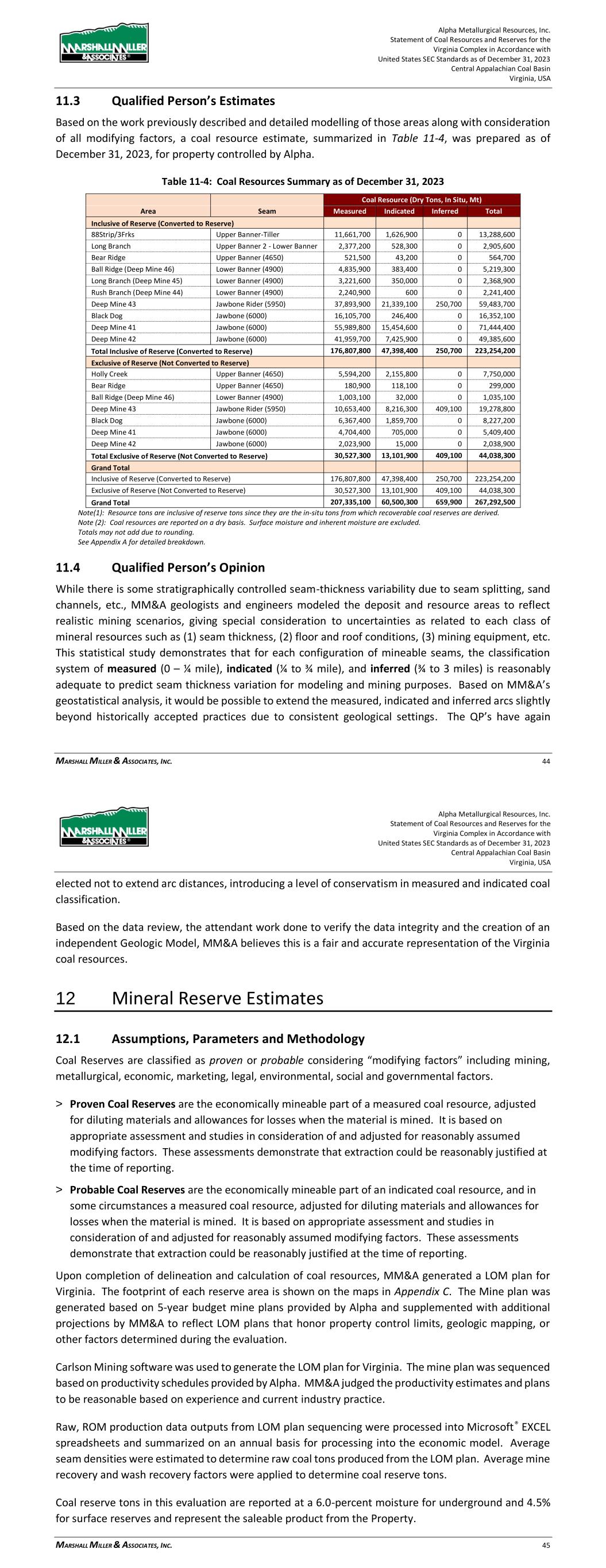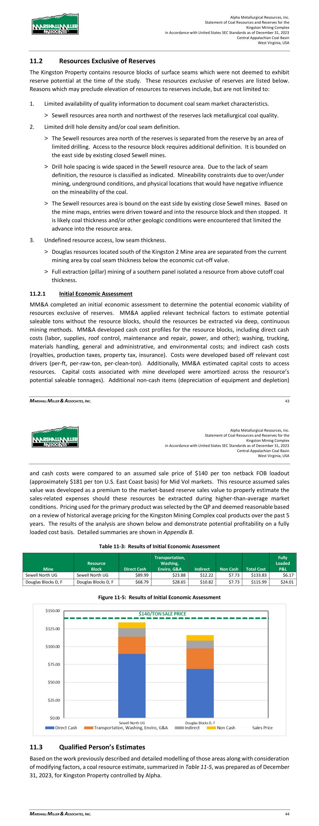 Alpha Metallurgical Resources, Inc. Statement of Coal Resources and Reserves for the Elk Run Underground Complex in Accordance with United States SEC Standards as of December 31, 2023 Central Appalachian Coal Basin West Virginia, USA MARSHALL MILLER & ASSOCIATES, INC. 40 Table 11-3: Results of Initial Economic Assessment ($/ton) Mine Resource Block Direct Cash Transportation, Washing, Enviro, G&A Indirect Non-Cash Total Cost Fully Loaded P&L Checkmate L,M,O POW $60.96 $19.75 $17.47 $7.73 $105.92 $24.08 Prenter H UCG $58.86 $26.14 $13.57 $12.78 $111.35 $18.65 Prenter I UCG $62.98 $31.43 $13.57 $12.16 $120.15 $9.85 Prenter J UCG $56.93 $21.91 $13.57 $14.28 $106.69 $23.31 Prenter K&L UCG $56.76 $33.60 $17.47 $9.33 $117.15 $12.85 Castle Peerless PEER $62.92 $18.08 $13.57 $25.14 $119.71 $10.29 Figure 11-5: Results of Initial Economic Assessment 11.3 Qualified Person’s Estimates Based on the work previously described and detailed modelling of those areas, considering all the modifying actors, a coal resource estimate, summarized in Table 11-4, was prepared as of December 31, 2023, for property controlled by Alpha’s Elk Run operating unit. Alpha Metallurgical Resources, Inc. Statement of Coal Resources and Reserves for the Elk Run Underground Complex in Accordance with United States SEC Standards as of December 31, 2023 Central Appalachian Coal Basin West Virginia, USA MARSHALL MILLER & ASSOCIATES, INC. 41 Table 11-4: Coal Resources Summary as of December 31, 2023 Coal Resource (Dry Tons, In Situ) Quality (Dry Basis) Area/Mine Seam Measured Indicated Inferred Total Ash% Sulfur% VM% Inclusive of Reserve/Converted to Reserve Checkmate Powellton 80,243,000 56,531,000 0 136,774,000 27 1.0 - Subtotal Subtotal 80,243,000 56,531,000 0 136,774,000 27 1.0 Exclusive of Reserve/Not Converted to Reserve Prenter Upper Cedar Grove 20,600,000 16,264,000 63,000 36,928,000 18 1.8 - Elk Run (Castle II) Peerless 12,607,000 4,207,000 0 16,815,000 25 2.4 - Checkmate Powellton 12,316,000 1,888,000 16,000 14,220,000 27 1.0 - Subtotal Subtotal 45,523,000 22,360,000 79,000 67,962,000 25 1.8 Grand Total Inclusive of Reserve/Converted to Reserve 80,243,000 56,531,000 0 136,774,000 27 1.0 Exclusive of Reserve/Not Converted to Reserve 45,523,000 22,360,000 79,000 67,962,000 25 1.8 Grand Total 125,766,000 78,891,000 79,000 204,736,000 26 1.2 Note(1): Resource tons are inclusive of reserve tons since they include the in-situ tons from which recoverable coal reserves are derived. Note (2): Coal resources are reported on a dry basis. Surface moisture and inherent moisture are excluded. Note (3): The Property contains 67.88 million tons (Mt) of dry, in-place measured and indicated coal resources exclusive of reserves as of December 31, 2023. Totals may not add due to rounding. See Appendix A for detailed breakdown. 11.4 Qualified Person’s Opinion While there is some stratigraphically controlled seam-thickness variability due to seam splitting, sand channels, etc., MM&A geologists and engineers modeled the deposit and resource areas to reflect realistic mining scenarios, giving special consideration to uncertainties as related to each class of mineral resources such as (1) seam thickness, (2) floor and roof conditions, (3) mining equipment, etc. This statistical study demonstrates that for each configuration of mineable seams, the classification system of measured (0 – ¼ mile), indicated (¼ to ¾ mile), and inferred (¾ to 3 miles) is reasonably adequate to predict seam thickness variation for modeling and mining purposes. Based on MM&A’s geostatistical analysis, it would be possible to extend the measured arcs slightly beyond historically accepted practices due to consistent geological settings. The QP’s have again elected not to extend arc distances, introducing a level of conservatism in the coal resource classification. Based on the data review, the attendant work done to verify the data integrity and the creation of an independent Geologic Model, MM&A believes this is a fair and accurate representation of the Elk Run coal resources. 12 Mineral Reserve Estimates 12.1 Assumptions, Parameters and Methodology Coal Reserves are classified as proven or probable considering “modifying factors” including mining, metallurgical, economic, marketing, legal, environmental, social and governmental factors. > Proven Coal Reserves are the economically mineable part of a measured coal resource, adjusted for diluting materials and allowances for losses when the material is mined. It is based on