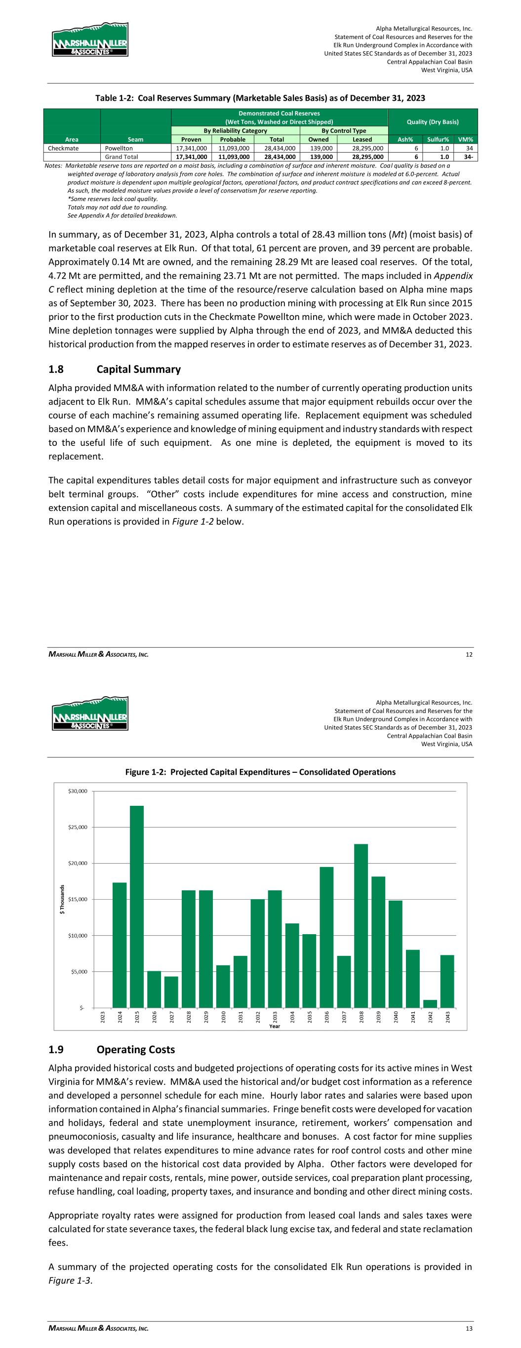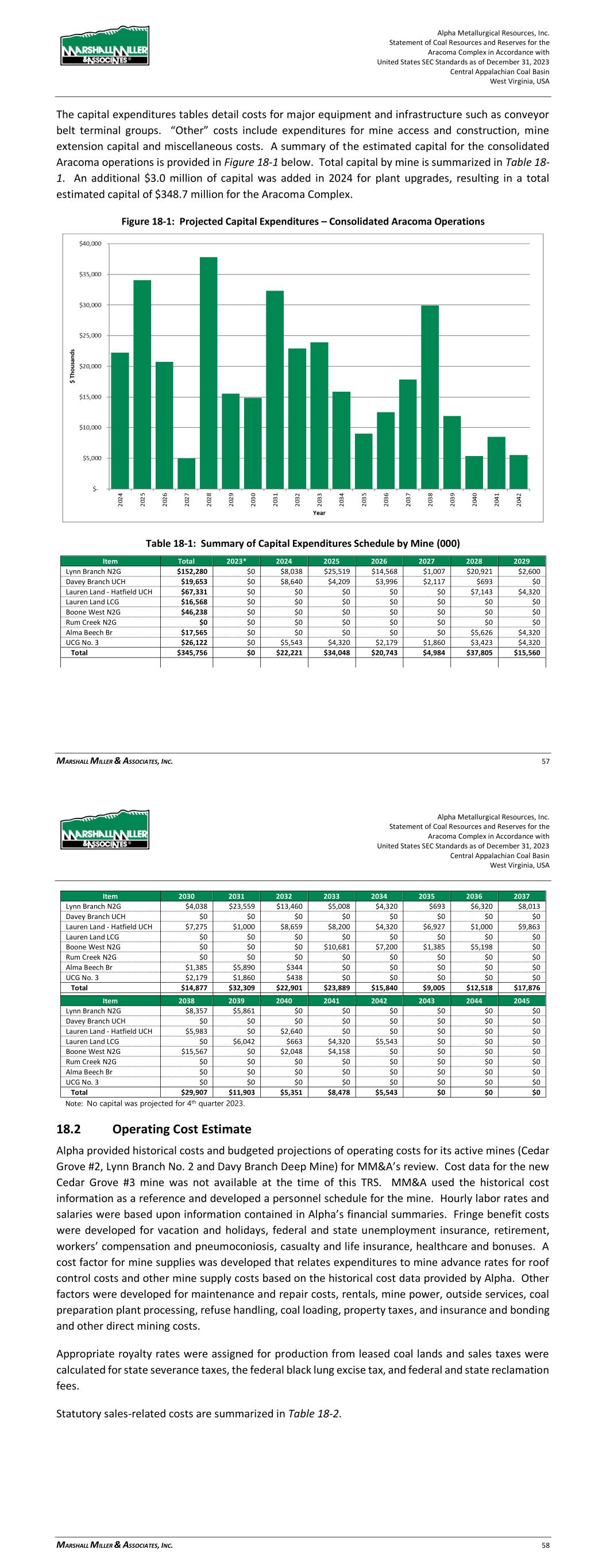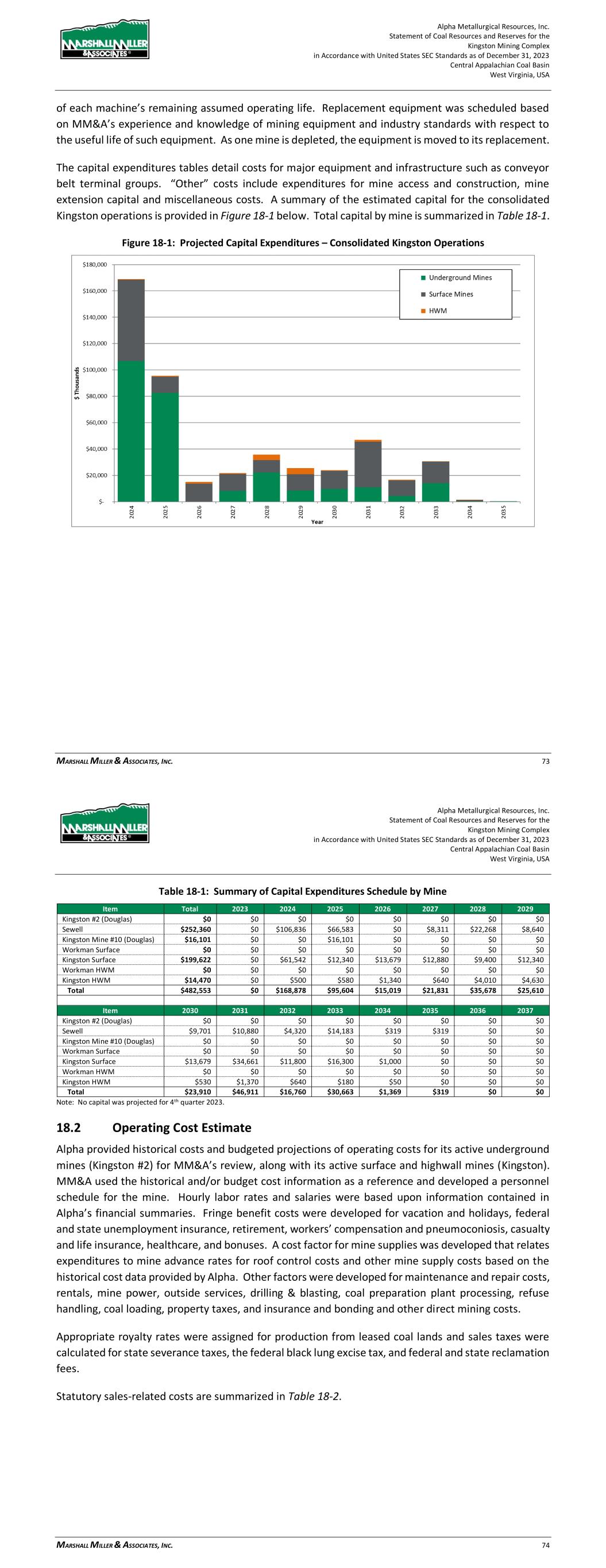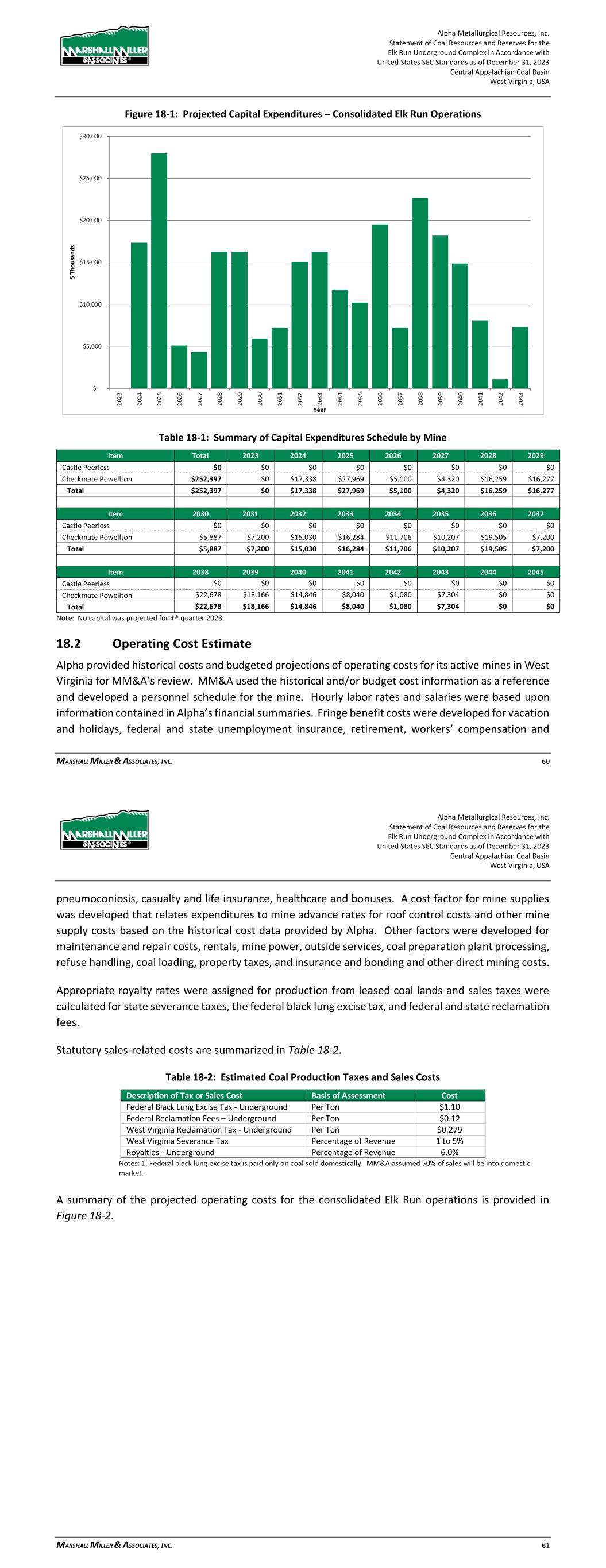 Alpha Metallurgical Resources, Inc. Statement of Coal Resources and Reserves for the Elk Run Underground Complex in Accordance with United States SEC Standards as of December 31, 2023 Central Appalachian Coal Basin West Virginia, USA MARSHALL MILLER & ASSOCIATES, INC. 60 Figure 18-1: Projected Capital Expenditures – Consolidated Elk Run Operations Table 18-1: Summary of Capital Expenditures Schedule by Mine Item Total 2023 2024 2025 2026 2027 2028 2029 Castle Peerless $0 $0 $0 $0 $0 $0 $0 $0 Checkmate Powellton $252,397 $0 $17,338 $27,969 $5,100 $4,320 $16,259 $16,277 Total $252,397 $0 $17,338 $27,969 $5,100 $4,320 $16,259 $16,277 Item 2030 2031 2032 2033 2034 2035 2036 2037 Castle Peerless $0 $0 $0 $0 $0 $0 $0 $0 Checkmate Powellton $5,887 $7,200 $15,030 $16,284 $11,706 $10,207 $19,505 $7,200 Total $5,887 $7,200 $15,030 $16,284 $11,706 $10,207 $19,505 $7,200 Item 2038 2039 2040 2041 2042 2043 2044 2045 Castle Peerless $0 $0 $0 $0 $0 $0 $0 $0 Checkmate Powellton $22,678 $18,166 $14,846 $8,040 $1,080 $7,304 $0 $0 Total $22,678 $18,166 $14,846 $8,040 $1,080 $7,304 $0 $0 Note: No capital was projected for 4th quarter 2023. 18.2 Operating Cost Estimate Alpha provided historical costs and budgeted projections of operating costs for its active mines in West Virginia for MM&A’s review. MM&A used the historical and/or budget cost information as a reference and developed a personnel schedule for the mine. Hourly labor rates and salaries were based upon information contained in Alpha’s financial summaries. Fringe benefit costs were developed for vacation and holidays, federal and state unemployment insurance, retirement, workers’ compensation and Alpha Metallurgical Resources, Inc. Statement of Coal Resources and Reserves for the Elk Run Underground Complex in Accordance with United States SEC Standards as of December 31, 2023 Central Appalachian Coal Basin West Virginia, USA MARSHALL MILLER & ASSOCIATES, INC. 61 pneumoconiosis, casualty and life insurance, healthcare and bonuses. A cost factor for mine supplies was developed that relates expenditures to mine advance rates for roof control costs and other mine supply costs based on the historical cost data provided by Alpha. Other factors were developed for maintenance and repair costs, rentals, mine power, outside services, coal preparation plant processing, refuse handling, coal loading, property taxes, and insurance and bonding and other direct mining costs. Appropriate royalty rates were assigned for production from leased coal lands and sales taxes were calculated for state severance taxes, the federal black lung excise tax, and federal and state reclamation fees. Statutory sales-related costs are summarized in Table 18-2. Table 18-2: Estimated Coal Production Taxes and Sales Costs Description of Tax or Sales Cost Basis of Assessment Cost Federal Black Lung Excise Tax - Underground Per Ton $1.10 Federal Reclamation Fees – Underground Per Ton $0.12 West Virginia Reclamation Tax - Underground Per Ton $0.279 West Virginia Severance Tax Percentage of Revenue 1 to 5% Royalties - Underground Percentage of Revenue 6.0% Notes: 1. Federal black lung excise tax is paid only on coal sold domestically. MM&A assumed 50% of sales will be into domestic market. A summary of the projected operating costs for the consolidated Elk Run operations is provided in Figure 18-2.