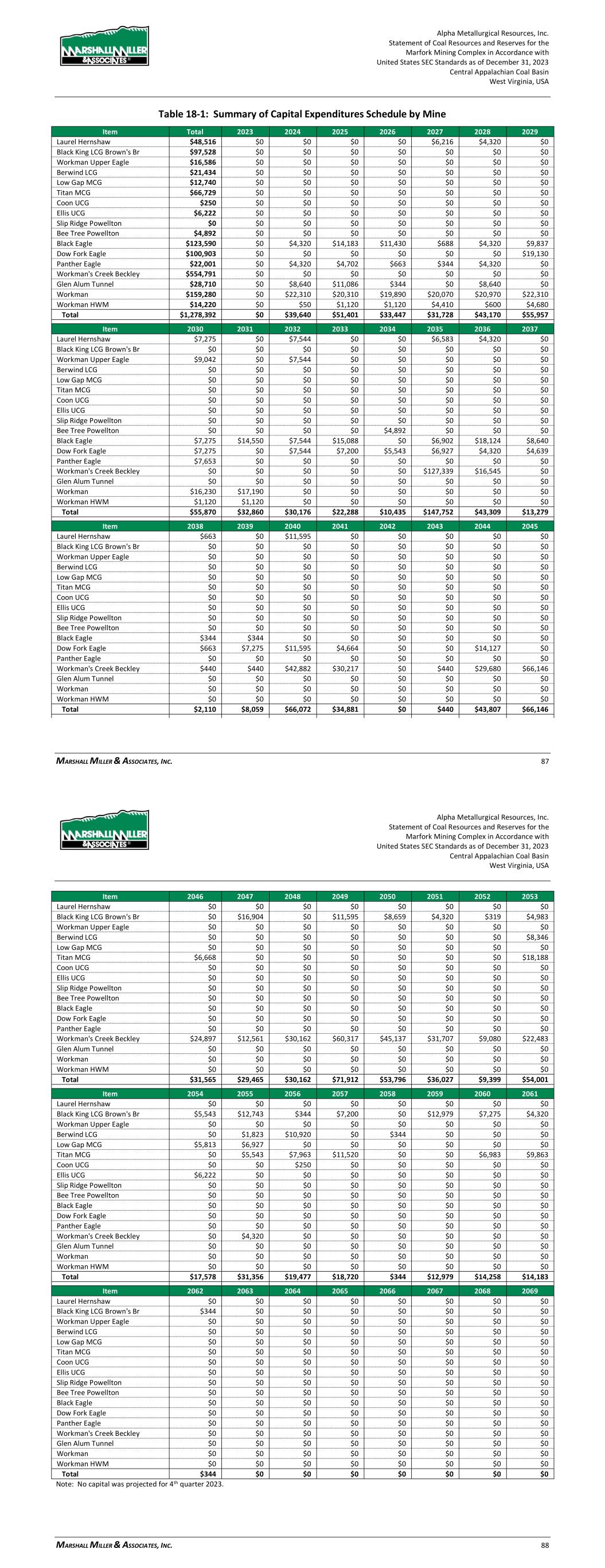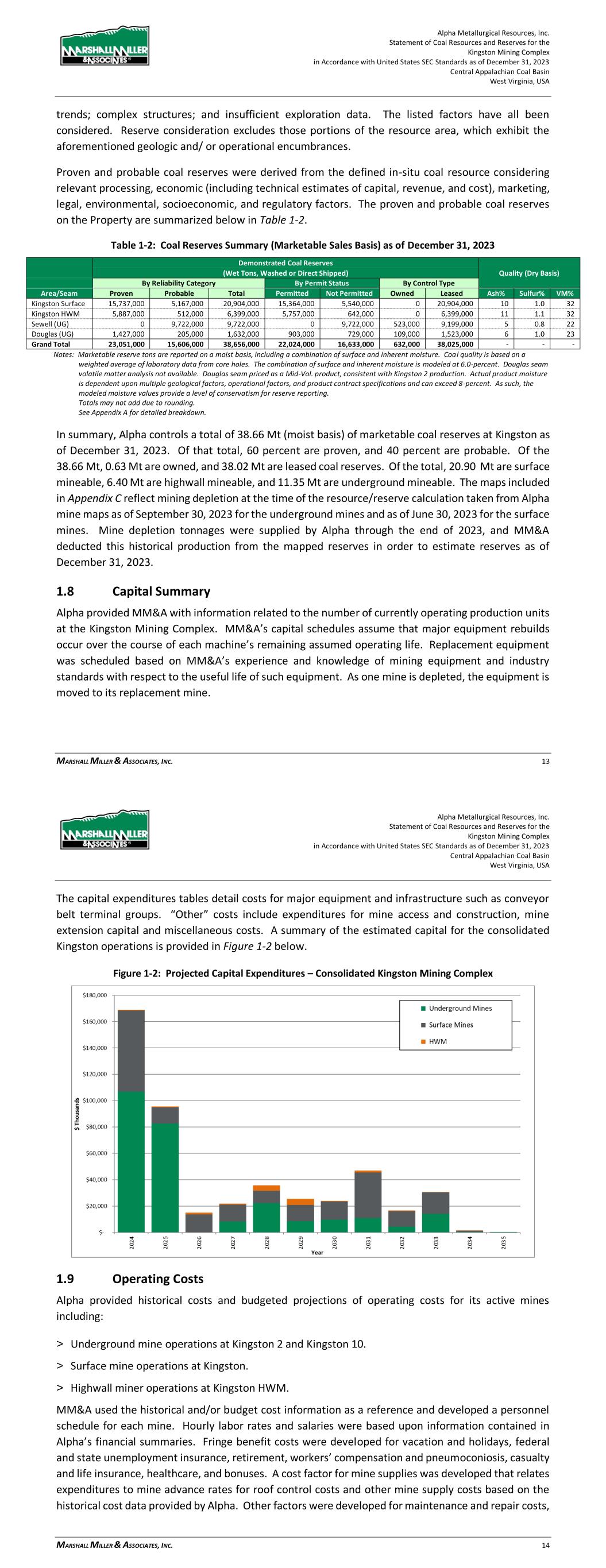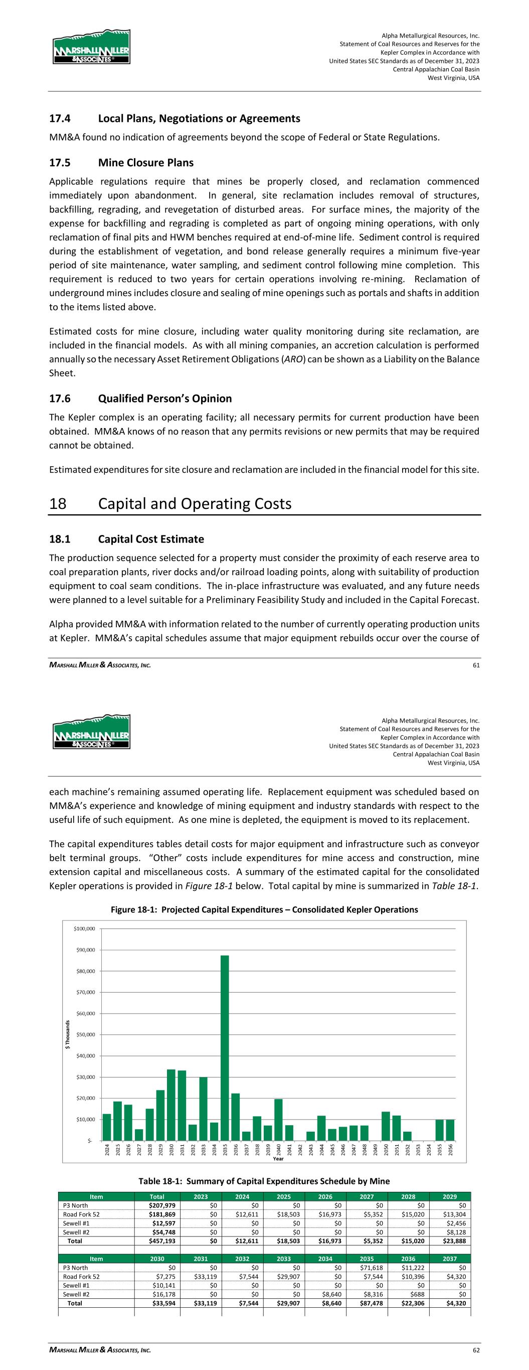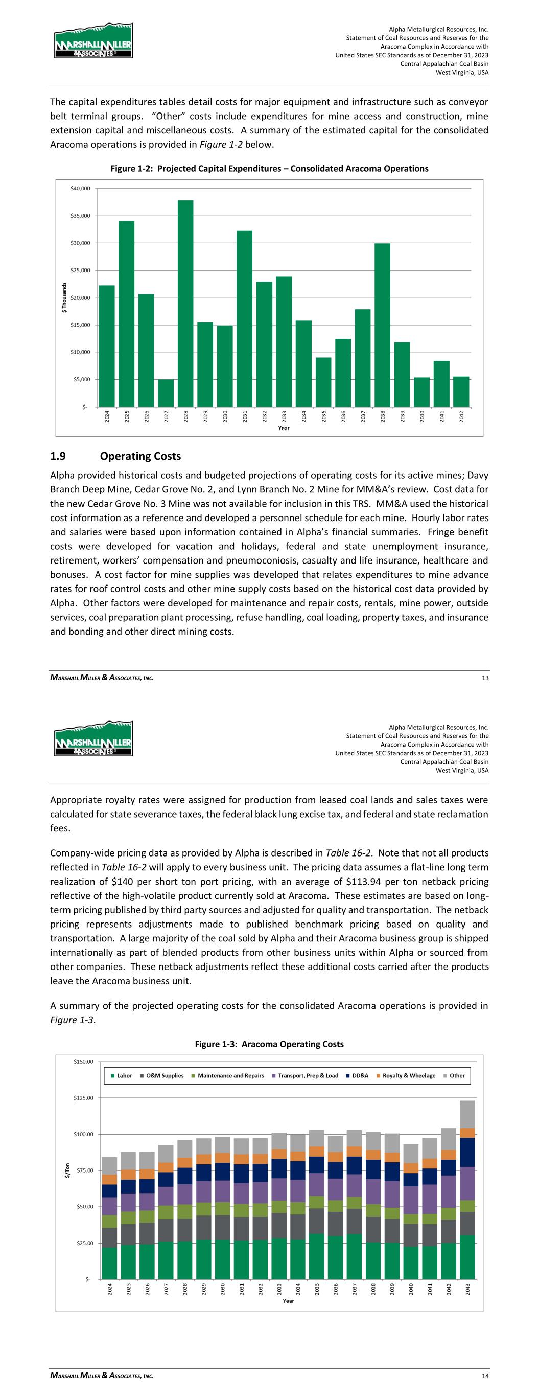 Alpha Metallurgical Resources, Inc. Statement of Coal Resources and Reserves for the Elk Run Underground Complex in Accordance with United States SEC Standards as of December 31, 2023 Central Appalachian Coal Basin West Virginia, USA MARSHALL MILLER & ASSOCIATES, INC. 60 Figure 18-1: Projected Capital Expenditures – Consolidated Elk Run Operations Table 18-1: Summary of Capital Expenditures Schedule by Mine Item Total 2023 2024 2025 2026 2027 2028 2029 Castle Peerless $0 $0 $0 $0 $0 $0 $0 $0 Checkmate Powellton $252,397 $0 $17,338 $27,969 $5,100 $4,320 $16,259 $16,277 Total $252,397 $0 $17,338 $27,969 $5,100 $4,320 $16,259 $16,277 Item 2030 2031 2032 2033 2034 2035 2036 2037 Castle Peerless $0 $0 $0 $0 $0 $0 $0 $0 Checkmate Powellton $5,887 $7,200 $15,030 $16,284 $11,706 $10,207 $19,505 $7,200 Total $5,887 $7,200 $15,030 $16,284 $11,706 $10,207 $19,505 $7,200 Item 2038 2039 2040 2041 2042 2043 2044 2045 Castle Peerless $0 $0 $0 $0 $0 $0 $0 $0 Checkmate Powellton $22,678 $18,166 $14,846 $8,040 $1,080 $7,304 $0 $0 Total $22,678 $18,166 $14,846 $8,040 $1,080 $7,304 $0 $0 Note: No capital was projected for 4th quarter 2023. 18.2 Operating Cost Estimate Alpha provided historical costs and budgeted projections of operating costs for its active mines in West Virginia for MM&A’s review. MM&A used the historical and/or budget cost information as a reference and developed a personnel schedule for the mine. Hourly labor rates and salaries were based upon information contained in Alpha’s financial summaries. Fringe benefit costs were developed for vacation and holidays, federal and state unemployment insurance, retirement, workers’ compensation and Alpha Metallurgical Resources, Inc. Statement of Coal Resources and Reserves for the Elk Run Underground Complex in Accordance with United States SEC Standards as of December 31, 2023 Central Appalachian Coal Basin West Virginia, USA MARSHALL MILLER & ASSOCIATES, INC. 61 pneumoconiosis, casualty and life insurance, healthcare and bonuses. A cost factor for mine supplies was developed that relates expenditures to mine advance rates for roof control costs and other mine supply costs based on the historical cost data provided by Alpha. Other factors were developed for maintenance and repair costs, rentals, mine power, outside services, coal preparation plant processing, refuse handling, coal loading, property taxes, and insurance and bonding and other direct mining costs. Appropriate royalty rates were assigned for production from leased coal lands and sales taxes were calculated for state severance taxes, the federal black lung excise tax, and federal and state reclamation fees. Statutory sales-related costs are summarized in Table 18-2. Table 18-2: Estimated Coal Production Taxes and Sales Costs Description of Tax or Sales Cost Basis of Assessment Cost Federal Black Lung Excise Tax - Underground Per Ton $1.10 Federal Reclamation Fees – Underground Per Ton $0.12 West Virginia Reclamation Tax - Underground Per Ton $0.279 West Virginia Severance Tax Percentage of Revenue 1 to 5% Royalties - Underground Percentage of Revenue 6.0% Notes: 1. Federal black lung excise tax is paid only on coal sold domestically. MM&A assumed 50% of sales will be into domestic market. A summary of the projected operating costs for the consolidated Elk Run operations is provided in Figure 18-2.