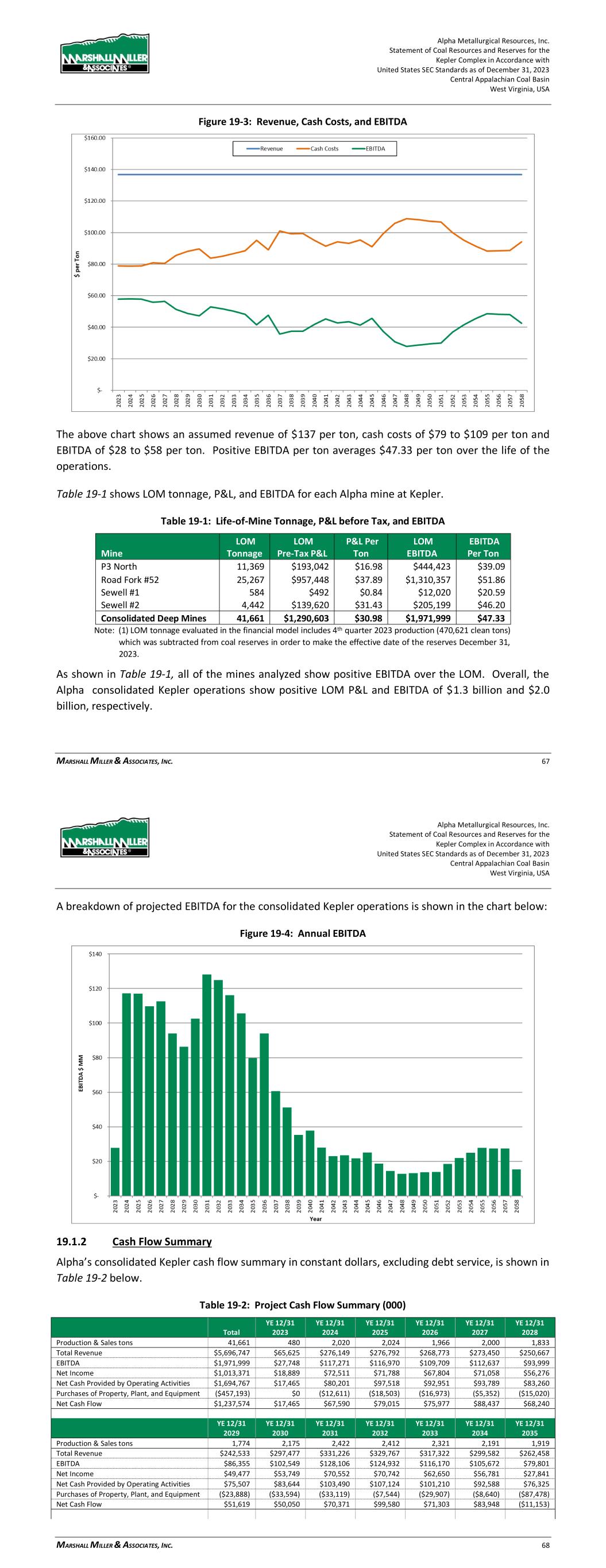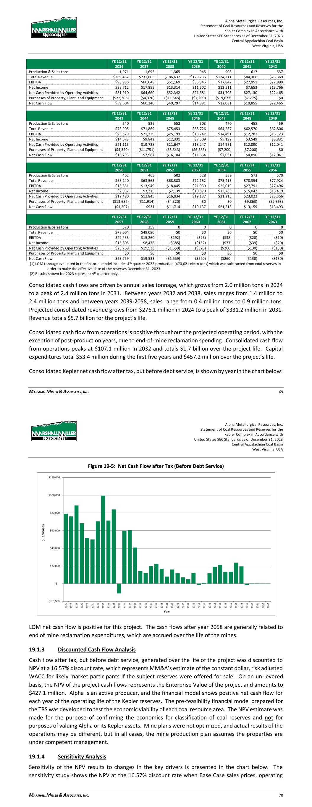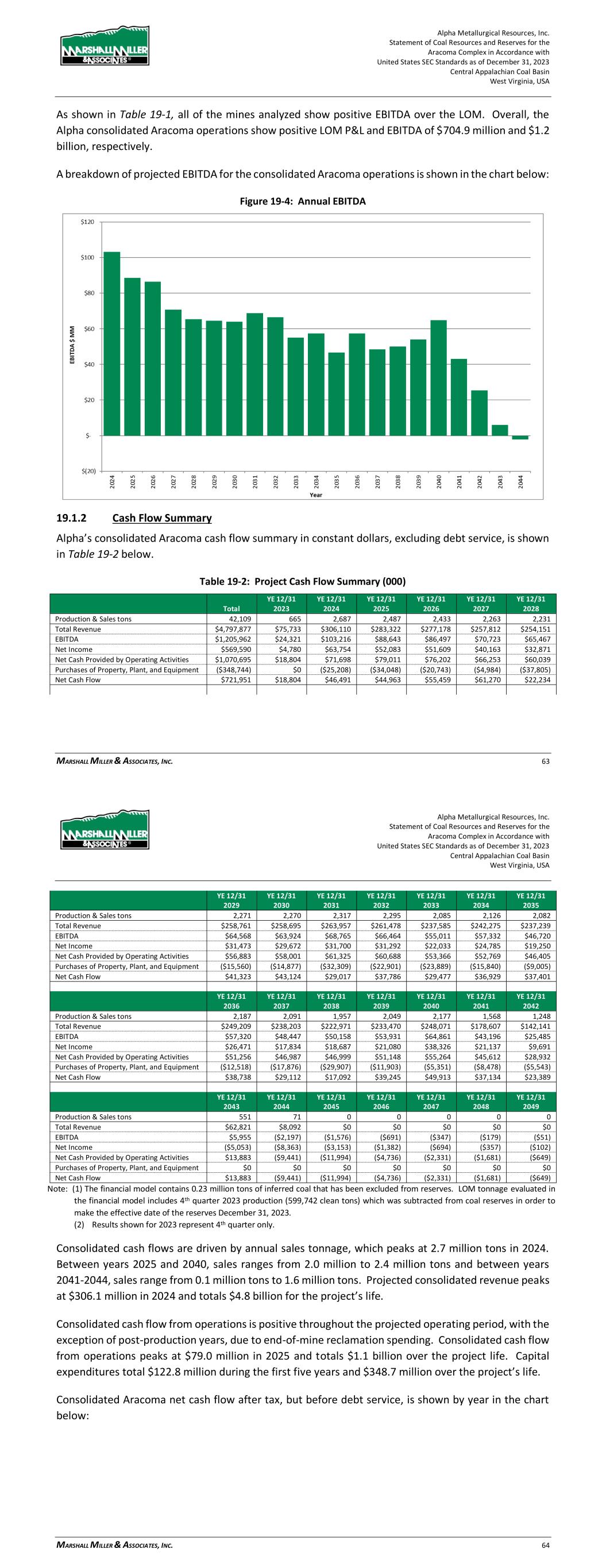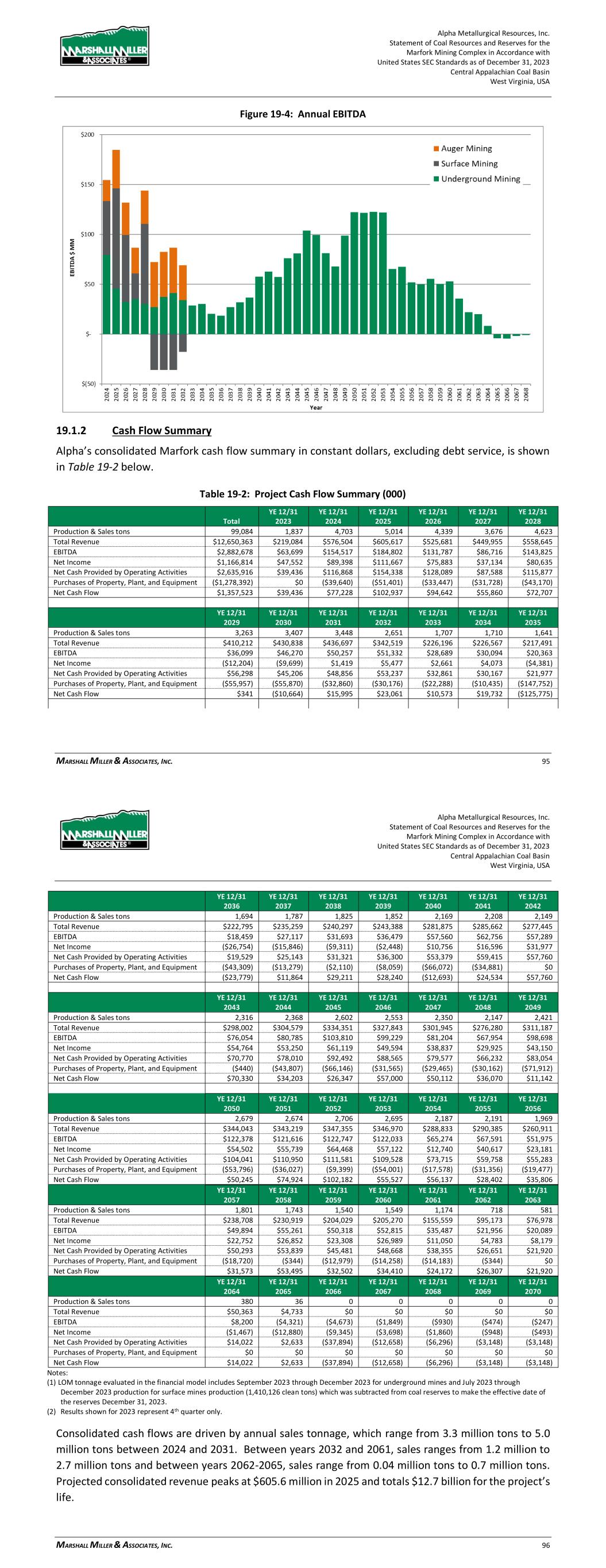 Alpha Metallurgical Resources, Inc. Statement of Coal Resources and Reserves for the Elk Run Underground Complex in Accordance with United States SEC Standards as of December 31, 2023 Central Appalachian Coal Basin West Virginia, USA MARSHALL MILLER & ASSOCIATES, INC. 66 Figure 19-4: Annual EBITDA 19.1.2 Cash Flow Summary Alpha’s consolidated Elk Run cash flow summary in constant dollars, excluding debt service, is shown in Table 19-2 below. Table 19-2: Project Cash Flow Summary (000) YE 12/31 YE 12/31 YE 12/31 YE 12/31 YE 12/31 YE 12/31 Total 2023 2024 2025 2026 2027 2028 Production & Sales tons 28,457 86 1,131 1,253 1,307 1,401 1,369 Total Revenue $3,242,361 $9,835 $128,881 $142,766 $148,947 $159,607 $155,944 EBITDA $462,803 ($74) $12,689 $21,247 $22,502 $22,885 $25,016 Net Income $9,991 ($1,397) ($6,283) ($2,466) ($476) $324 ($682) Net Cash Provided by Operating Activities $432,096 $646 $9,582 $20,227 $22,789 $23,900 $25,249 Purchases of Property, Plant, and Equipment ($252,397) $0 ($17,338) ($27,969) ($5,100) ($4,320) ($16,259) Net Cash Flow $179,699 $646 ($7,756) ($7,742) $17,689 $19,580 $8,990 YE 12/31 YE 12/31 YE 12/31 YE 12/31 YE 12/31 YE 12/31 YE 12/31 2029 2030 2031 2032 2033 2034 2035 Production & Sales tons 1,426 1,331 1,429 1,423 1,334 1,190 1,264 Total Revenue $162,449 $151,631 $162,827 $162,157 $152,049 $135,567 $143,998 EBITDA $32,463 $23,271 $33,122 $32,616 $23,808 $9,357 $15,046 Net Income $12,173 $3,762 $13,620 $14,642 $5,227 ($7,866) ($1,713) Net Cash Provided by Operating Activities $29,384 $24,690 $30,159 $31,361 $25,044 $13,886 $16,036 Purchases of Property, Plant, and Equipment ($16,277) ($5,887) ($7,200) ($15,030) ($16,284) ($11,706) ($10,207) Net Cash Flow $13,107 $18,803 $22,959 $16,331 $8,760 $2,179 $5,828 Alpha Metallurgical Resources, Inc. Statement of Coal Resources and Reserves for the Elk Run Underground Complex in Accordance with United States SEC Standards as of December 31, 2023 Central Appalachian Coal Basin West Virginia, USA MARSHALL MILLER & ASSOCIATES, INC. 67 YE 12/31 YE 12/31 YE 12/31 YE 12/31 YE 12/31 YE 12/31 YE 12/31 2036 2037 2038 2039 2040 2041 2042 Production & Sales tons 1,528 1,472 1,502 1,251 1,389 1,238 1,236 Total Revenue $174,124 $167,714 $171,141 $142,551 $158,220 $141,088 $140,820 EBITDA $33,043 $31,027 $32,973 $12,608 $24,272 $11,625 $12,005 Net Income $11,664 $9,510 $8,842 ($8,018) $1,493 ($8,683) ($7,241) Net Cash Provided by Operating Activities $28,442 $30,456 $31,626 $19,104 $23,352 $17,153 $15,452 Purchases of Property, Plant, and Equipment ($19,505) ($7,200) ($22,678) ($18,166) ($14,846) ($8,040) ($1,080) Net Cash Flow $8,937 $23,256 $8,948 $938 $8,505 $9,113 $14,372 YE 12/31 YE 12/31 YE 12/31 YE 12/31 YE 12/31 YE 12/31 YE 12/31 2043 2044 2045 2046 2047 2048 2049 Production & Sales tons 1,414 1,170 312 0 0 0 0 Total Revenue $161,150 $133,317 $35,578 $0 $0 $0 $0 EBITDA $25,191 $13,181 $589 ($4,376) ($1,732) ($874) ($445) Net Income $5,433 ($5,036) ($11,524) ($8,753) ($3,464) ($1,747) ($890) Net Cash Provided by Operating Activities $24,942 $18,290 $9,471 ($35,487) ($11,829) ($5,914) ($2,957) Purchases of Property, Plant, and Equipment ($7,304) $0 $0 $0 $0 $0 $0 Net Cash Flow $17,638 $18,290 $9,471 ($35,487) ($11,829) ($5,914) ($2,957) YE 12/31 YE 12/31 YE 12/31 YE 12/31 YE 12/31 YE 12/31 YE 12/31 2050 2051 2052 2053 2054 2055 2056 Production & Sales tons 0 0 0 0 0 0 0 Total Revenue $0 $0 $0 $0 $0 $0 $0 EBITDA ($232) ($0) ($0) ($0) ($0) ($0) ($0) Net Income ($463) ($0) ($0) ($0) ($0) ($0) ($0) Net Cash Provided by Operating Activities ($2,957) $0 $0 $0 $0 $0 $0 Purchases of Property, Plant, and Equipment $0 $0 $0 $0 $0 $0 $0 Net Cash Flow ($2,957) $0 $0 $0 $0 $0 $0 Notes: (1) The Castle II (Peerless) resource area failed to achieve positive results in the economic evaluation. Therefore, the coal tons and negative economic results for this area have been excluded from the estimate of coal reserves in this TRS and economic summary above. LOM tonnage evaluated in the financial model includes 4th quarter 2023 production (22,902 clean tons), which was subtracted from coal reserves in order to make the effective date of the reserves December 31, 2023. (2) Results shown for 2023 represent 4th quarter only. Consolidated cash flows are driven by annual sales tonnage, which grows from 1.1 million tons in 2024 to a peak of nearly 1.5 million tons in 2036. Between years 2037 and 2043, sales range from 1.2 million to 1.5 million tons and between years 2044-2045, sales range from 0.3 million tons to 1.2 million tons. Projected consolidated revenue grows from $128.9 million in 2024 to a peak of $174.1 million in 2036. Revenue totals $3.2 billion for the project’s life. Consolidated cash flow from operations is positive throughout the projected operating period, with the exception of post-production years, due to end-of-mine reclamation spending. Consolidated cash flow from operations peaks at $31.6 million in 2038 and totals $432.1 million over the project life. Capital expenditures total $71.0 million during the first five years and $252.4 million over the project’s life. Consolidated Elk Run net cash flow after tax, but before debt service, is shown by year in the chart below: