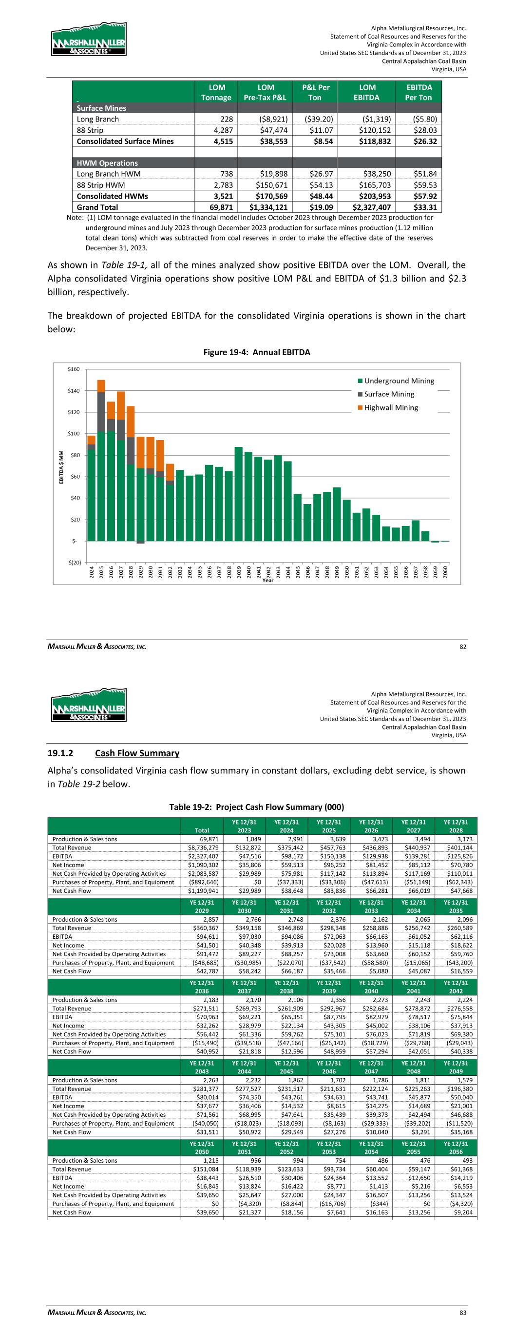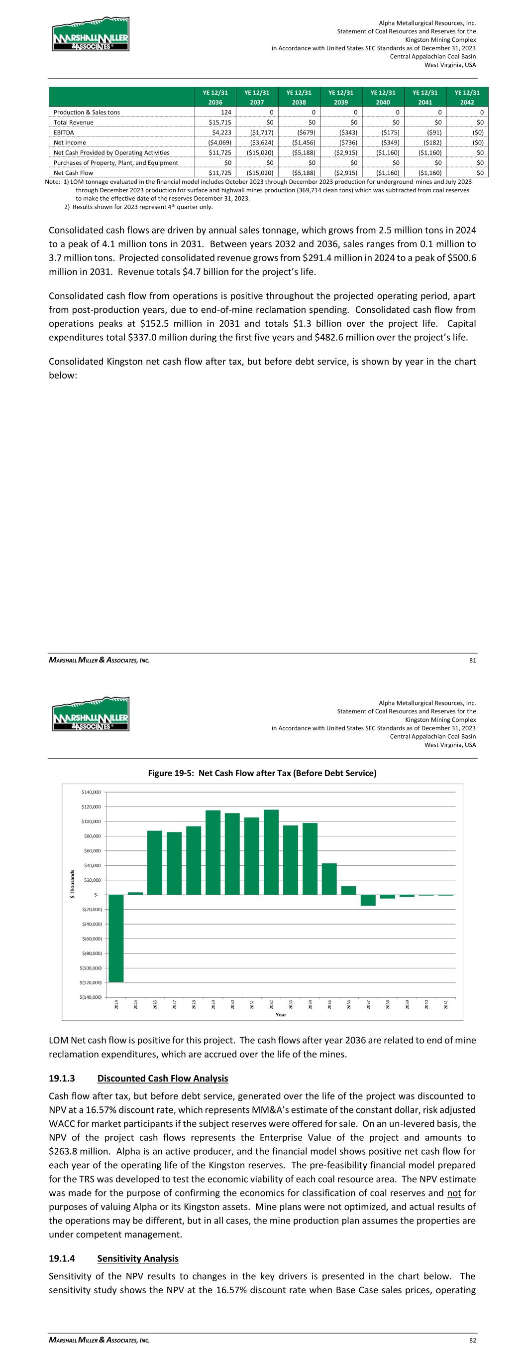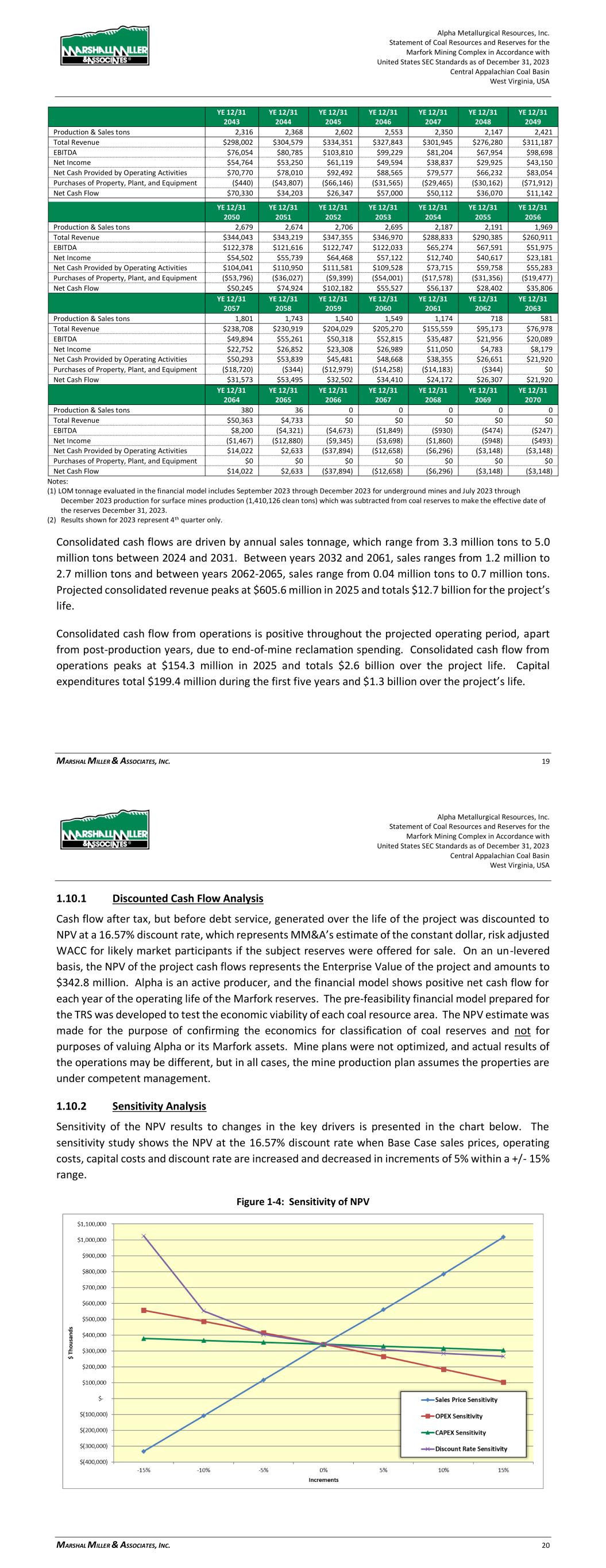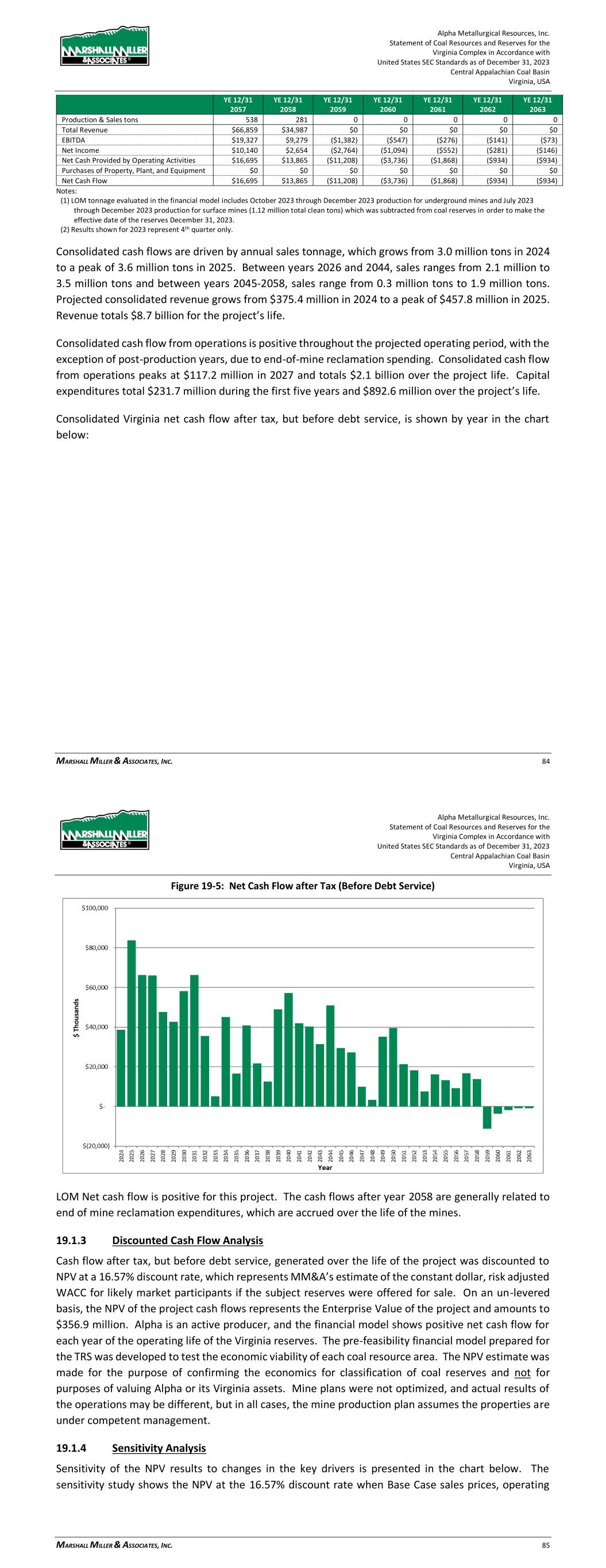 Alpha Metallurgical Resources, Inc. Statement of Coal Resources and Reserves for the Elk Run Underground Complex in Accordance with United States SEC Standards as of December 31, 2023 Central Appalachian Coal Basin West Virginia, USA MARSHALL MILLER & ASSOCIATES, INC. 66 Figure 19-4: Annual EBITDA 19.1.2 Cash Flow Summary Alpha’s consolidated Elk Run cash flow summary in constant dollars, excluding debt service, is shown in Table 19-2 below. Table 19-2: Project Cash Flow Summary (000) YE 12/31 YE 12/31 YE 12/31 YE 12/31 YE 12/31 YE 12/31 Total 2023 2024 2025 2026 2027 2028 Production & Sales tons 28,457 86 1,131 1,253 1,307 1,401 1,369 Total Revenue $3,242,361 $9,835 $128,881 $142,766 $148,947 $159,607 $155,944 EBITDA $462,803 ($74) $12,689 $21,247 $22,502 $22,885 $25,016 Net Income $9,991 ($1,397) ($6,283) ($2,466) ($476) $324 ($682) Net Cash Provided by Operating Activities $432,096 $646 $9,582 $20,227 $22,789 $23,900 $25,249 Purchases of Property, Plant, and Equipment ($252,397) $0 ($17,338) ($27,969) ($5,100) ($4,320) ($16,259) Net Cash Flow $179,699 $646 ($7,756) ($7,742) $17,689 $19,580 $8,990 YE 12/31 YE 12/31 YE 12/31 YE 12/31 YE 12/31 YE 12/31 YE 12/31 2029 2030 2031 2032 2033 2034 2035 Production & Sales tons 1,426 1,331 1,429 1,423 1,334 1,190 1,264 Total Revenue $162,449 $151,631 $162,827 $162,157 $152,049 $135,567 $143,998 EBITDA $32,463 $23,271 $33,122 $32,616 $23,808 $9,357 $15,046 Net Income $12,173 $3,762 $13,620 $14,642 $5,227 ($7,866) ($1,713) Net Cash Provided by Operating Activities $29,384 $24,690 $30,159 $31,361 $25,044 $13,886 $16,036 Purchases of Property, Plant, and Equipment ($16,277) ($5,887) ($7,200) ($15,030) ($16,284) ($11,706) ($10,207) Net Cash Flow $13,107 $18,803 $22,959 $16,331 $8,760 $2,179 $5,828 Alpha Metallurgical Resources, Inc. Statement of Coal Resources and Reserves for the Elk Run Underground Complex in Accordance with United States SEC Standards as of December 31, 2023 Central Appalachian Coal Basin West Virginia, USA MARSHALL MILLER & ASSOCIATES, INC. 67 YE 12/31 YE 12/31 YE 12/31 YE 12/31 YE 12/31 YE 12/31 YE 12/31 2036 2037 2038 2039 2040 2041 2042 Production & Sales tons 1,528 1,472 1,502 1,251 1,389 1,238 1,236 Total Revenue $174,124 $167,714 $171,141 $142,551 $158,220 $141,088 $140,820 EBITDA $33,043 $31,027 $32,973 $12,608 $24,272 $11,625 $12,005 Net Income $11,664 $9,510 $8,842 ($8,018) $1,493 ($8,683) ($7,241) Net Cash Provided by Operating Activities $28,442 $30,456 $31,626 $19,104 $23,352 $17,153 $15,452 Purchases of Property, Plant, and Equipment ($19,505) ($7,200) ($22,678) ($18,166) ($14,846) ($8,040) ($1,080) Net Cash Flow $8,937 $23,256 $8,948 $938 $8,505 $9,113 $14,372 YE 12/31 YE 12/31 YE 12/31 YE 12/31 YE 12/31 YE 12/31 YE 12/31 2043 2044 2045 2046 2047 2048 2049 Production & Sales tons 1,414 1,170 312 0 0 0 0 Total Revenue $161,150 $133,317 $35,578 $0 $0 $0 $0 EBITDA $25,191 $13,181 $589 ($4,376) ($1,732) ($874) ($445) Net Income $5,433 ($5,036) ($11,524) ($8,753) ($3,464) ($1,747) ($890) Net Cash Provided by Operating Activities $24,942 $18,290 $9,471 ($35,487) ($11,829) ($5,914) ($2,957) Purchases of Property, Plant, and Equipment ($7,304) $0 $0 $0 $0 $0 $0 Net Cash Flow $17,638 $18,290 $9,471 ($35,487) ($11,829) ($5,914) ($2,957) YE 12/31 YE 12/31 YE 12/31 YE 12/31 YE 12/31 YE 12/31 YE 12/31 2050 2051 2052 2053 2054 2055 2056 Production & Sales tons 0 0 0 0 0 0 0 Total Revenue $0 $0 $0 $0 $0 $0 $0 EBITDA ($232) ($0) ($0) ($0) ($0) ($0) ($0) Net Income ($463) ($0) ($0) ($0) ($0) ($0) ($0) Net Cash Provided by Operating Activities ($2,957) $0 $0 $0 $0 $0 $0 Purchases of Property, Plant, and Equipment $0 $0 $0 $0 $0 $0 $0 Net Cash Flow ($2,957) $0 $0 $0 $0 $0 $0 Notes: (1) The Castle II (Peerless) resource area failed to achieve positive results in the economic evaluation. Therefore, the coal tons and negative economic results for this area have been excluded from the estimate of coal reserves in this TRS and economic summary above. LOM tonnage evaluated in the financial model includes 4th quarter 2023 production (22,902 clean tons), which was subtracted from coal reserves in order to make the effective date of the reserves December 31, 2023. (2) Results shown for 2023 represent 4th quarter only. Consolidated cash flows are driven by annual sales tonnage, which grows from 1.1 million tons in 2024 to a peak of nearly 1.5 million tons in 2036. Between years 2037 and 2043, sales range from 1.2 million to 1.5 million tons and between years 2044-2045, sales range from 0.3 million tons to 1.2 million tons. Projected consolidated revenue grows from $128.9 million in 2024 to a peak of $174.1 million in 2036. Revenue totals $3.2 billion for the project’s life. Consolidated cash flow from operations is positive throughout the projected operating period, with the exception of post-production years, due to end-of-mine reclamation spending. Consolidated cash flow from operations peaks at $31.6 million in 2038 and totals $432.1 million over the project life. Capital expenditures total $71.0 million during the first five years and $252.4 million over the project’s life. Consolidated Elk Run net cash flow after tax, but before debt service, is shown by year in the chart below: