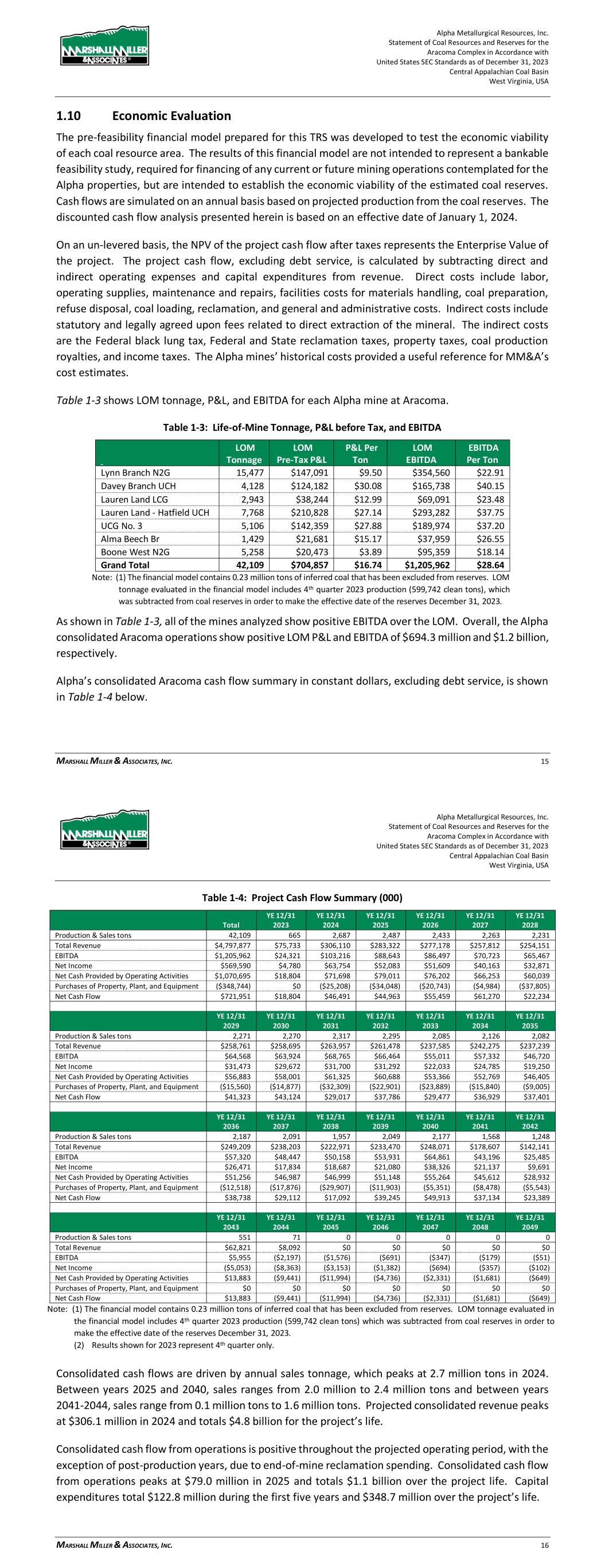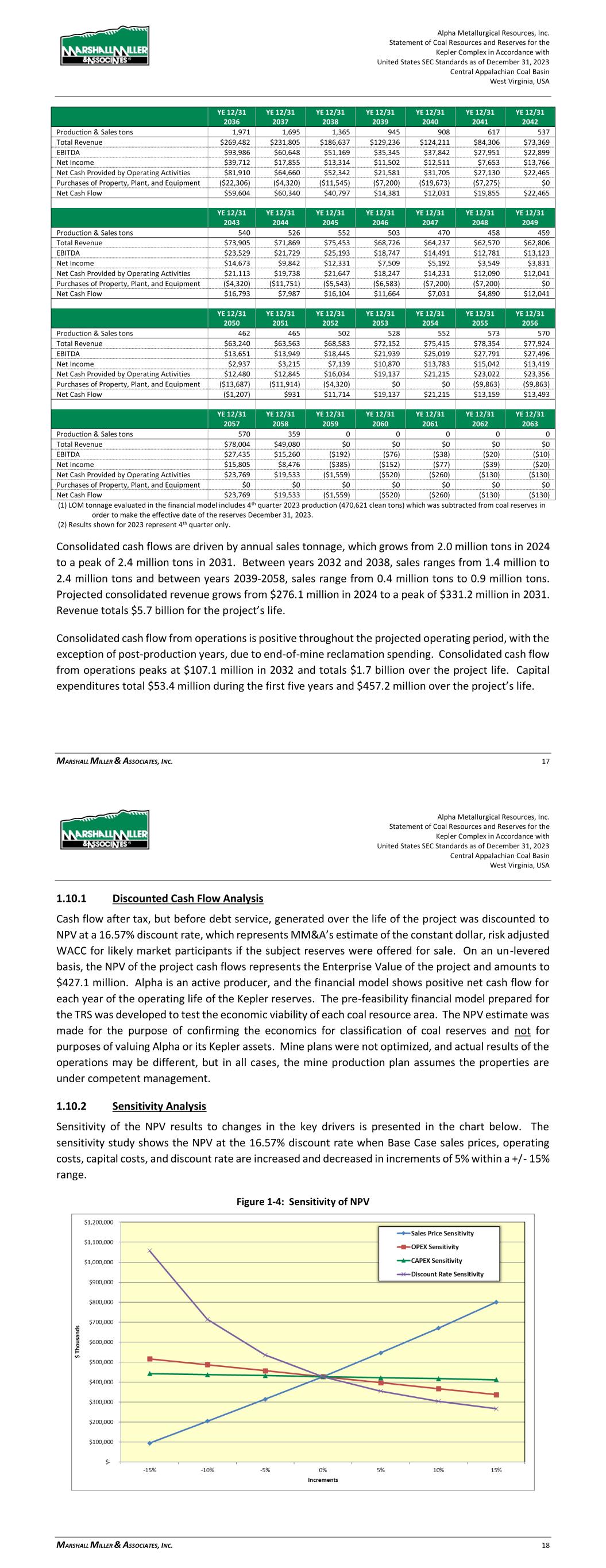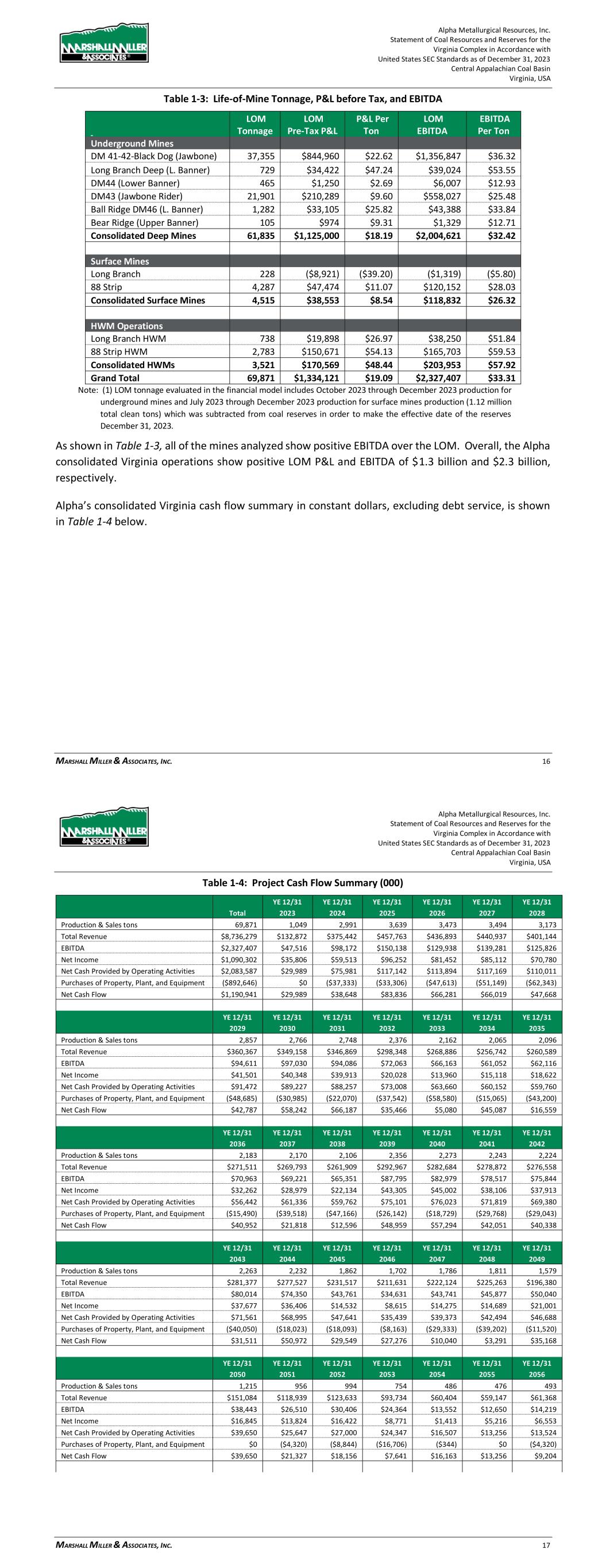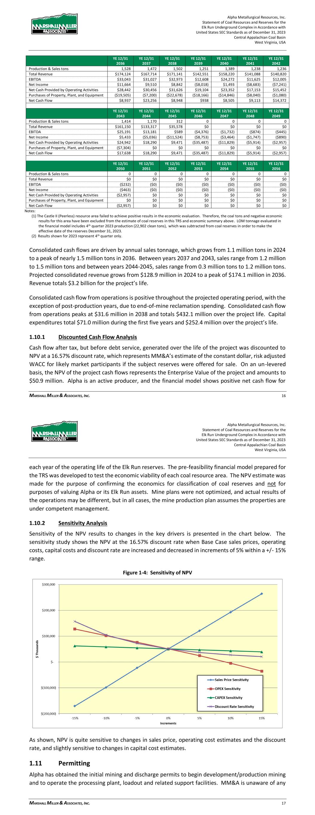 Alpha Metallurgical Resources, Inc. Statement of Coal Resources and Reserves for the Elk Run Underground Complex in Accordance with United States SEC Standards as of December 31, 2023 Central Appalachian Coal Basin West Virginia, USA MARSHALL MILLER & ASSOCIATES, INC. 66 Figure 19-4: Annual EBITDA 19.1.2 Cash Flow Summary Alpha’s consolidated Elk Run cash flow summary in constant dollars, excluding debt service, is shown in Table 19-2 below. Table 19-2: Project Cash Flow Summary (000) YE 12/31 YE 12/31 YE 12/31 YE 12/31 YE 12/31 YE 12/31 Total 2023 2024 2025 2026 2027 2028 Production & Sales tons 28,457 86 1,131 1,253 1,307 1,401 1,369 Total Revenue $3,242,361 $9,835 $128,881 $142,766 $148,947 $159,607 $155,944 EBITDA $462,803 ($74) $12,689 $21,247 $22,502 $22,885 $25,016 Net Income $9,991 ($1,397) ($6,283) ($2,466) ($476) $324 ($682) Net Cash Provided by Operating Activities $432,096 $646 $9,582 $20,227 $22,789 $23,900 $25,249 Purchases of Property, Plant, and Equipment ($252,397) $0 ($17,338) ($27,969) ($5,100) ($4,320) ($16,259) Net Cash Flow $179,699 $646 ($7,756) ($7,742) $17,689 $19,580 $8,990 YE 12/31 YE 12/31 YE 12/31 YE 12/31 YE 12/31 YE 12/31 YE 12/31 2029 2030 2031 2032 2033 2034 2035 Production & Sales tons 1,426 1,331 1,429 1,423 1,334 1,190 1,264 Total Revenue $162,449 $151,631 $162,827 $162,157 $152,049 $135,567 $143,998 EBITDA $32,463 $23,271 $33,122 $32,616 $23,808 $9,357 $15,046 Net Income $12,173 $3,762 $13,620 $14,642 $5,227 ($7,866) ($1,713) Net Cash Provided by Operating Activities $29,384 $24,690 $30,159 $31,361 $25,044 $13,886 $16,036 Purchases of Property, Plant, and Equipment ($16,277) ($5,887) ($7,200) ($15,030) ($16,284) ($11,706) ($10,207) Net Cash Flow $13,107 $18,803 $22,959 $16,331 $8,760 $2,179 $5,828 Alpha Metallurgical Resources, Inc. Statement of Coal Resources and Reserves for the Elk Run Underground Complex in Accordance with United States SEC Standards as of December 31, 2023 Central Appalachian Coal Basin West Virginia, USA MARSHALL MILLER & ASSOCIATES, INC. 67 YE 12/31 YE 12/31 YE 12/31 YE 12/31 YE 12/31 YE 12/31 YE 12/31 2036 2037 2038 2039 2040 2041 2042 Production & Sales tons 1,528 1,472 1,502 1,251 1,389 1,238 1,236 Total Revenue $174,124 $167,714 $171,141 $142,551 $158,220 $141,088 $140,820 EBITDA $33,043 $31,027 $32,973 $12,608 $24,272 $11,625 $12,005 Net Income $11,664 $9,510 $8,842 ($8,018) $1,493 ($8,683) ($7,241) Net Cash Provided by Operating Activities $28,442 $30,456 $31,626 $19,104 $23,352 $17,153 $15,452 Purchases of Property, Plant, and Equipment ($19,505) ($7,200) ($22,678) ($18,166) ($14,846) ($8,040) ($1,080) Net Cash Flow $8,937 $23,256 $8,948 $938 $8,505 $9,113 $14,372 YE 12/31 YE 12/31 YE 12/31 YE 12/31 YE 12/31 YE 12/31 YE 12/31 2043 2044 2045 2046 2047 2048 2049 Production & Sales tons 1,414 1,170 312 0 0 0 0 Total Revenue $161,150 $133,317 $35,578 $0 $0 $0 $0 EBITDA $25,191 $13,181 $589 ($4,376) ($1,732) ($874) ($445) Net Income $5,433 ($5,036) ($11,524) ($8,753) ($3,464) ($1,747) ($890) Net Cash Provided by Operating Activities $24,942 $18,290 $9,471 ($35,487) ($11,829) ($5,914) ($2,957) Purchases of Property, Plant, and Equipment ($7,304) $0 $0 $0 $0 $0 $0 Net Cash Flow $17,638 $18,290 $9,471 ($35,487) ($11,829) ($5,914) ($2,957) YE 12/31 YE 12/31 YE 12/31 YE 12/31 YE 12/31 YE 12/31 YE 12/31 2050 2051 2052 2053 2054 2055 2056 Production & Sales tons 0 0 0 0 0 0 0 Total Revenue $0 $0 $0 $0 $0 $0 $0 EBITDA ($232) ($0) ($0) ($0) ($0) ($0) ($0) Net Income ($463) ($0) ($0) ($0) ($0) ($0) ($0) Net Cash Provided by Operating Activities ($2,957) $0 $0 $0 $0 $0 $0 Purchases of Property, Plant, and Equipment $0 $0 $0 $0 $0 $0 $0 Net Cash Flow ($2,957) $0 $0 $0 $0 $0 $0 Notes: (1) The Castle II (Peerless) resource area failed to achieve positive results in the economic evaluation. Therefore, the coal tons and negative economic results for this area have been excluded from the estimate of coal reserves in this TRS and economic summary above. LOM tonnage evaluated in the financial model includes 4th quarter 2023 production (22,902 clean tons), which was subtracted from coal reserves in order to make the effective date of the reserves December 31, 2023. (2) Results shown for 2023 represent 4th quarter only. Consolidated cash flows are driven by annual sales tonnage, which grows from 1.1 million tons in 2024 to a peak of nearly 1.5 million tons in 2036. Between years 2037 and 2043, sales range from 1.2 million to 1.5 million tons and between years 2044-2045, sales range from 0.3 million tons to 1.2 million tons. Projected consolidated revenue grows from $128.9 million in 2024 to a peak of $174.1 million in 2036. Revenue totals $3.2 billion for the project’s life. Consolidated cash flow from operations is positive throughout the projected operating period, with the exception of post-production years, due to end-of-mine reclamation spending. Consolidated cash flow from operations peaks at $31.6 million in 2038 and totals $432.1 million over the project life. Capital expenditures total $71.0 million during the first five years and $252.4 million over the project’s life. Consolidated Elk Run net cash flow after tax, but before debt service, is shown by year in the chart below: