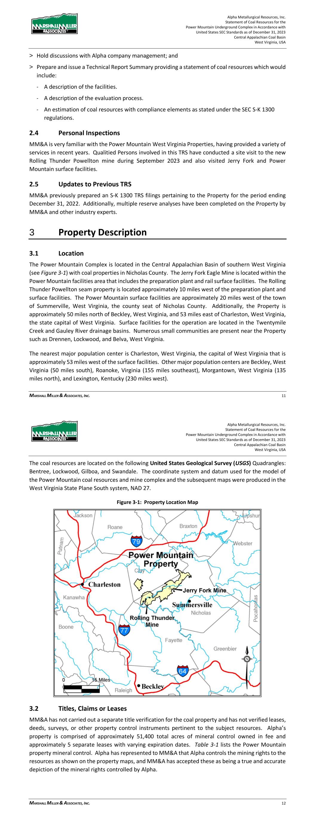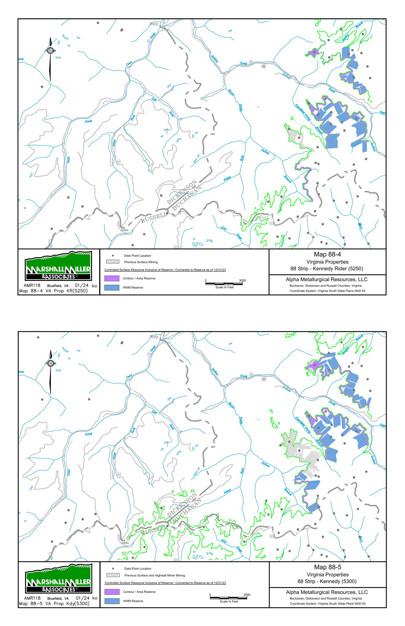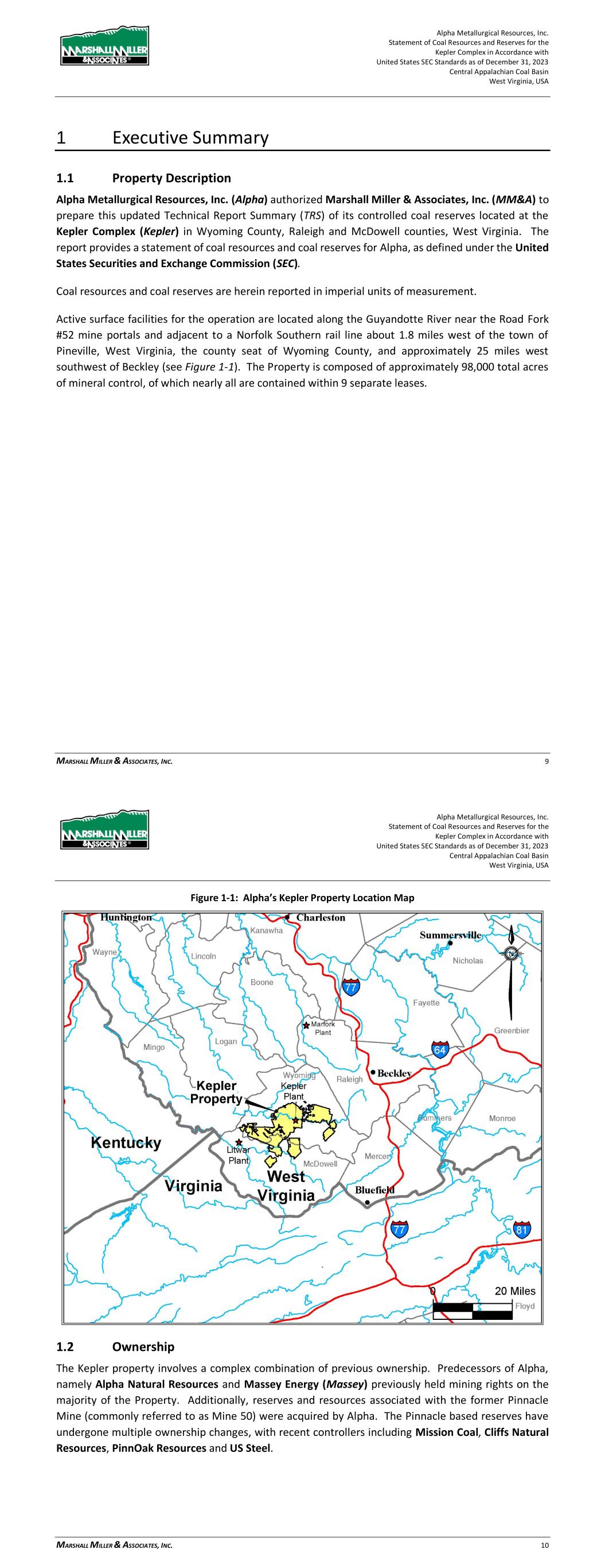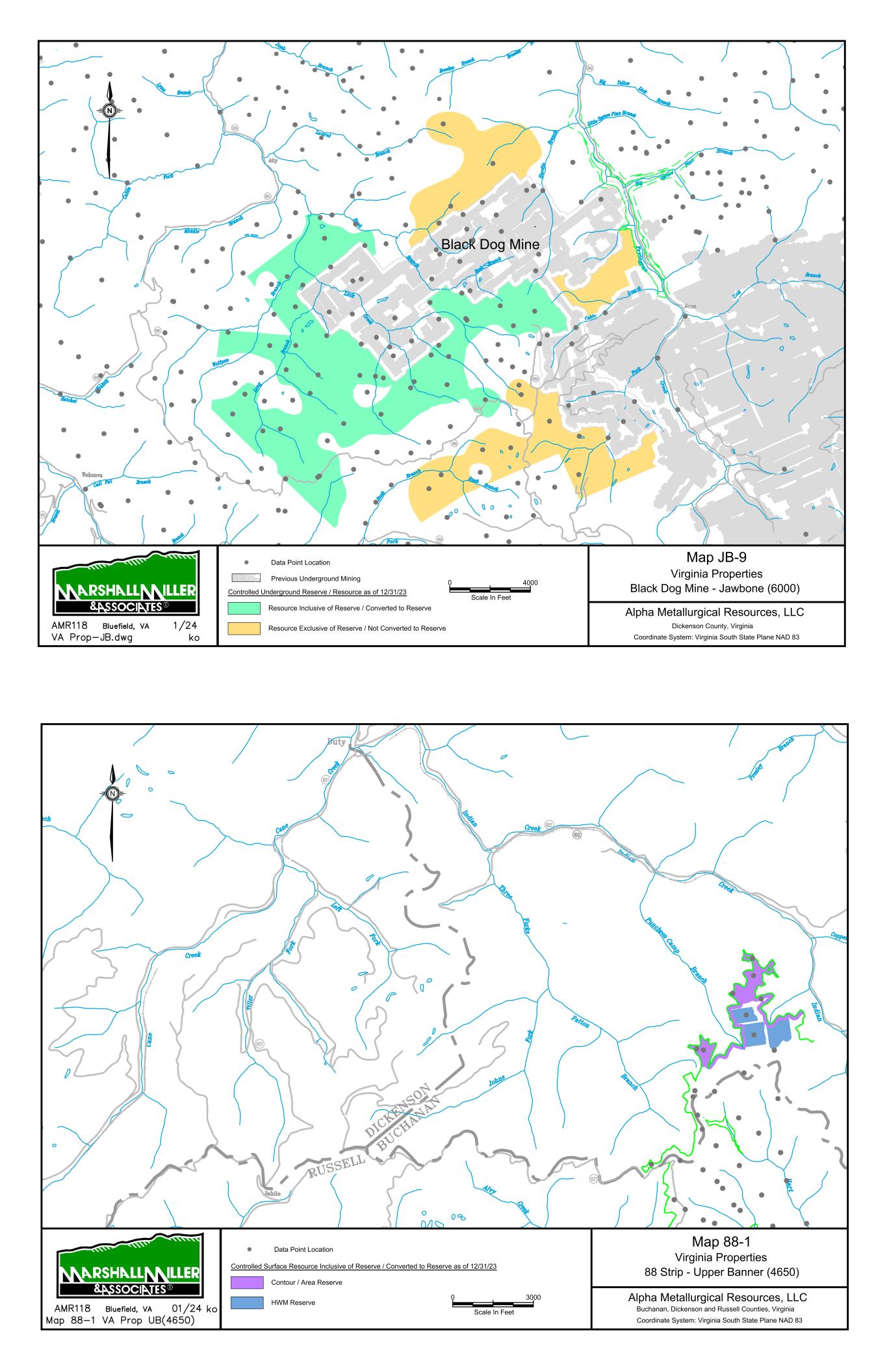 Alpha Metallurgical Resources, Inc. Statement of Coal Resources for the Power Mountain Underground Complex in Accordance with United States SEC Standards as of December 31, 2023 Central Appalachian Coal Basin West Virginia, USA MARSHALL MILLER & ASSOCIATES, INC. 11 > Hold discussions with Alpha company management; and > Prepare and issue a Technical Report Summary providing a statement of coal resources which would include: - A description of the facilities. - A description of the evaluation process. - An estimation of coal resources with compliance elements as stated under the SEC S-K 1300 regulations. 2.4 Personal Inspections MM&A is very familiar with the Power Mountain West Virginia Properties, having provided a variety of services in recent years. Qualitied Persons involved in this TRS have conducted a site visit to the new Rolling Thunder Powellton mine during September 2023 and also visited Jerry Fork and Power Mountain surface facilities. 2.5 Updates to Previous TRS MM&A previously prepared an S-K 1300 TRS filings pertaining to the Property for the period ending December 31, 2022. Additionally, multiple reserve analyses have been completed on the Property by MM&A and other industry experts. 3 Property Description 3.1 Location The Power Mountain Complex is located in the Central Appalachian Basin of southern West Virginia (see Figure 3-1) with coal properties in Nicholas County. The Jerry Fork Eagle Mine is located within the Power Mountain facilities area that includes the preparation plant and rail surface facilities. The Rolling Thunder Powellton seam property is located approximately 10 miles west of the preparation plant and surface facilities. The Power Mountain surface facilities are approximately 20 miles west of the town of Summerville, West Virginia, the county seat of Nicholas County. Additionally, the Property is approximately 50 miles north of Beckley, West Virginia, and 53 miles east of Charleston, West Virginia, the state capital of West Virginia. Surface facilities for the operation are located in the Twentymile Creek and Gauley River drainage basins. Numerous small communities are present near the Property such as Drennen, Lockwood, and Belva, West Virginia. The nearest major population center is Charleston, West Virginia, the capital of West Virginia that is approximately 53 miles west of the surface facilities. Other major population centers are Beckley, West Virginia (50 miles south), Roanoke, Virginia (155 miles southeast), Morgantown, West Virginia (135 miles north), and Lexington, Kentucky (230 miles west). Alpha Metallurgical Resources, Inc. Statement of Coal Resources for the Power Mountain Underground Complex in Accordance with United States SEC Standards as of December 31, 2023 Central Appalachian Coal Basin West Virginia, USA MARSHALL MILLER & ASSOCIATES, INC. 12 The coal resources are located on the following United States Geological Survey (USGS) Quadrangles: Bentree, Lockwood, Gilboa, and Swandale. The coordinate system and datum used for the model of the Power Mountain coal resources and mine complex and the subsequent maps were produced in the West Virginia State Plane South system, NAD 27. Figure 3-1: Property Location Map 3.2 Titles, Claims or Leases MM&A has not carried out a separate title verification for the coal property and has not verified leases, deeds, surveys, or other property control instruments pertinent to the subject resources. Alpha’s property is comprised of approximately 51,400 total acres of mineral control owned in fee and approximately 5 separate leases with varying expiration dates. Table 3-1 lists the Power Mountain property mineral control. Alpha has represented to MM&A that Alpha controls the mining rights to the resources as shown on the property maps, and MM&A has accepted these as being a true and accurate depiction of the mineral rights controlled by Alpha.
